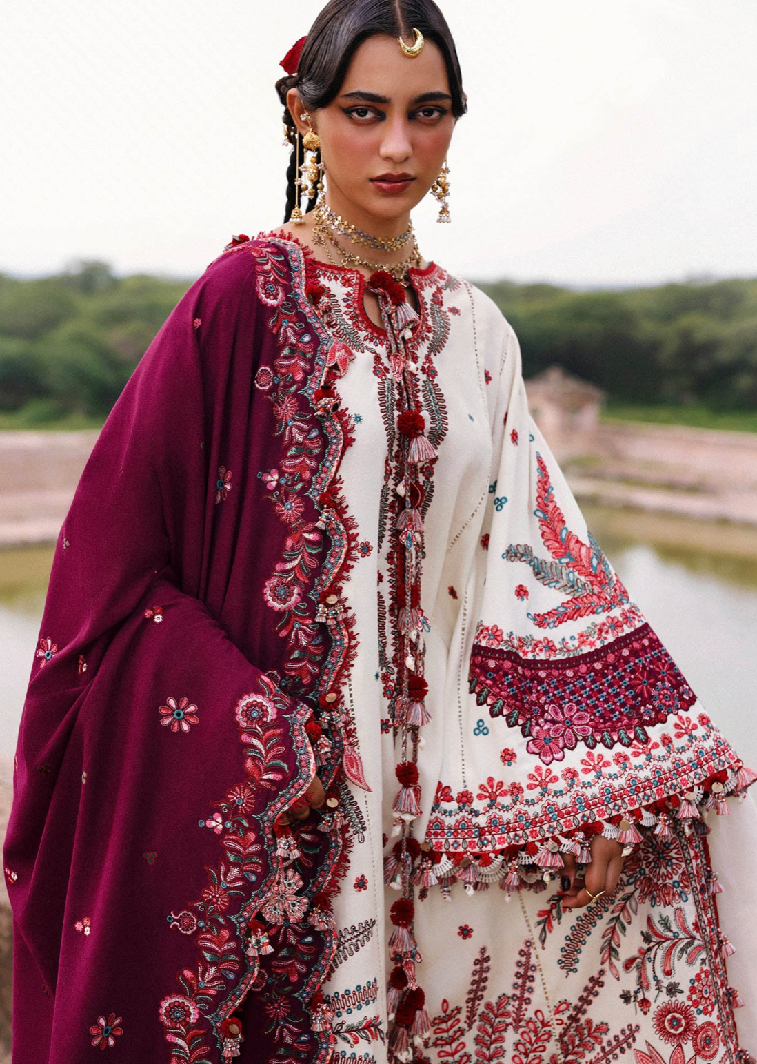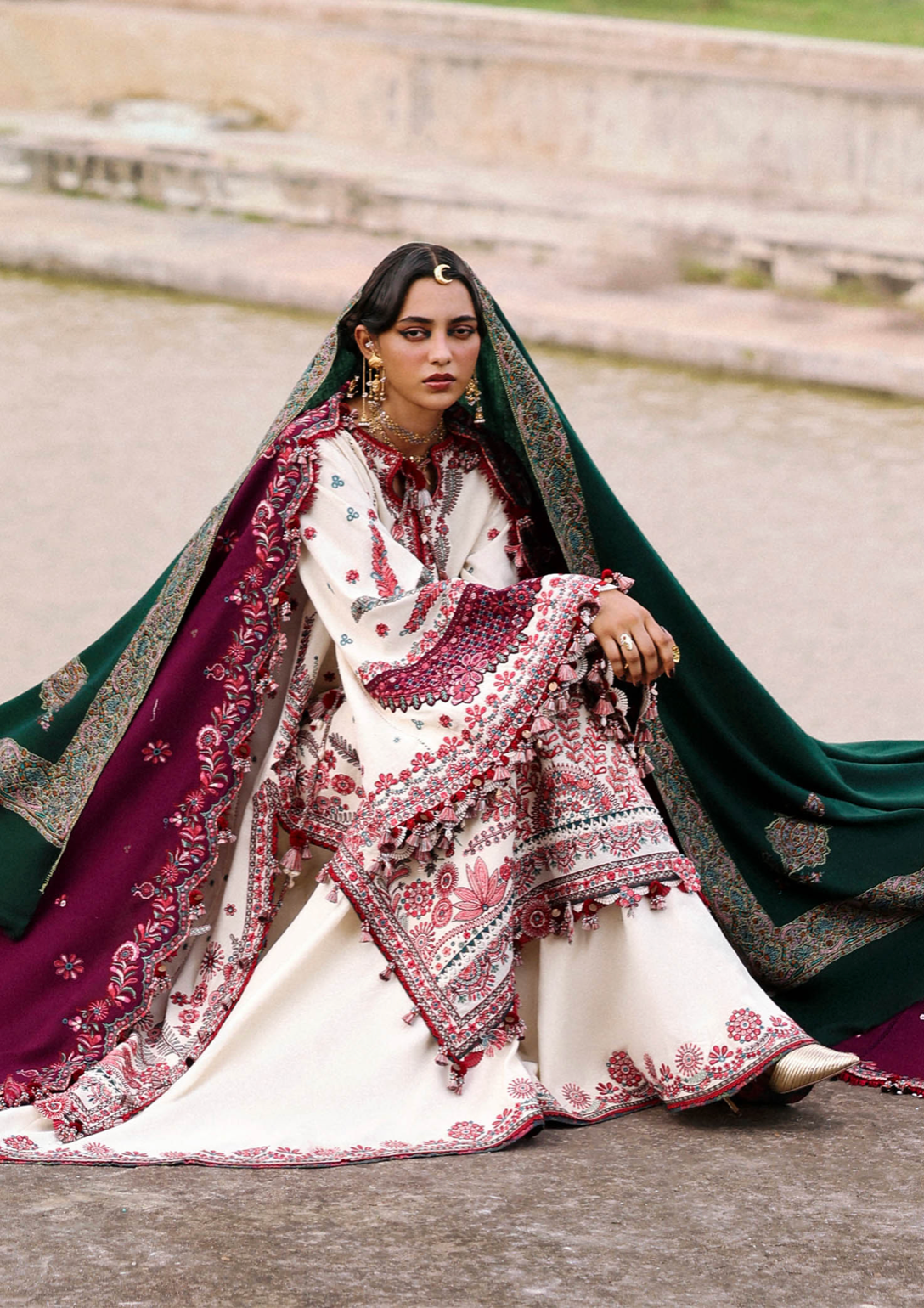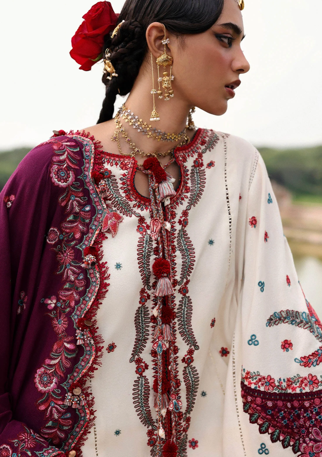 A vision of unblemished elegance, this unstitched ivory ensemble offers a refined take on the classic karandi silhouette. The shirt is beautifully elevated by intricate delicate embroidery and borring details. A striking contrast is achieved with the accompanying purple embroidered karandi shawl, which introduces a vibrant pop of color. The outfit is flawlessly completed with matching ivory trousers featuring tasteful embroidery accents, crafting a look designed to inspire effortless and captivating grace.