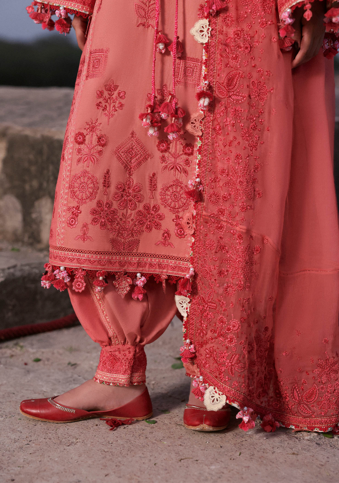 A vision of subtle sophistication, this unstitched ensemble presents a stunning two-toned pink design, elevating the classic karandi silhouette. The shirt features a light pink center panel beautifully contrasted by dark pink side panels, a theme mirrored in the dual-toned sleeves. This piece is exquisitely detailed with delicate embroidery. Complementing the outfit is a luxurious dark pink embroidered chiffon dupatta. The look is flawlessly completed by a two-toned pink shalwar enhanced with tasteful embroidery details, crafting a design that exudes effortless grace