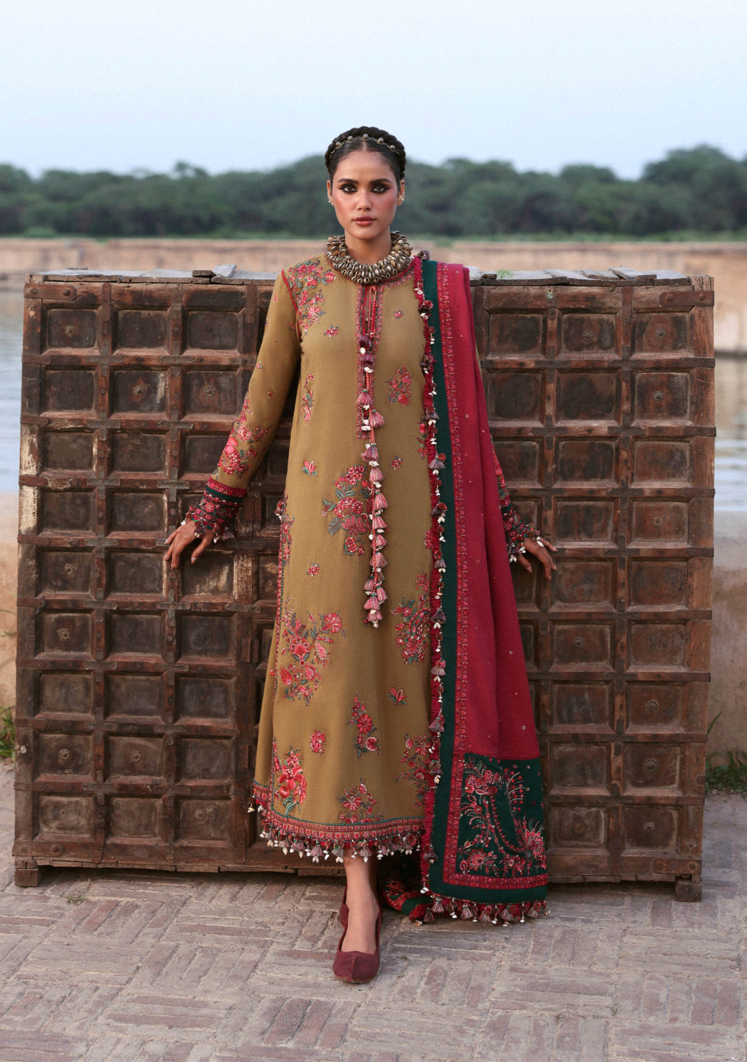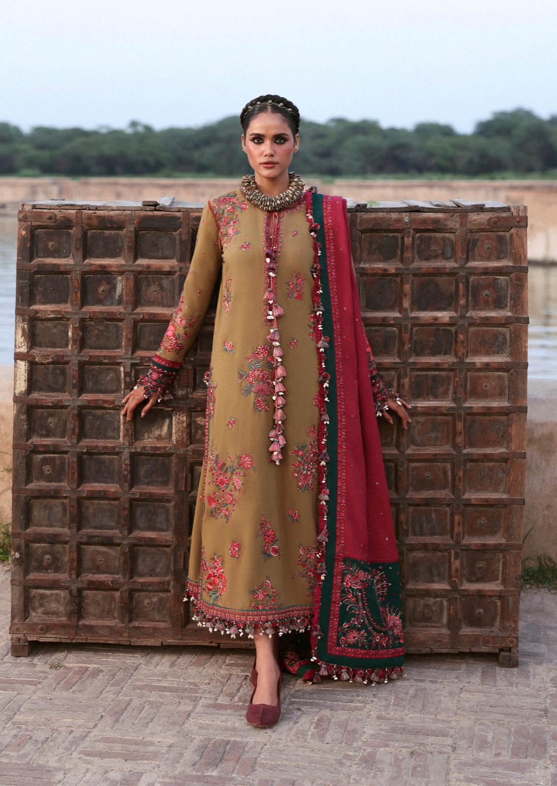 A vision of unstitched elegance, this swamp green ensemble masterfully elevates the classic karandi silhouette. The fabric is lavishly detailed with an assortment of delicate, intricate embroidery stitches. A captivating contrast is achieved with the accompanying rouge pink embroidered karandi shawl, which features a distinct forest green embroidery border patch. The outfit is completed by matching swamp green trousers enhanced with tasteful embroidery accents, crafting a sophisticated look designed to inspire effortless grace.
