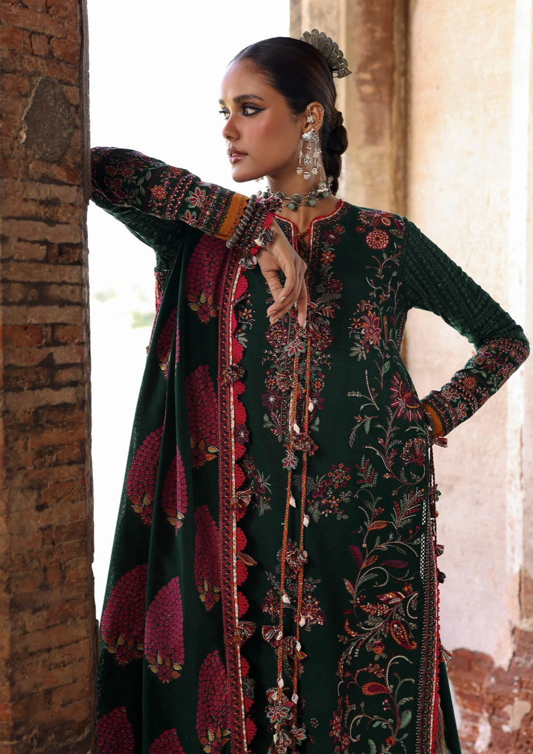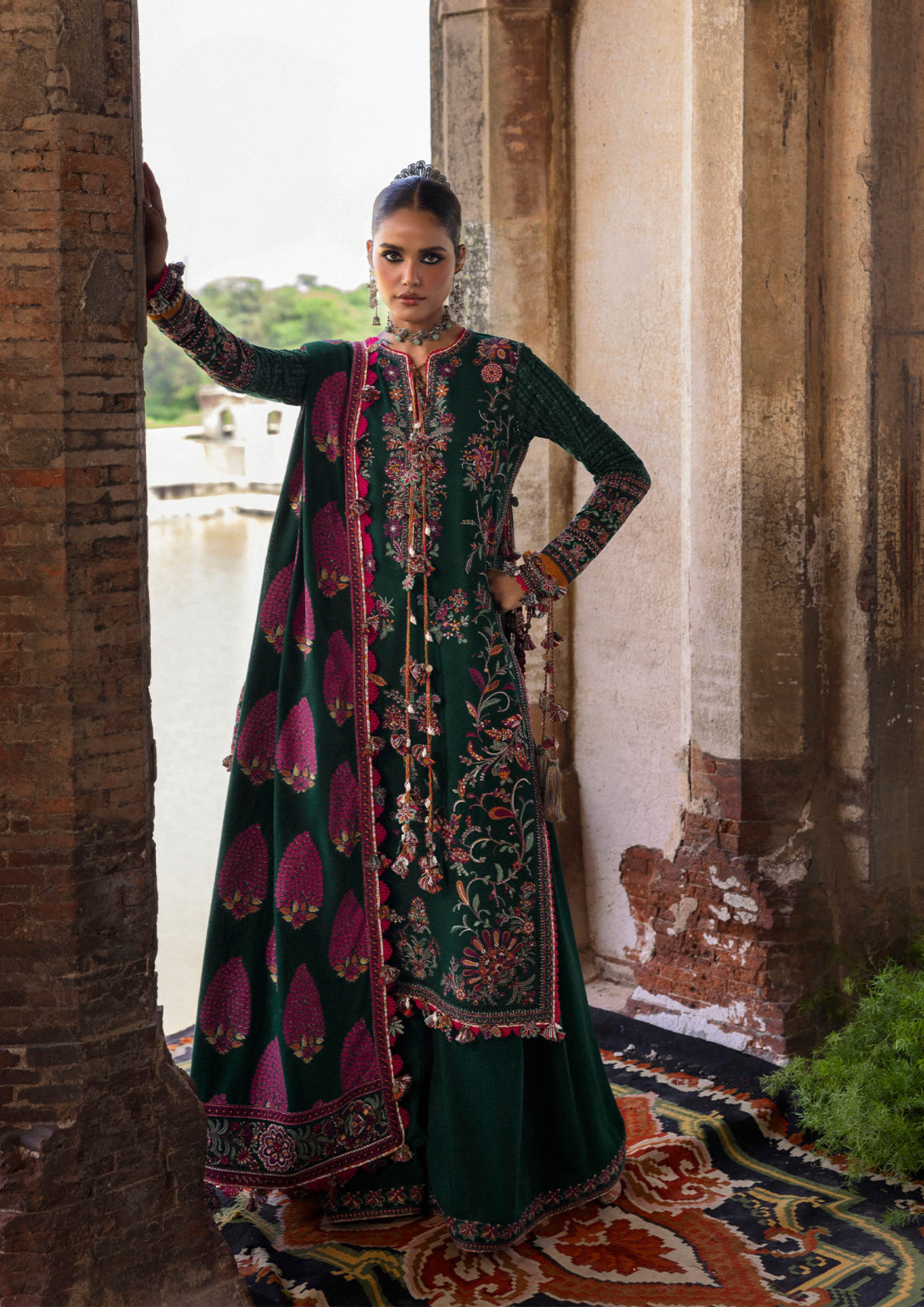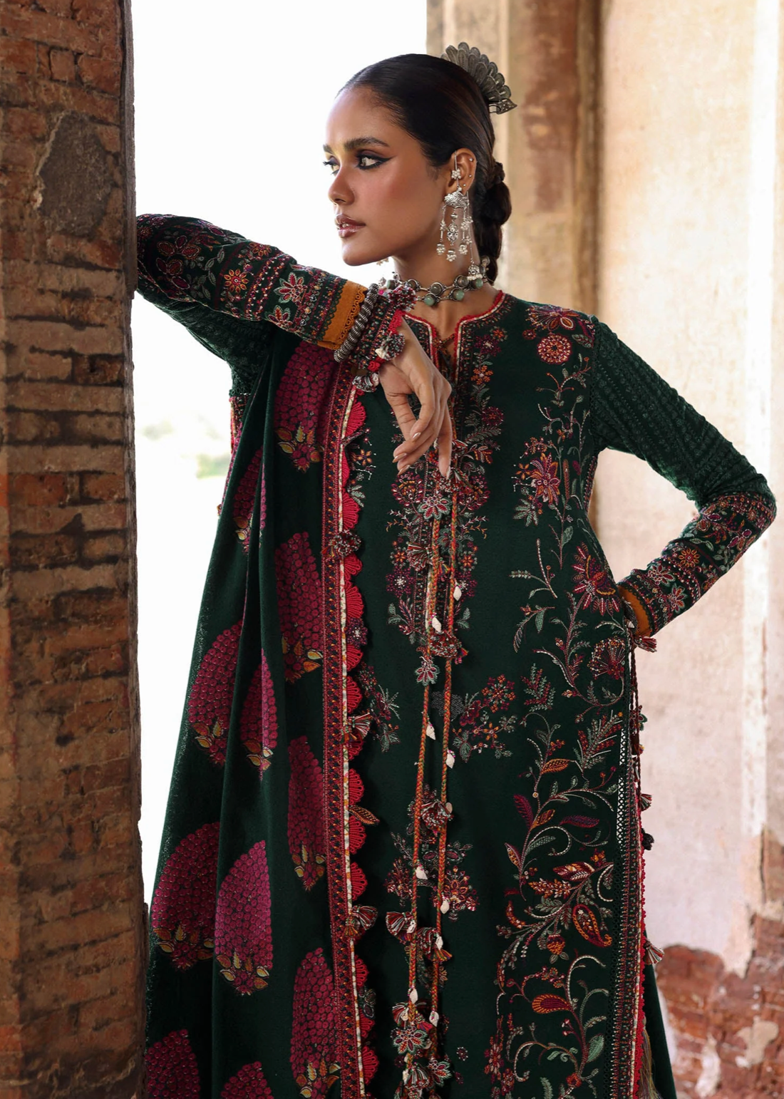 A vision of unadulterated elegance, this unstitched green ensemble elevates the classic karandi silhouette. The shirt is tastefully embellished with delicate embroidery details, giving it a sophisticated texture. Complementing this is the matching green karandi shawl, which features an artful screen-printed design alongside a sophisticated forest embroidery border patch. The look is flawlessly completed with coordinating trousers enhanced with graceful embroidery accents, crafting a design that commands attention with effortless grace.