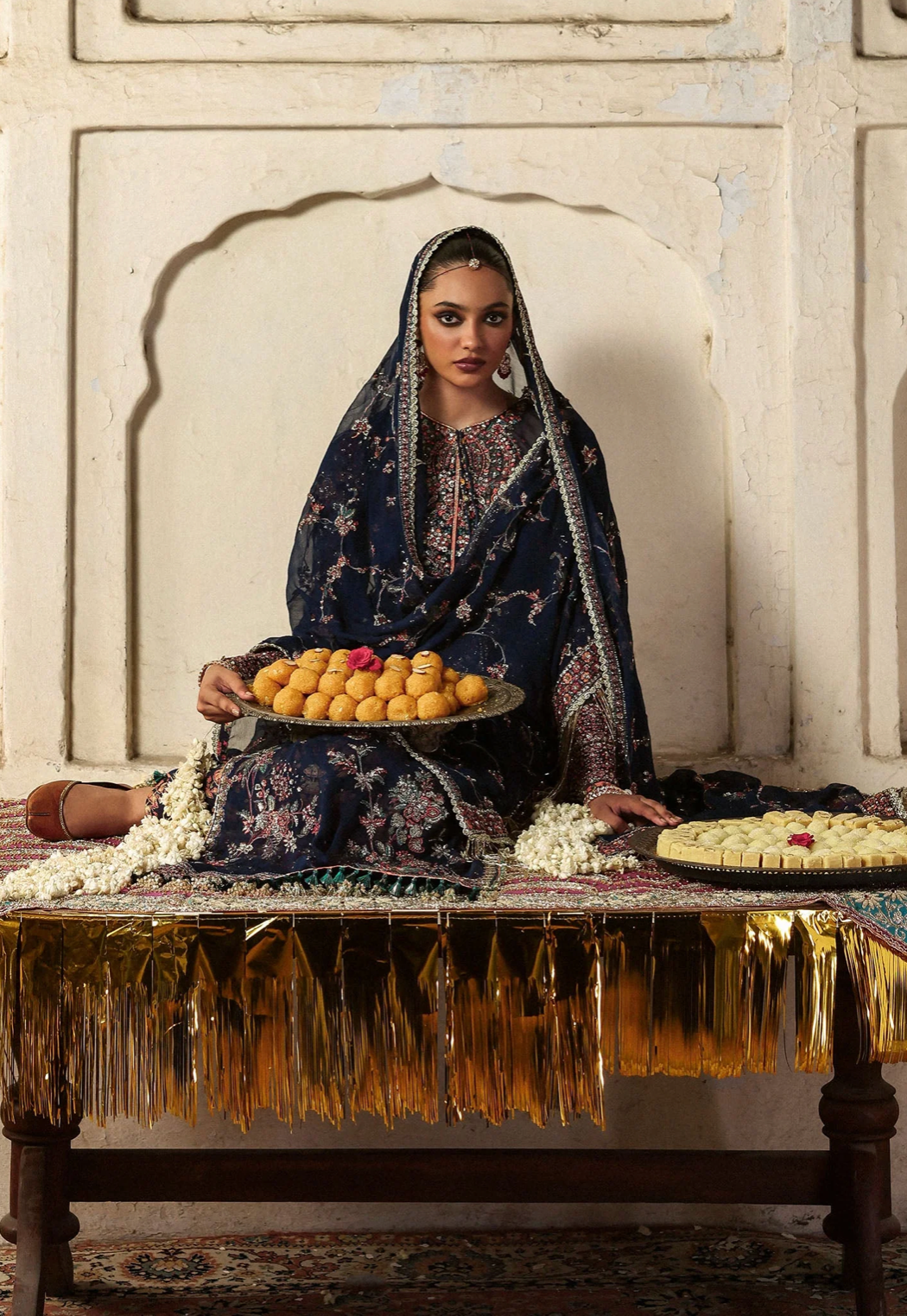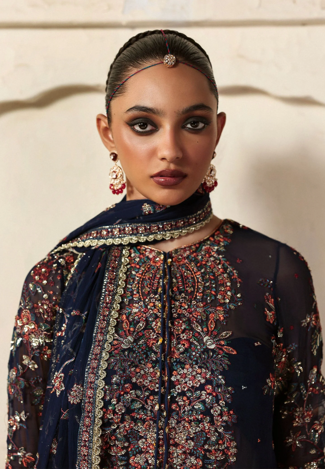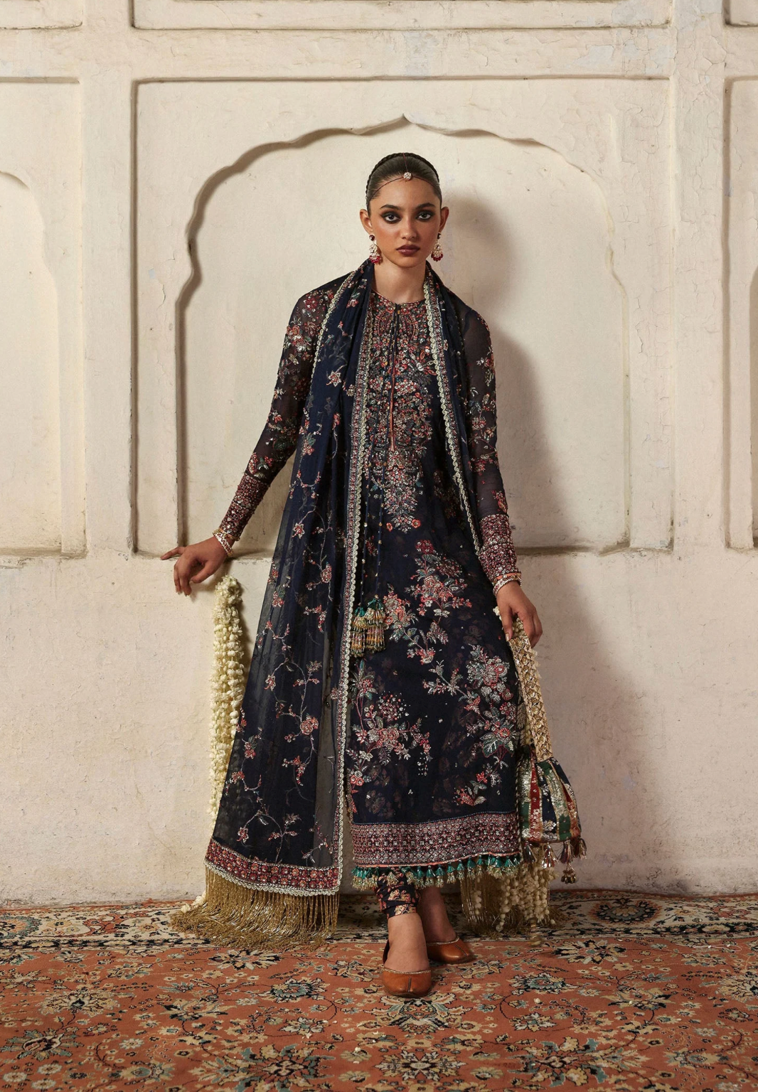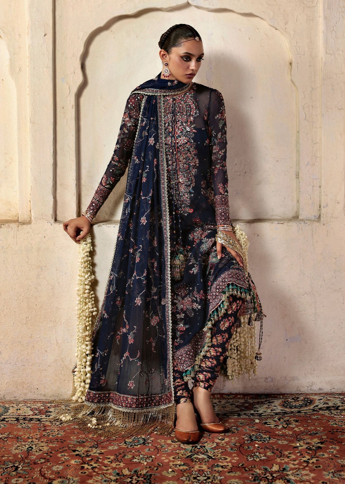 This blue chiffon shirt is adorned with a long embroidered neckline and fully embroidered front daman borders that bring depth to the design. It is paired with a Korean raw silk churidar, creating a refined balance to the richly embroidered shirt. Completing the look is a chiffon embroidered dupatta with delicate embroidery and four-sided borders and embroidered floral jaal with multicolors. This outfit offers a timeless charm with modern elegance, making it suitable for both festive and formal gatherings.