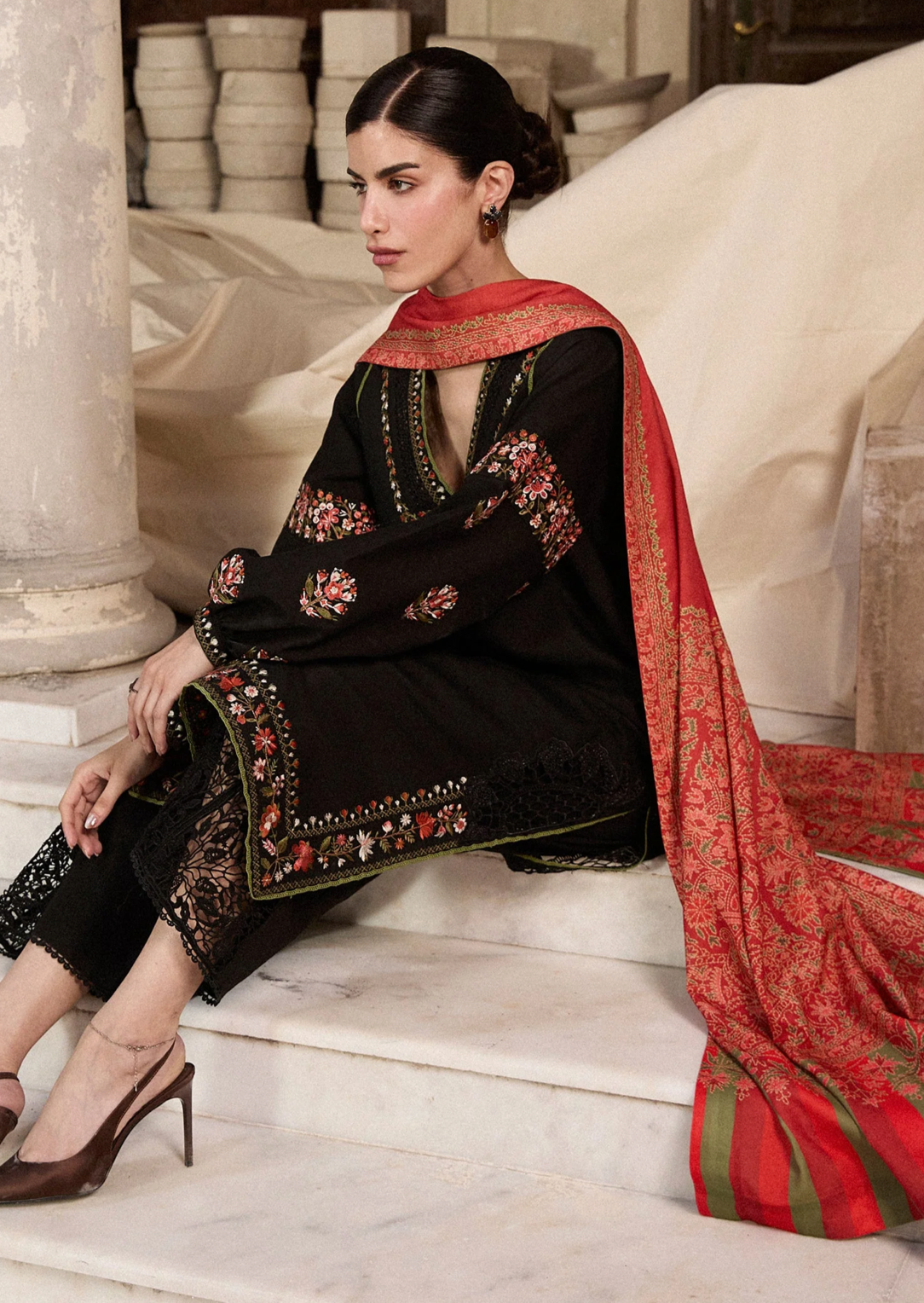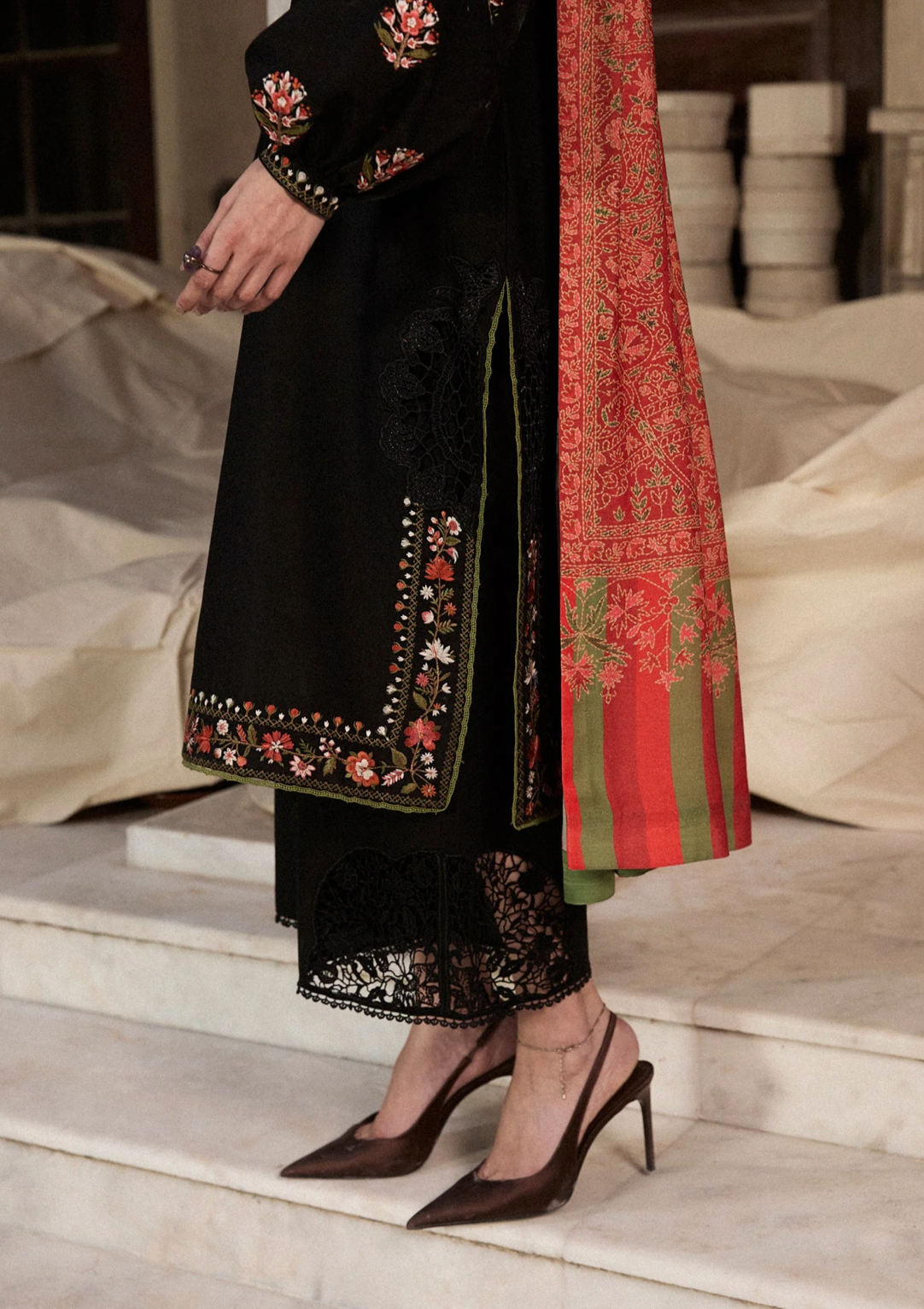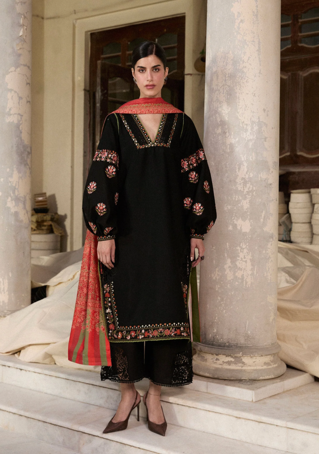 A black khaddar shirt, exquisitely embroidered with a vibrant, multi-colored pattern and delicate lace detailing. The side slits and neckline feature intricate cutwork embroidery in the base black color. It boasts elegant balloon sleeves, also adorned with embroidery. The outfit is paired with matching culottes, featuring complementary cutwork embroidery and lace details. To complete the ensemble, a contrasting printed shawl is included.