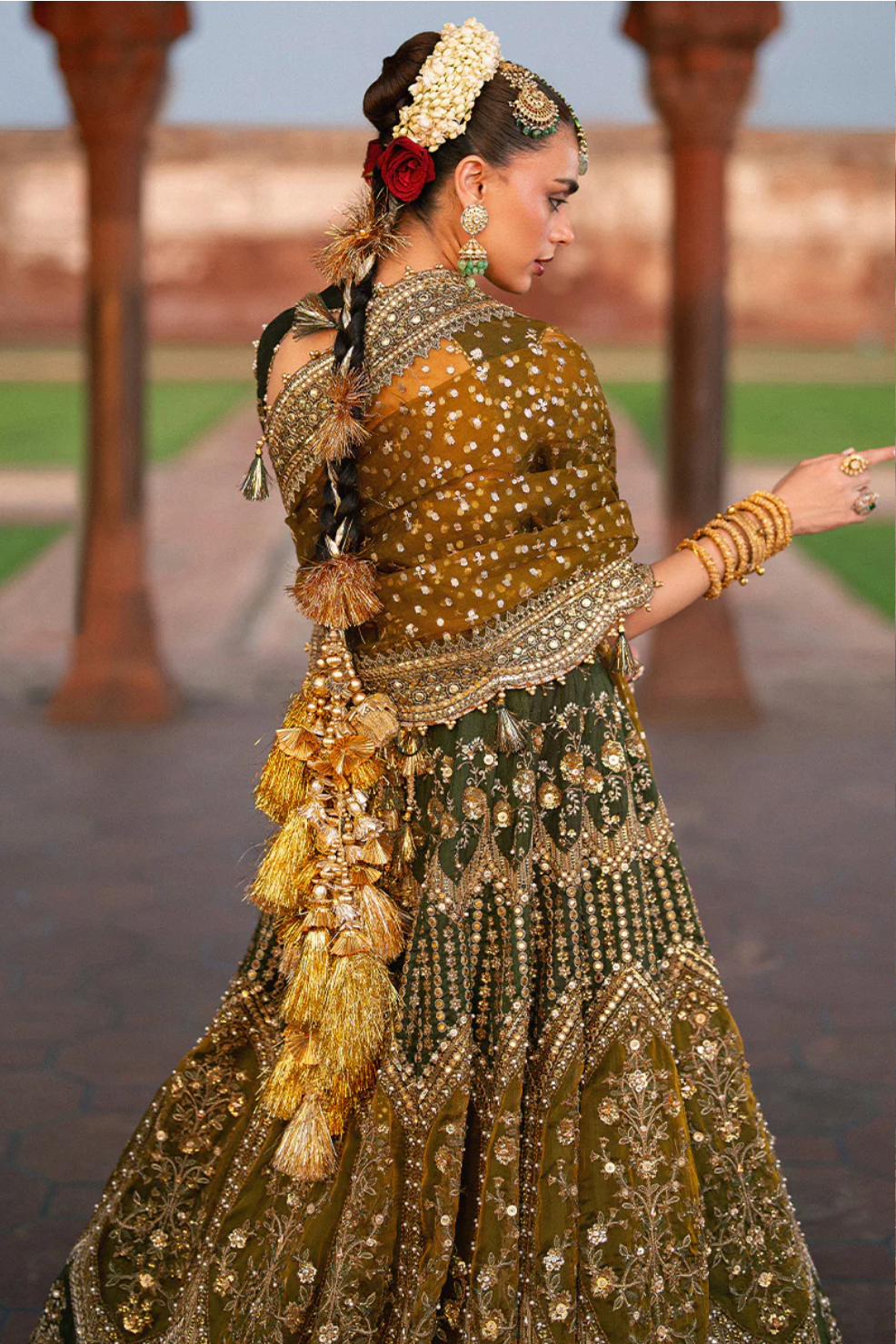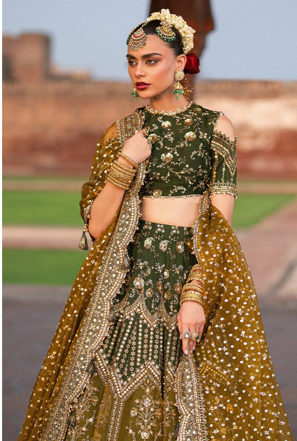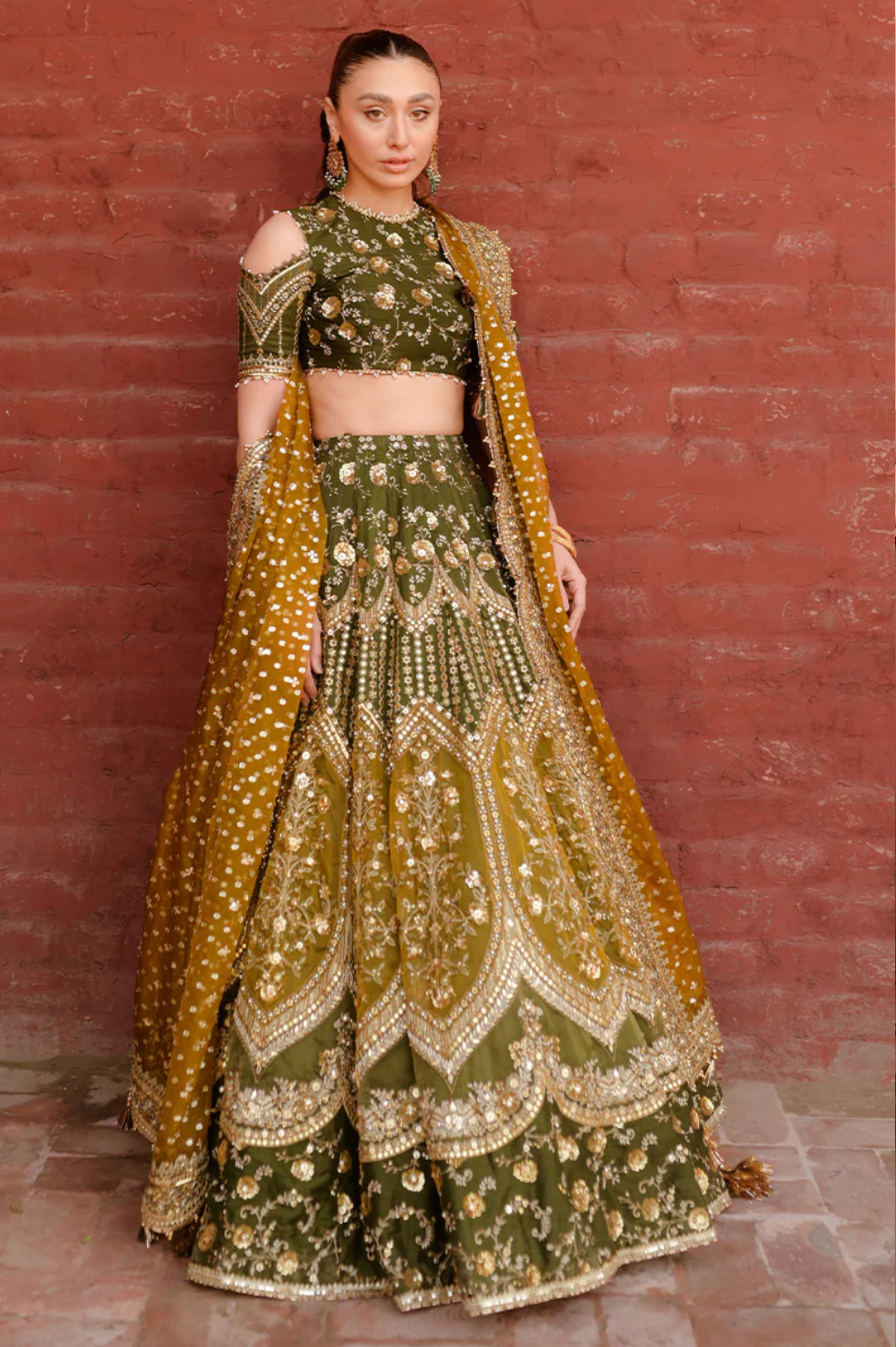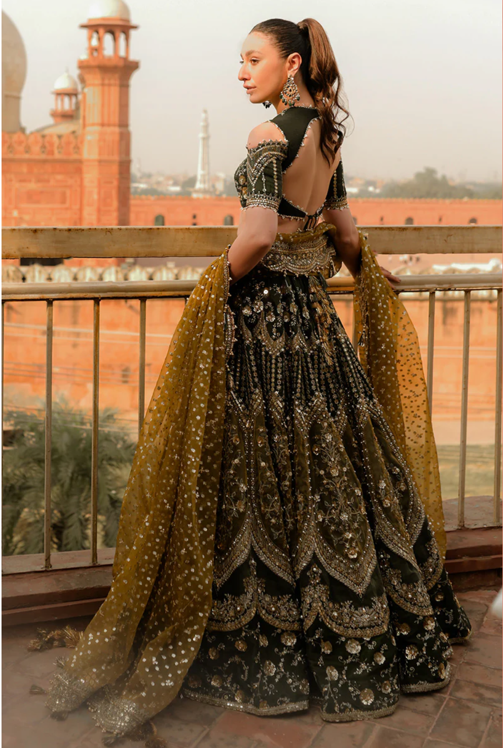 Crafted from luxurious Indian silk, this exquisite ensemble showcases intricate patchwork adorned with delicate sequins, pani, and tilla embroidery. The artistry reflects timeless craftsmanship and refined elegance. Paired with a beautifully scalloped border dupatta, this creation exudes regal allure and graceful sophistication — a true statement of opulence and tradition.