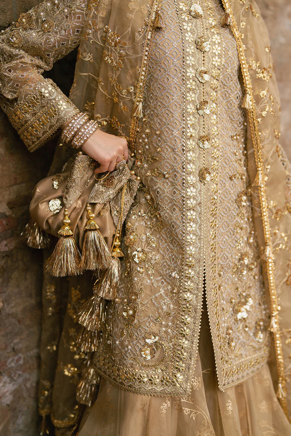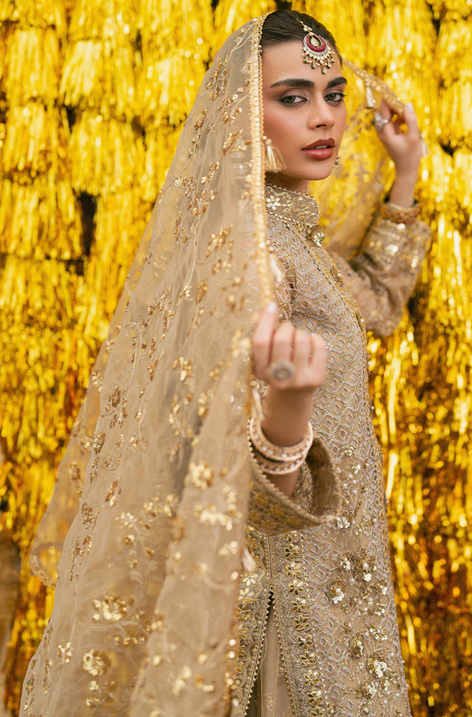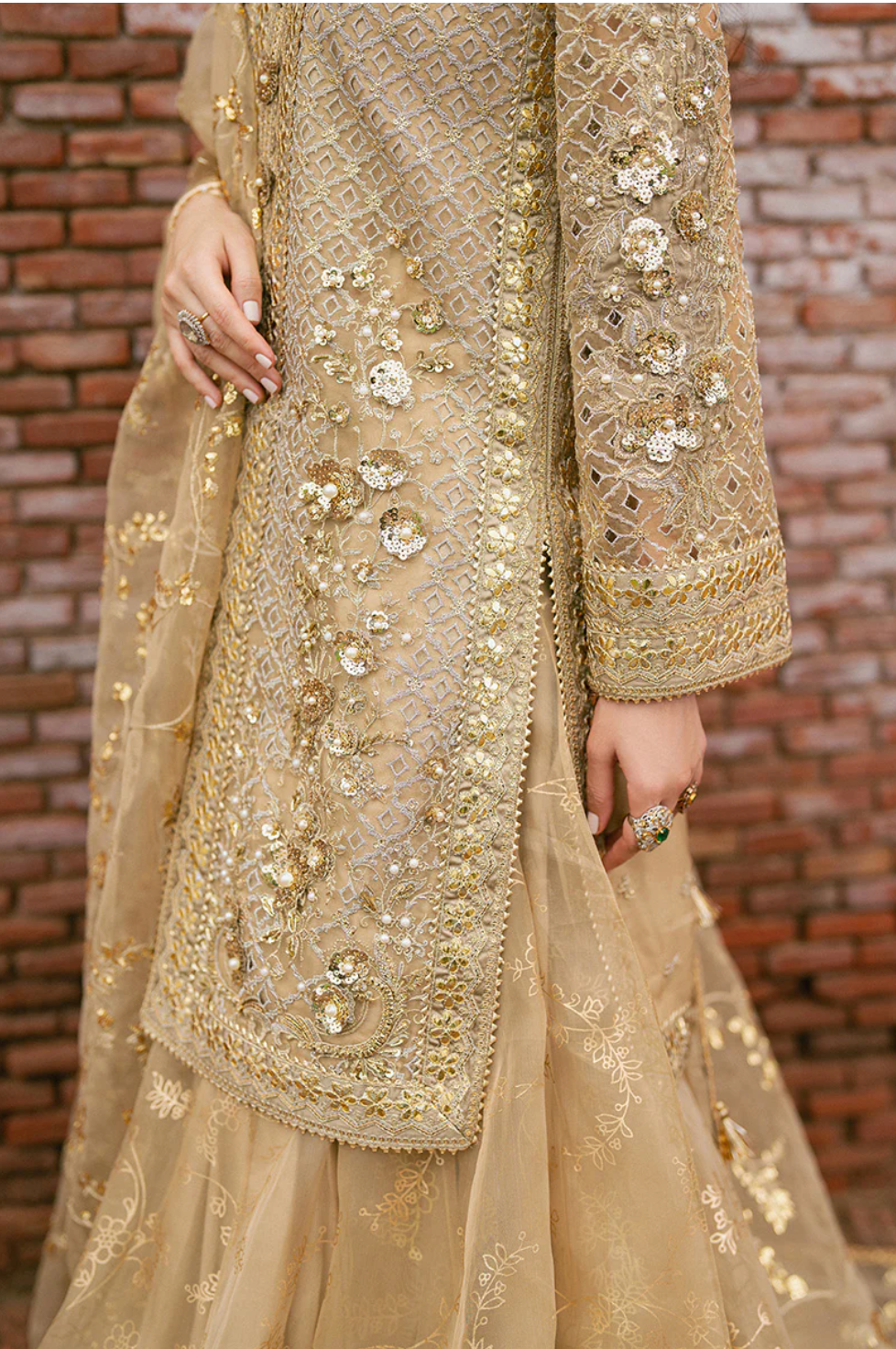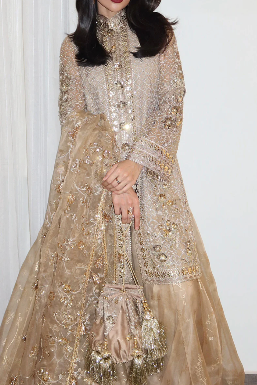 A stunning skin-toned jacket, exquisitely adorned with intricate embroidered jaal and delicate 3D floral motifs, finished with a shimmering pani border for a subtle touch of glamour. It is paired with a beautifully screen-printed organza sharara featuring a pani border, and a sequin sitara–embellished dupatta blooming with soft florals. Together, the ensemble radiates ethereal grace and modern regal allure.