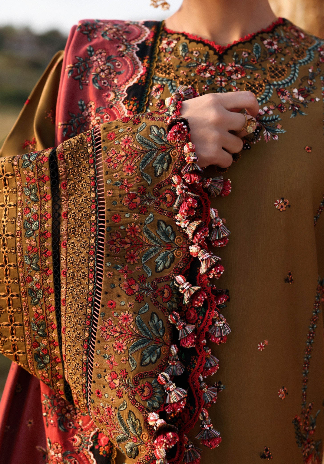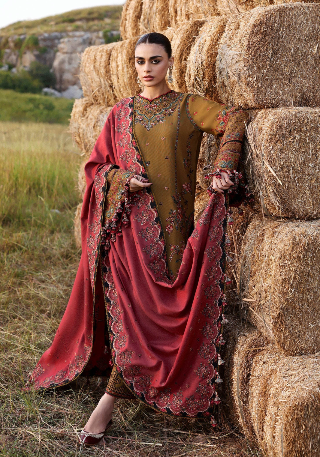 Embrace heritage with this long olive khaddar ensemble, beautifully adorned with a traditional colorful embroidered neckline, composed hem, and delicate spray across the front. The sleeves and hem feature finely embroidered borders, paired effortlessly with stylized embroidered culottes. Completing the look is a contrasting carrot red wool shawl, accentuated with scalloped traditional borders and boti spray — a perfect fusion of warmth, culture, and t imeless elegance.