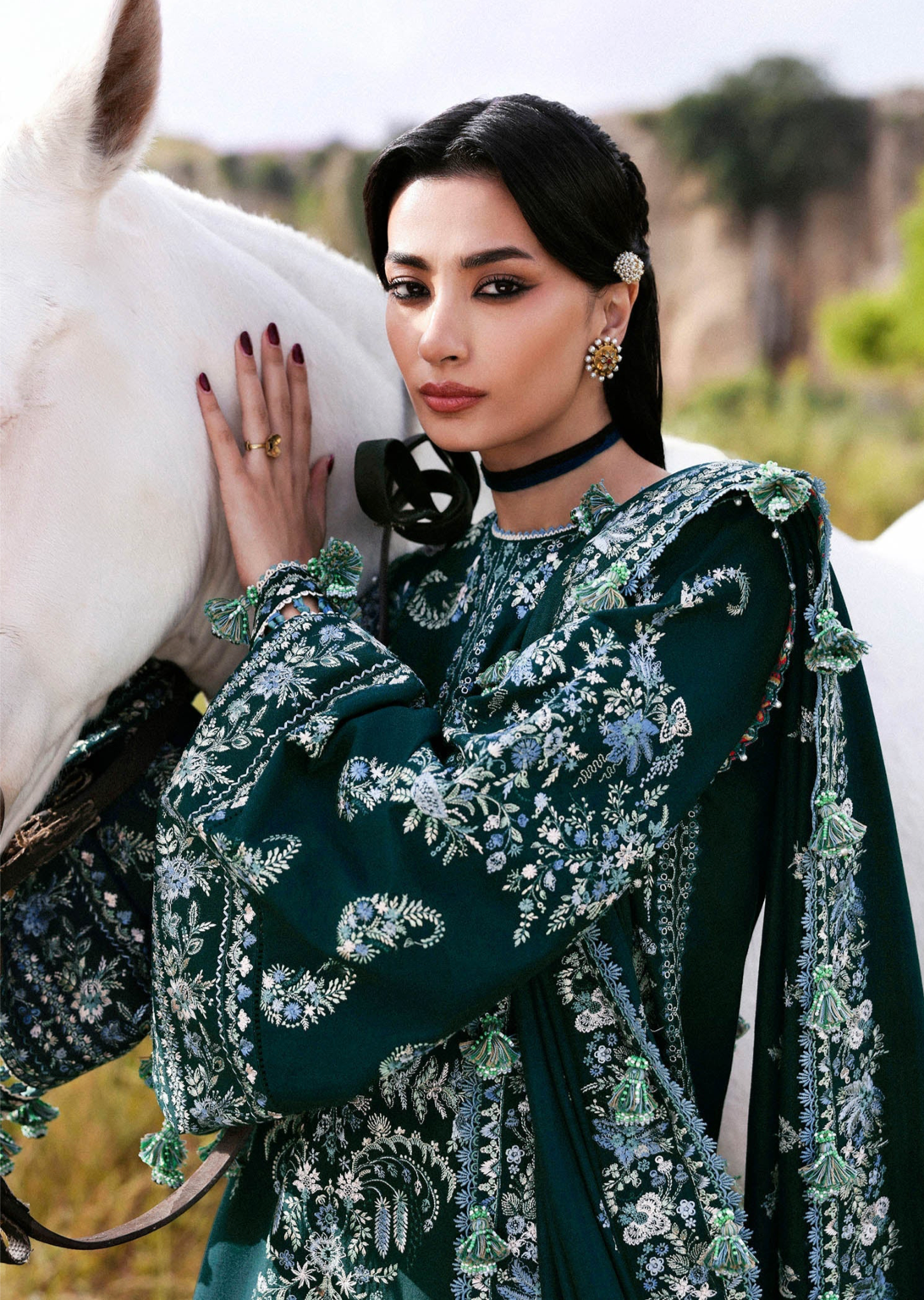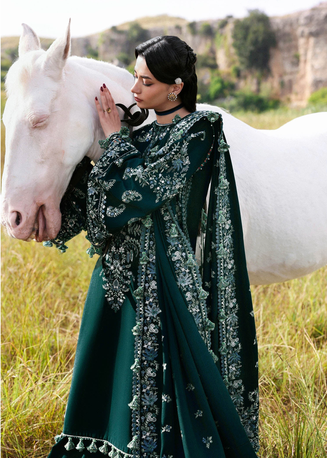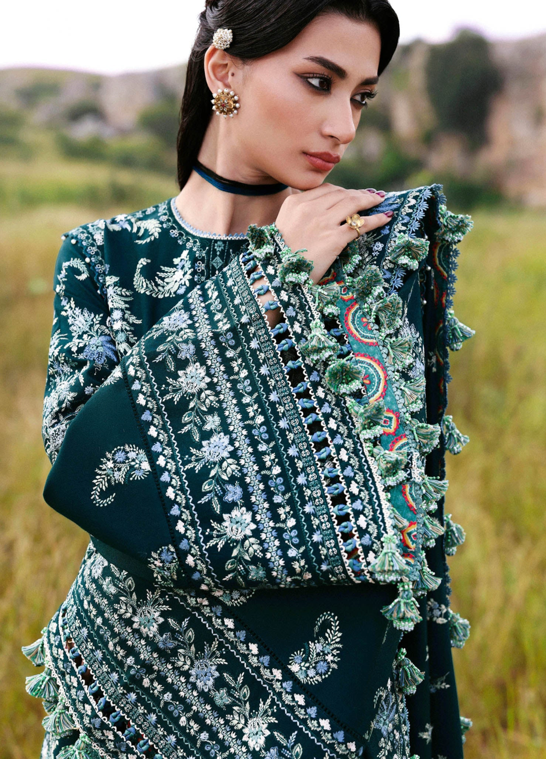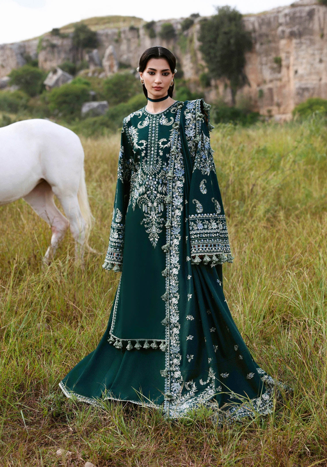 A long teal khaddar shirt featuring Kashmiri-inspired paisley embroidery on the upper body, finished with delicate embroidered borders at the slit and hem. The look is elevated with heavily embroidered traditional sleeves in monotone hues, paired with border-finished culottes and a matching wool shawl adorned with foursided embroidery, center spray, and ornate pallu corners. A perfect harmony of heritage and elegance for the winter season.