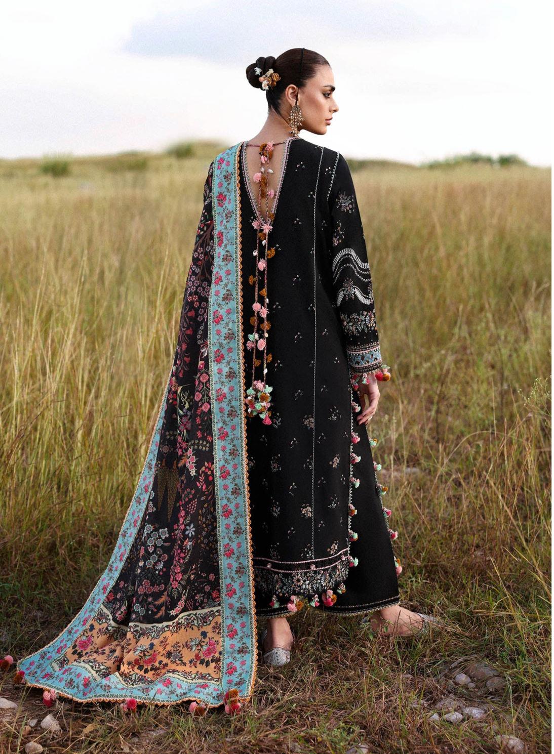 A striking statement of timeless grace — this long black pastel -toned embroidered shirt features rich composed panels adorned with intricate embroidery, enhanced with an exquisite white embroidered neckline and delicately bordered hem and sleeves. The look is beautifully finished with a heavy floral embroidered border and paired with matching border culottes. A vibrant wool printed shawl with a soft blue border and mustard composed pallu completes the ensemble, adding depth, color, and effortless sophistication.