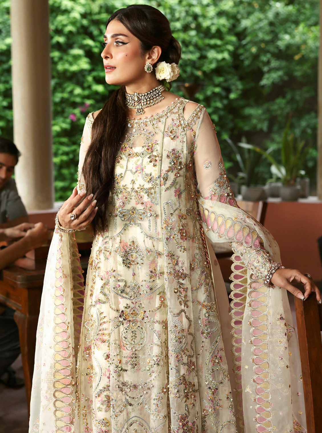 Radiating purity and sophistication, this ethereal ivory frost ensemble is a masterpiece of timeless grace. The shirt is designed with exaggerated hand-embellished organza panels and a cutwork neckline, elevated by intricate embroidery and ornate borders that speak of refined artistry. A delicately embroidered dupatta, adorned with laser-cut details and pallu accents, flows with understated elegance. Paired with a digitally printed trouser and inner, the ensemble combines modern precision with traditional craftsmanship. Finishing touches of colli sequin spray and intricate adda work add subtle radiance, making this look a true celebration of elegance and charm.