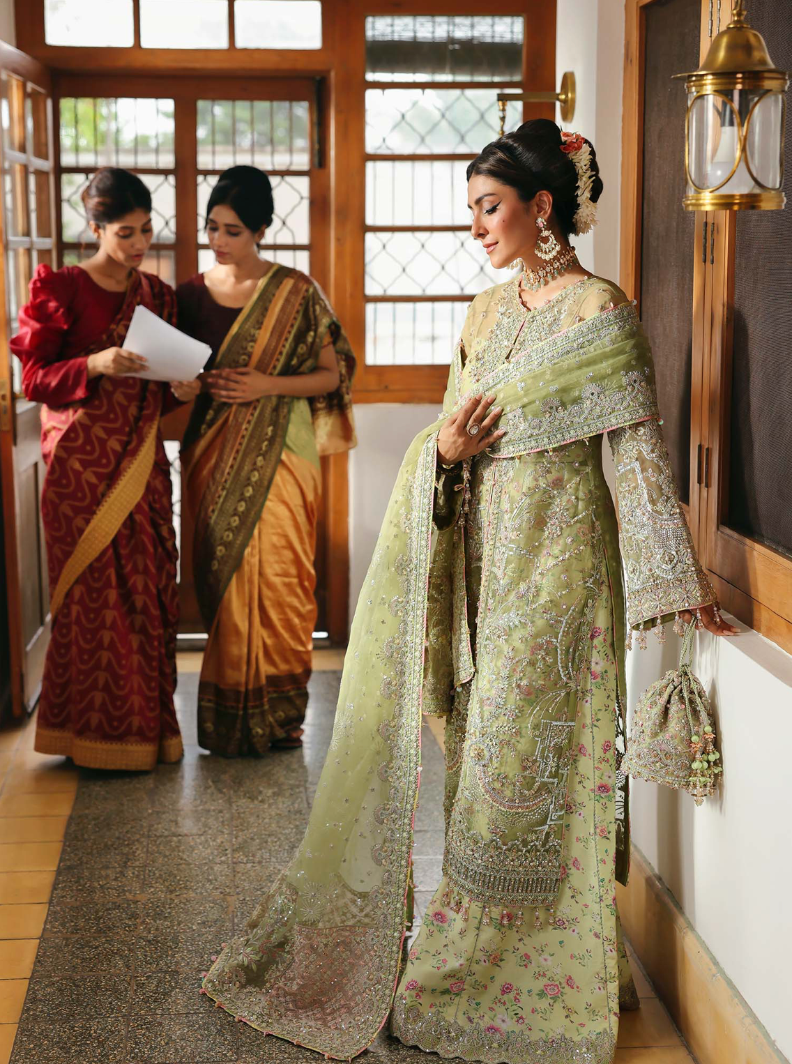 A vibrant parrot jade masterpiece that embodies festive sophistication. This ensemble features delicately hand-embellished organza panels with intricate embroidery, complemented by meticulously embroidered borders. The flowing dupatta is finished with contrasting laser-cut pallus, adding modern artistry to traditional elegance. A screen-printed inner and printed trouser complete the look, ensuring comfort and detail from every angle. Subtle sequin spray and adda work elevate the outfit with a touch of shimmer, creating the perfect harmony of festivity and grace.