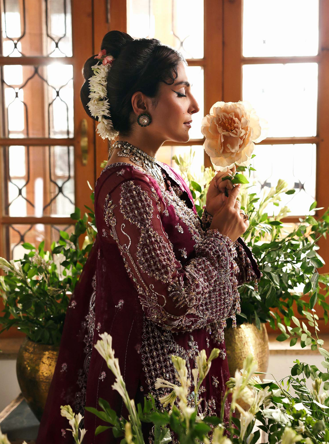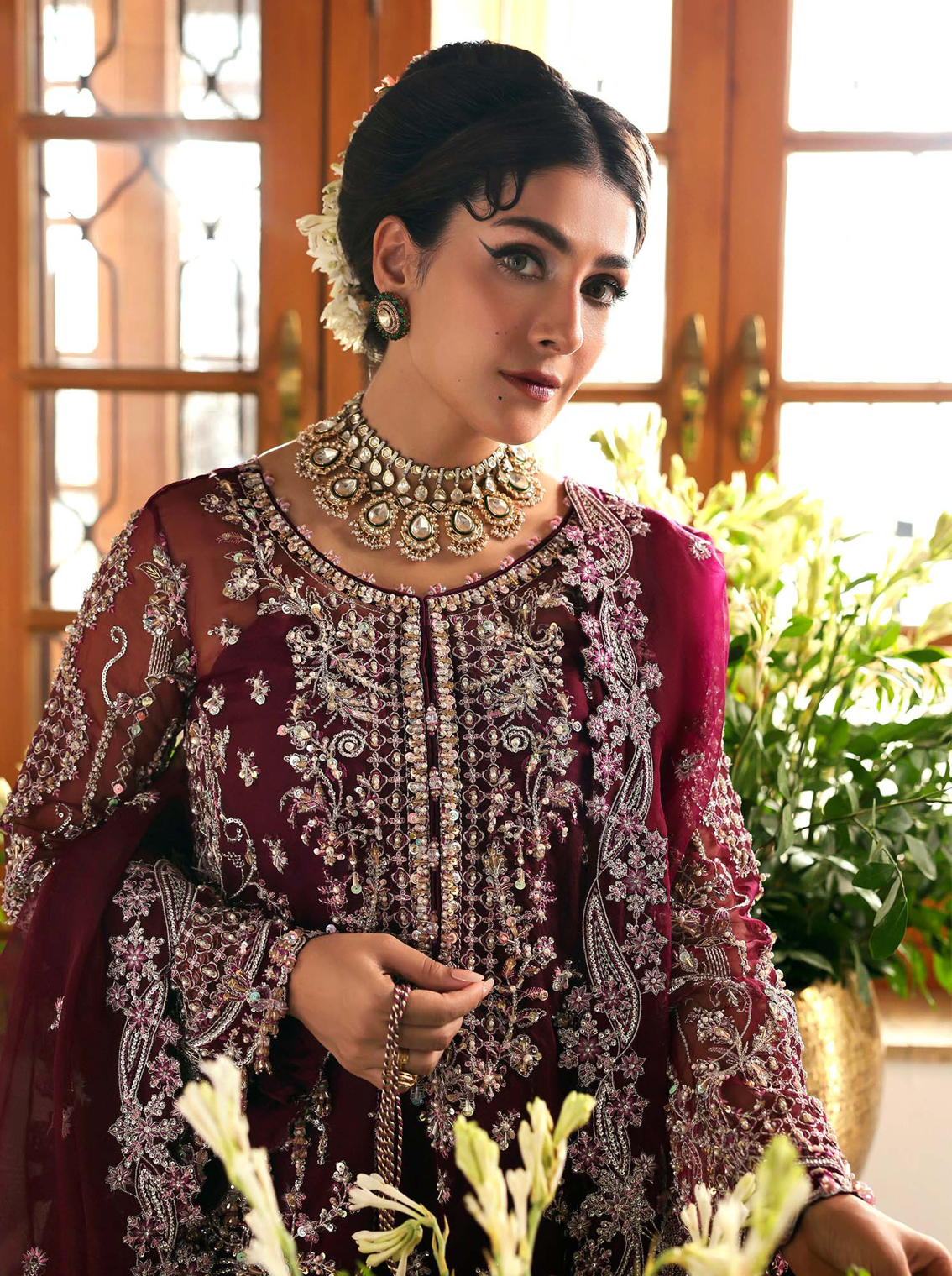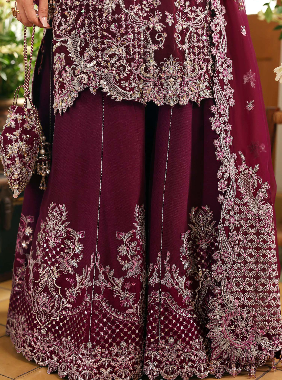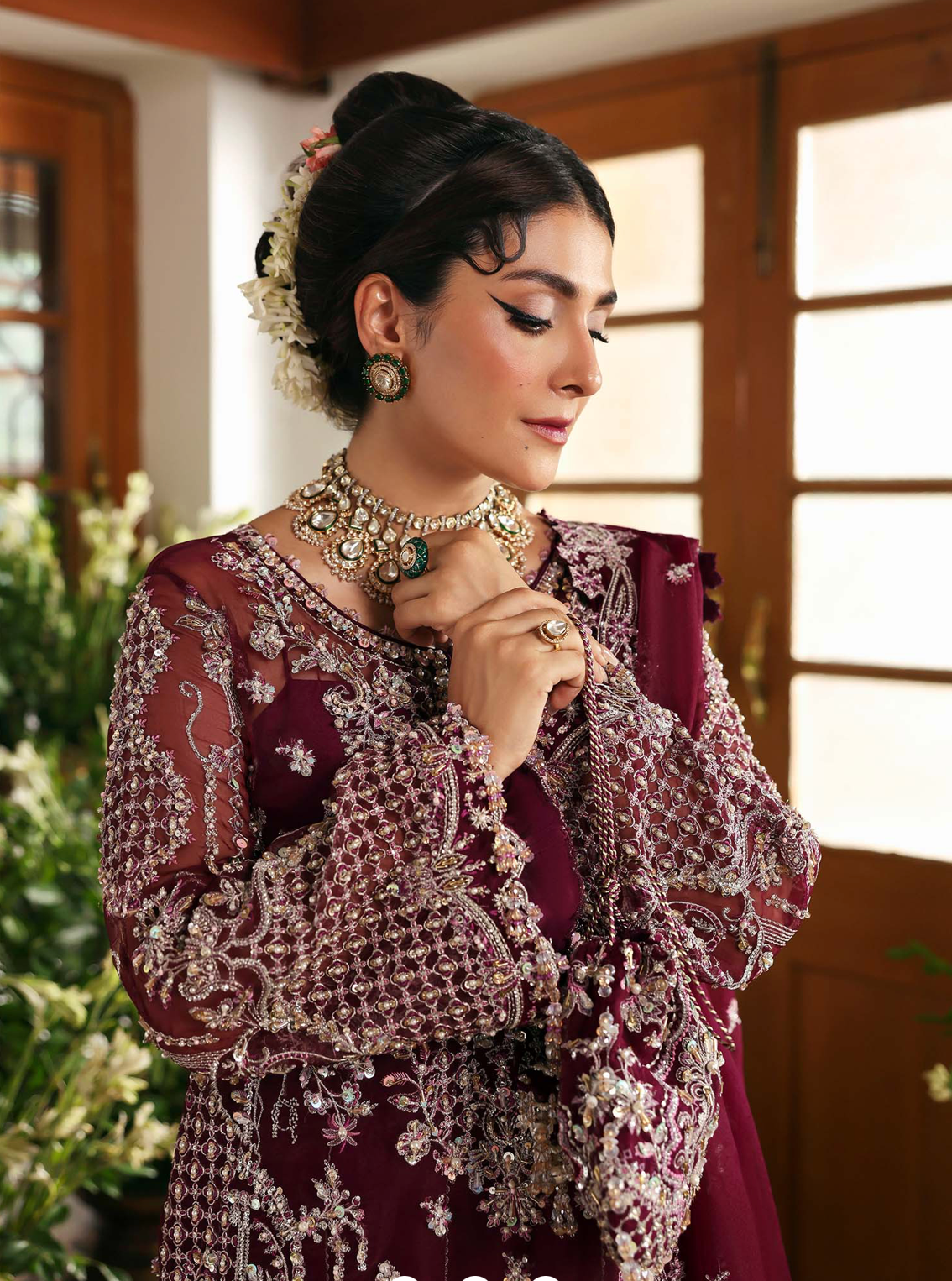 Step into timeless elegance with this regal imperial plum ensemble, a vision of grandeur and artistry. The look is brought to life with hand-embellished organza panels and intricate embroidery, framed by ornate borders that exude opulence. The embroidered dupatta, adorned with laser-cut patches, drapes effortlessly, offering a balance of sophistication and modern finesse. A fully embroidered trouser and coordinated inner add depth and richness to the design. Finished with subtle sequin spray and exquisite adda work, this ensemble is elegance redefined — perfect for celebrating in majestic style.