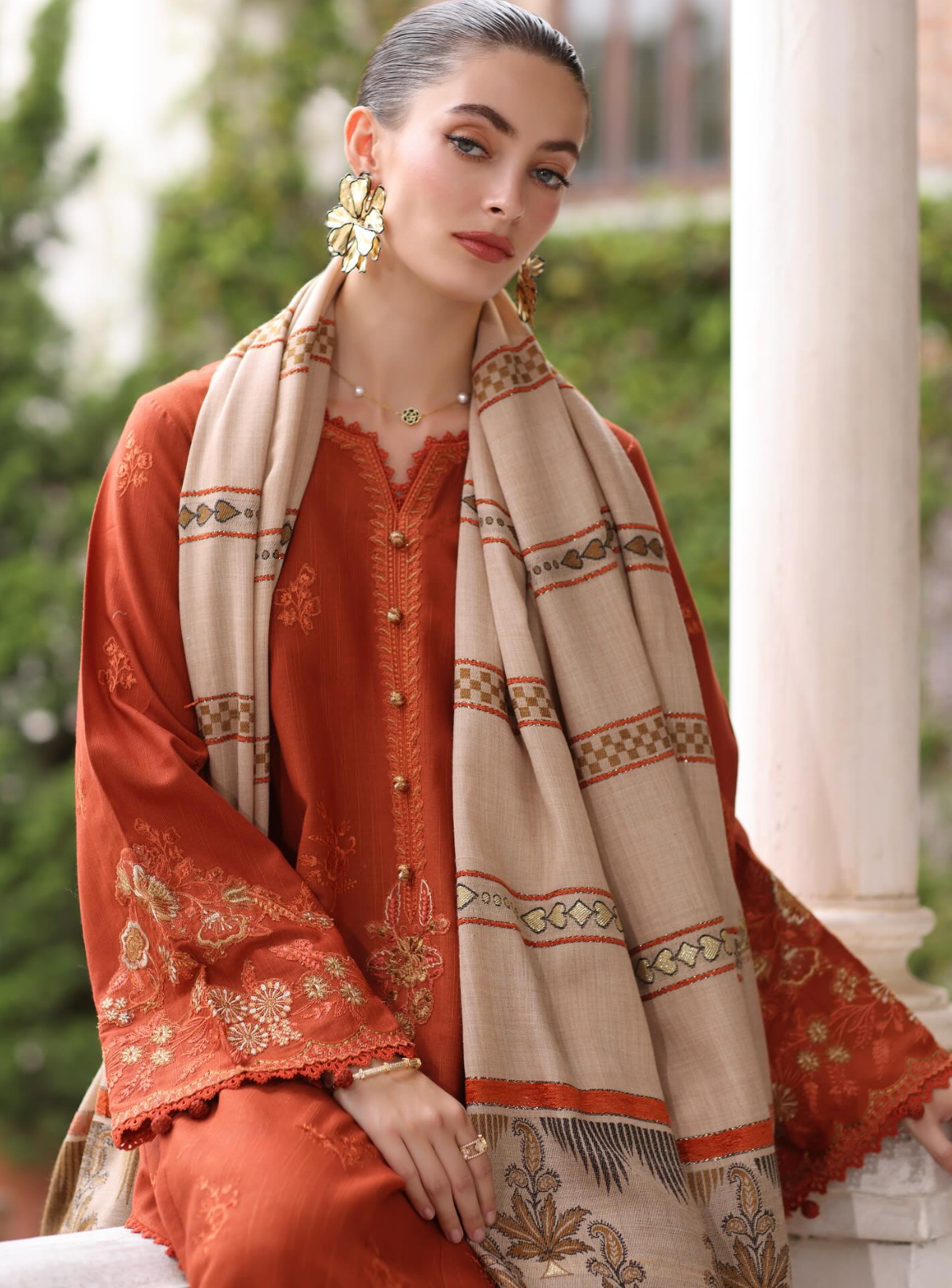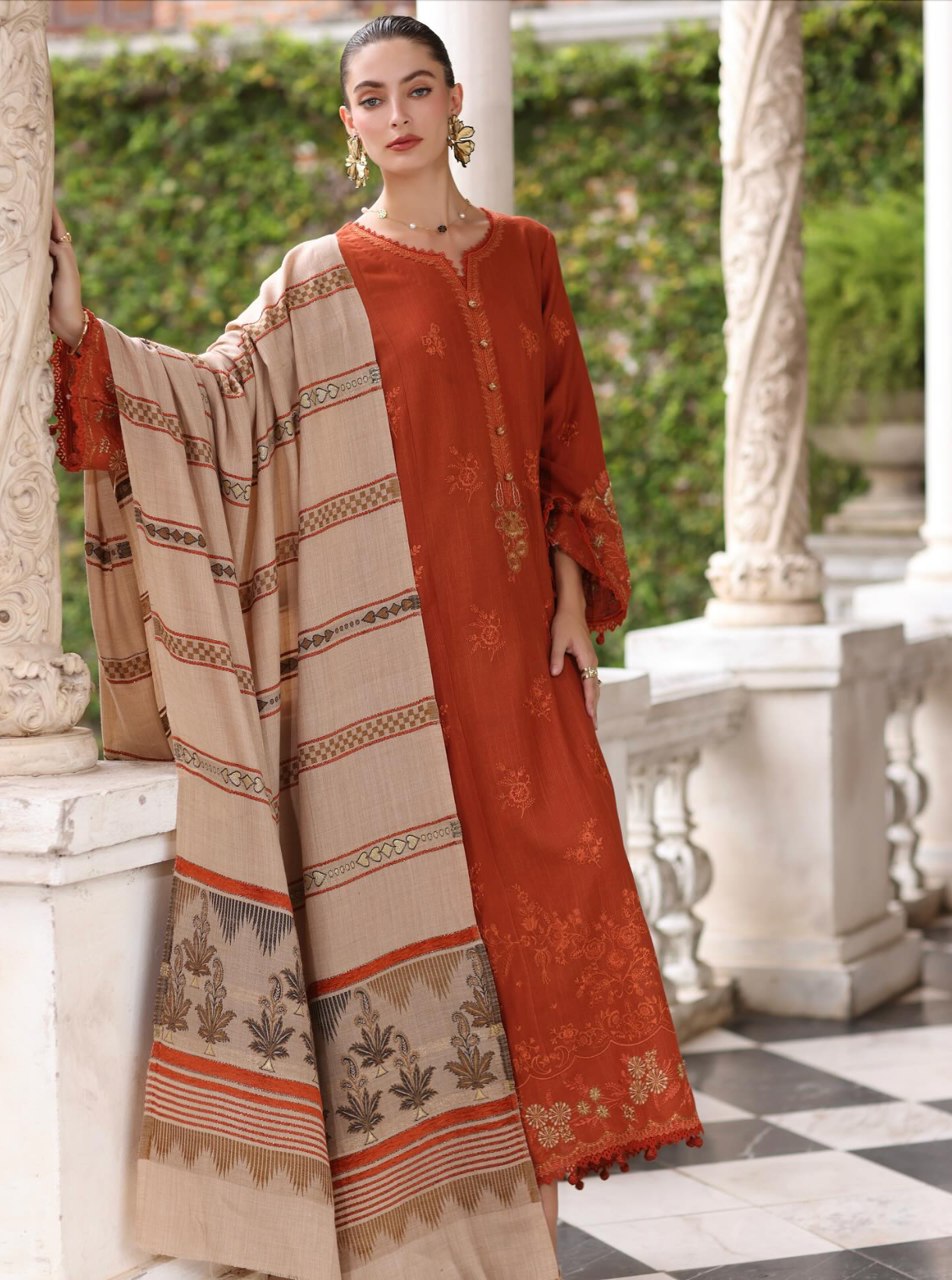 A burnt sienna embroidered ensemble featuring intricate stitches and subtle hints of bronze tinsel that lend a soft metallic sheen. It is paired with a woven beige shawl featuring modern geometric patterns and stylized ethnic florals, delicately woven to create a luxurious texture. This design is a perfect balance of tradition and contemporary refinement.