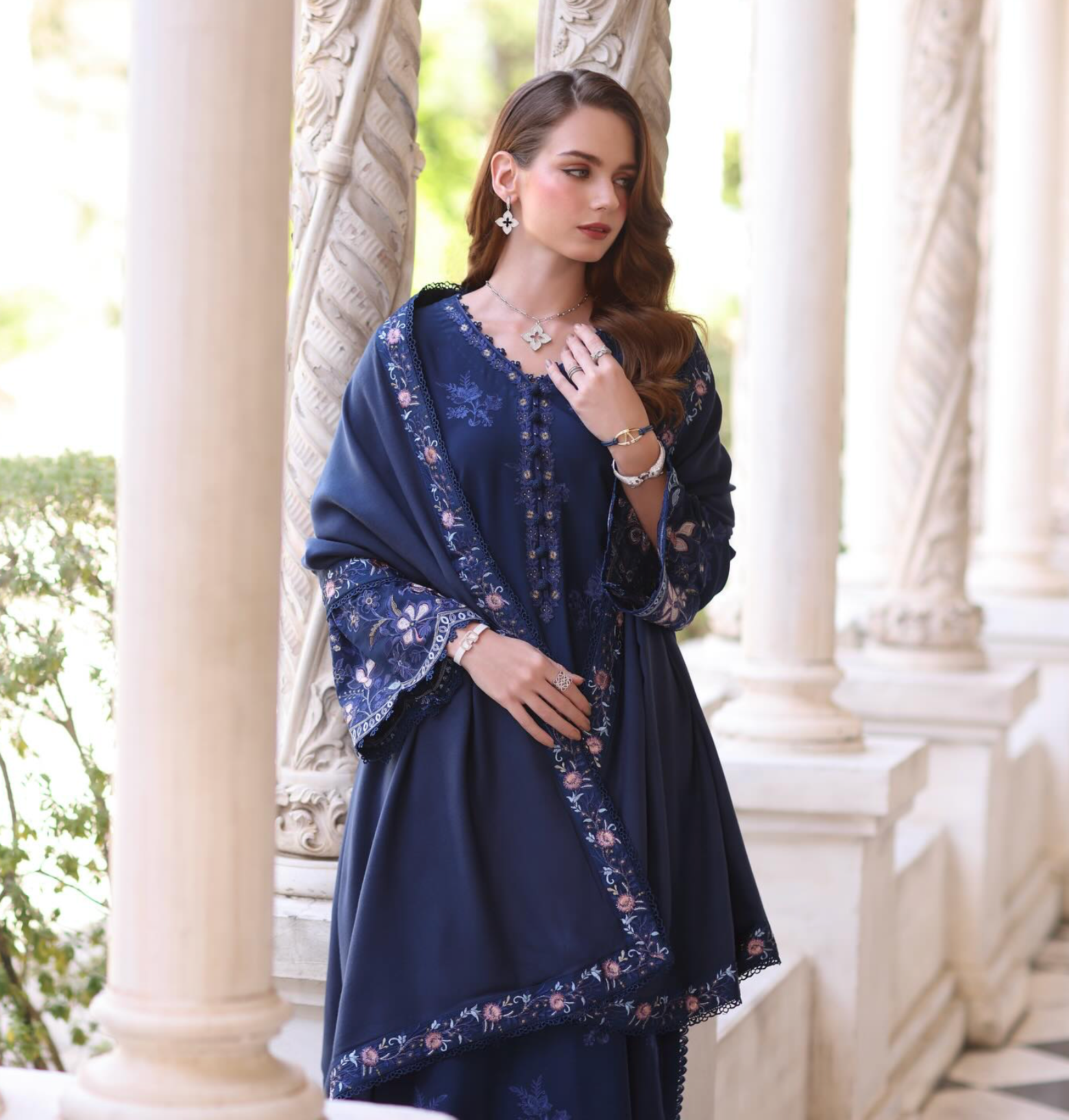 A deep blue winter ensemble that captures the essence of timeless elegance. The shirt features self-colored embroidery, creating a refined tone-on-tone texture, while multi-hued gara borders add a captivating burst of artistry and color. Paired with a luxurious pashmina shawl, finished with four sided delicate borders, the look embodies the perfect harmony of tradition and sophistication.