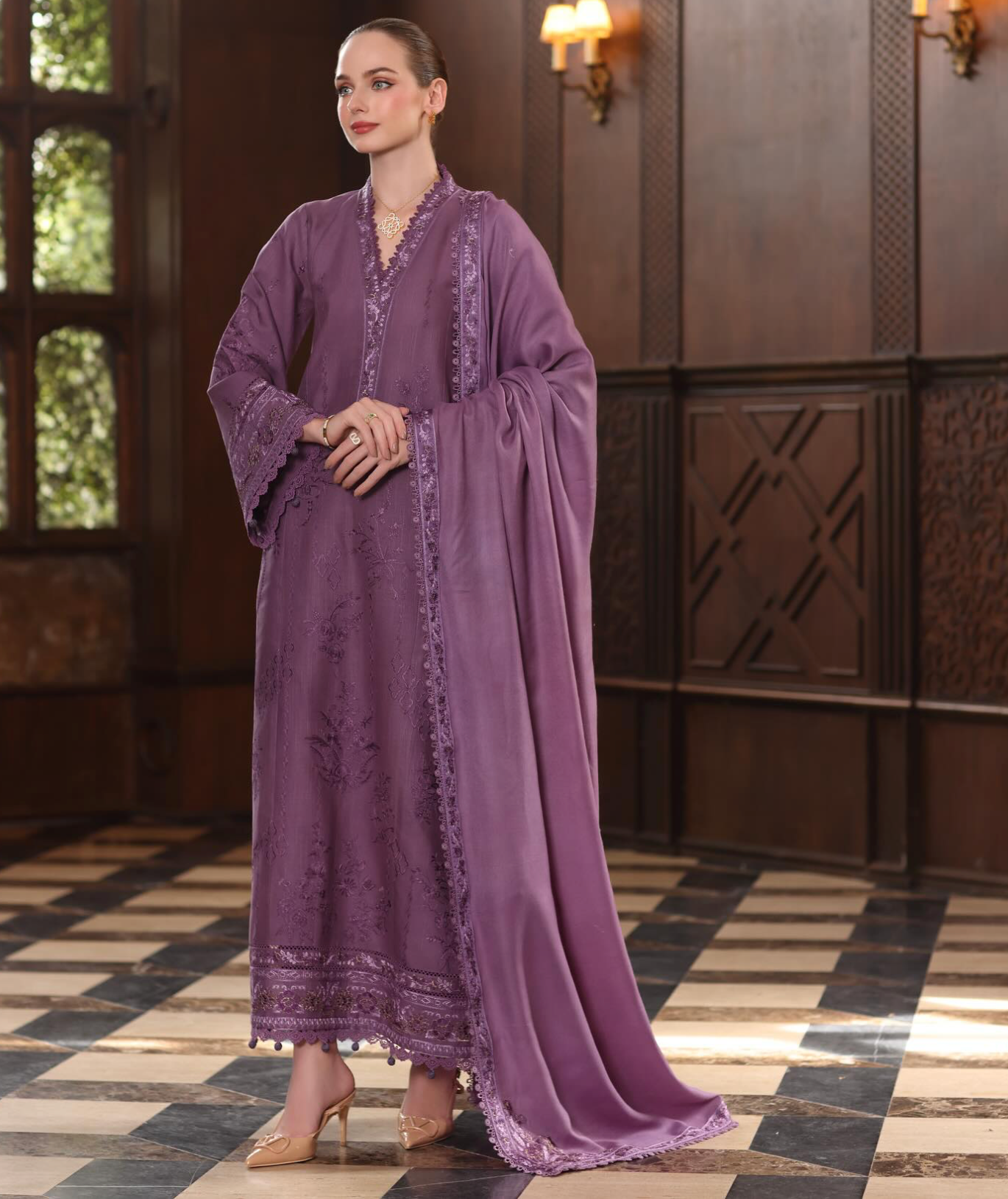 A symphony in mauve where elegance meets legacy. This ensemble from our Embroidered luxury shawl Collection features intricate Kashmiri embroidery, delicately hand-rendered to mirror the grace of time-honored craftsmanship. Paired with an artisanal pashmina shawl, it evokes the quiet grandeur of winter in the valley. Warm, regal, and eternally refined, this design is a celebration of art, soul, and timeless allure.