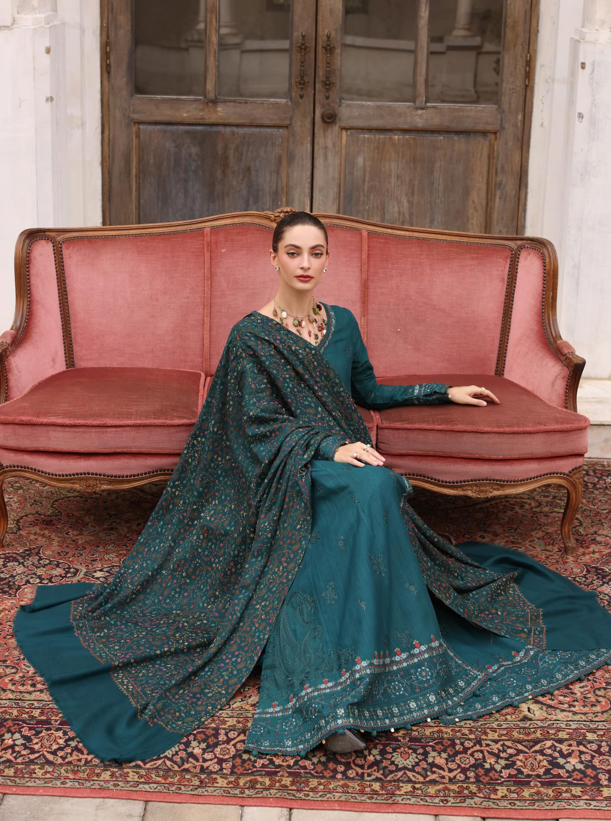 As the mountains breathe winter’s first chill, a masterpiece unfolds. In hues of tranquil teal, this ensemble celebrates the timeless art of Kashmiri embroidery, reflecting devotion in every detail. The shirt is Complemented by an artisanal hand embroidered pashmina shawl which truly captures the essence of luxury and cultural depth.