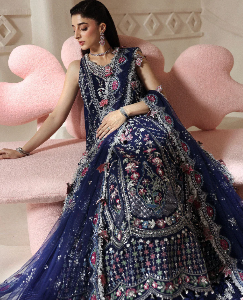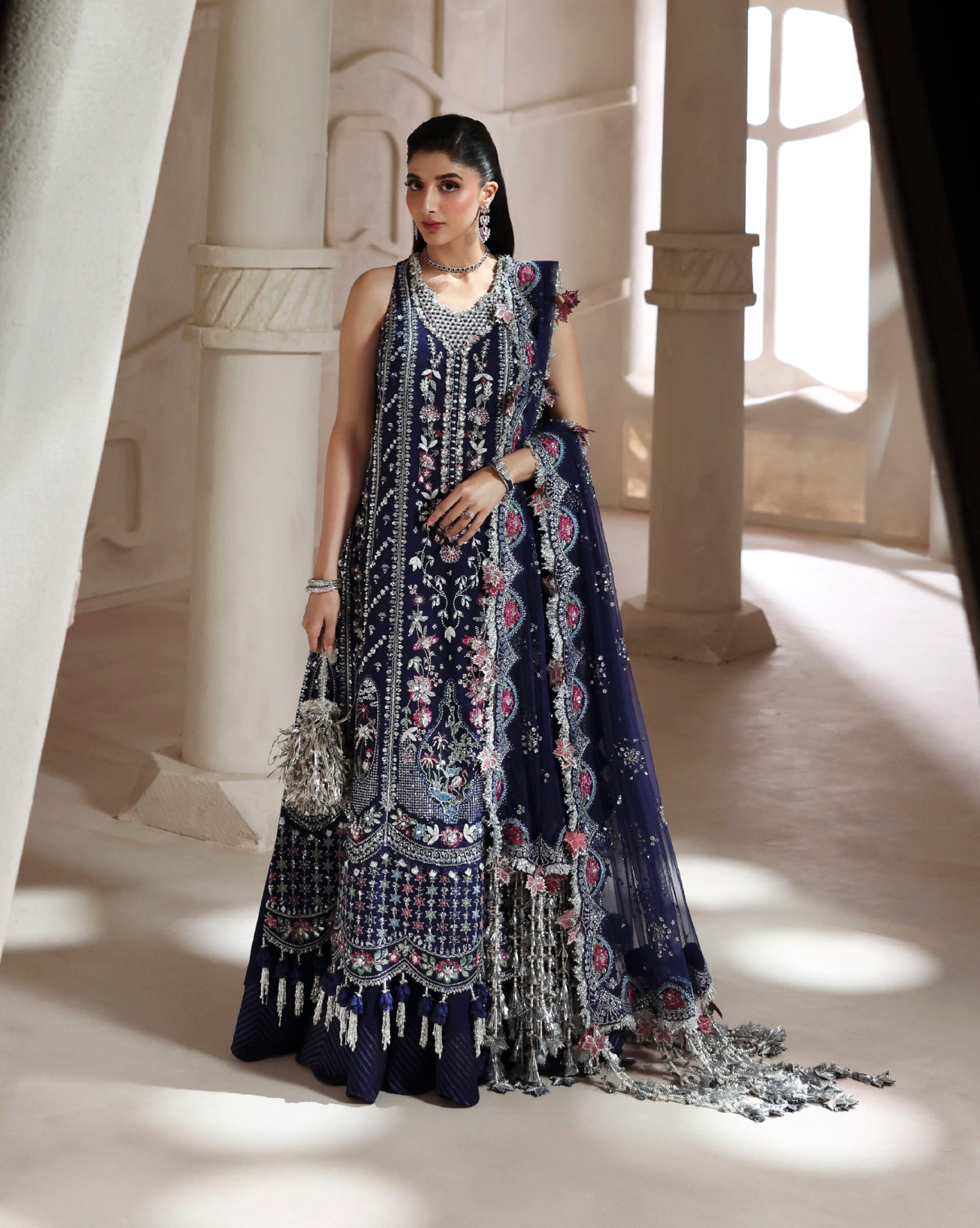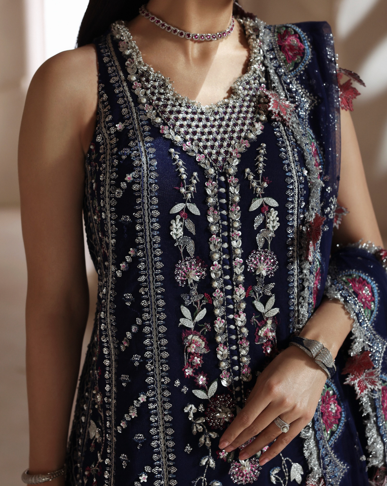 A vision of elegance and grandeur, this paneled net gown unfolds like a modern fairytale. Each flowing panel is adorned with arch motifs inspired by classic shikargah artistry, blooming with soft pinks, serene greens, dreamy blues, and a glimmer of silver sequins. The hemline, traced with delicate scallops adds a graceful flourish, while the net dupatta dusted with a shimmering spray of sequins and framed with an intricate border completes the ethereal look. Timeless and enchanting, this ensemble is crafted to make every moment feel unforgettable.