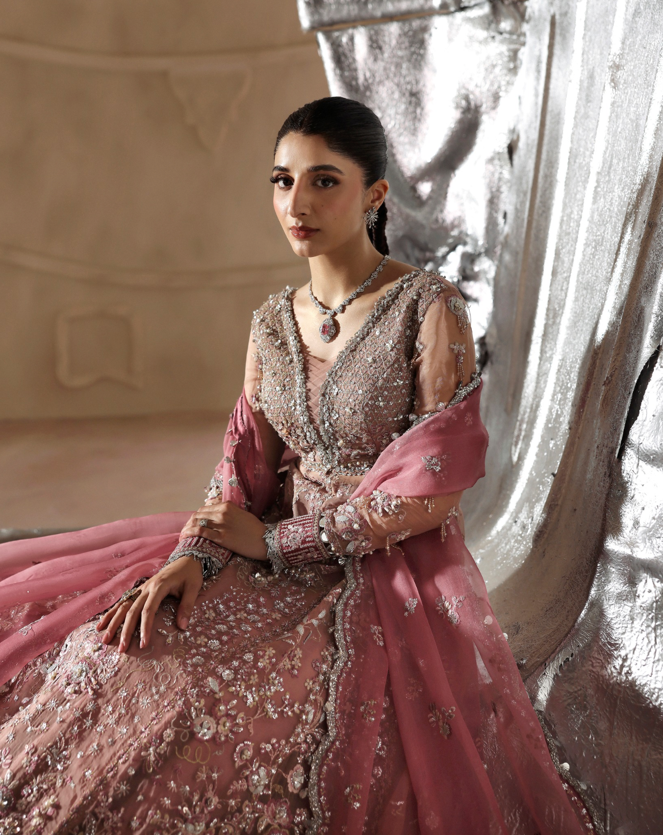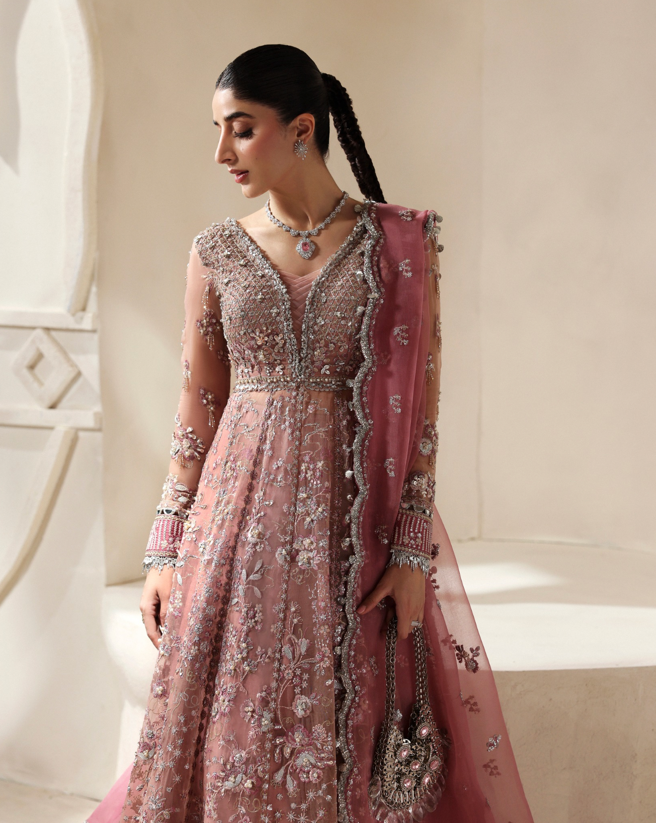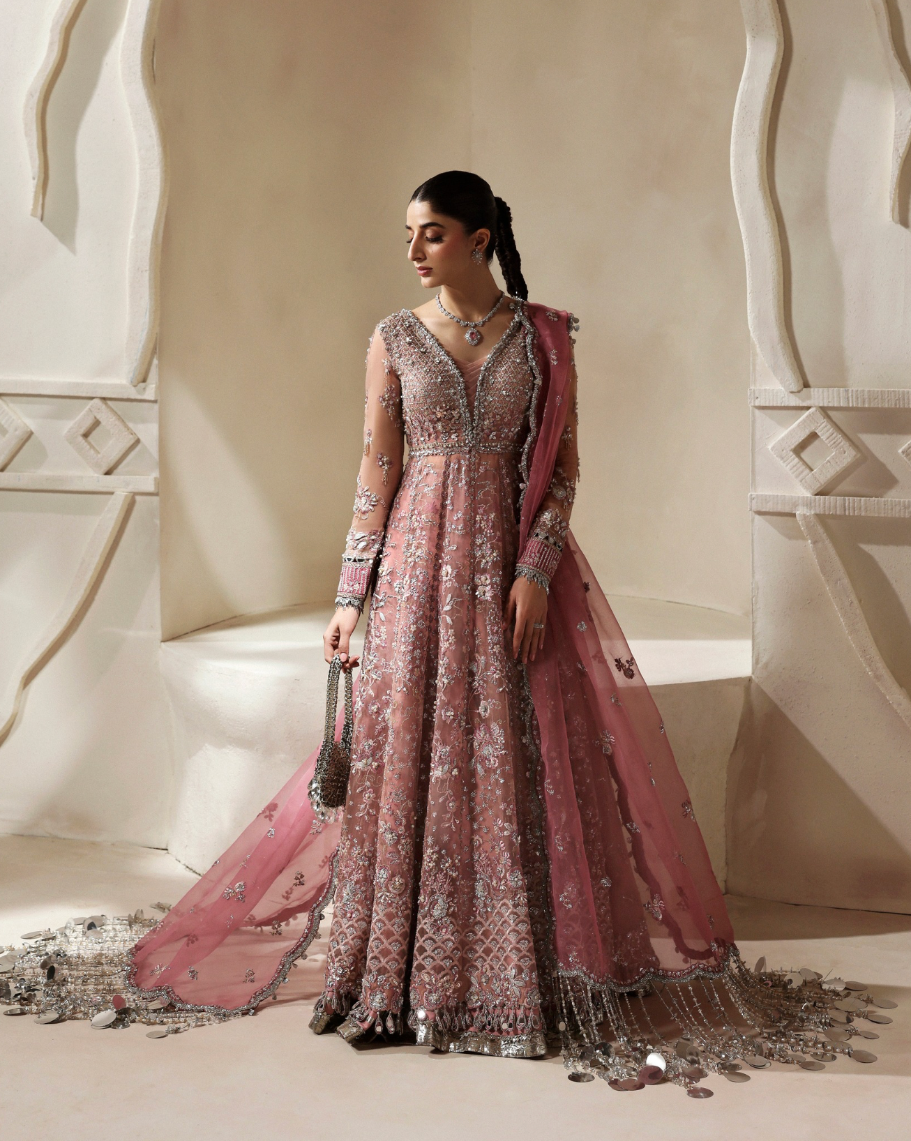 In dreamy dusty peach, this organza paneled pishwas captures the essence of feminine grace. The bodice shimmers with an intricate silver sequin jaal, while cascading panels bloom with delicate floral embroidery framed in soft pink satin for a whisper of refinement. Paired with an ethereal pink organza dupatta, the ensemble exudes quiet grandeur, a perfect harmony of charm and sophistication, designed to leave a graceful impression wherever you go.