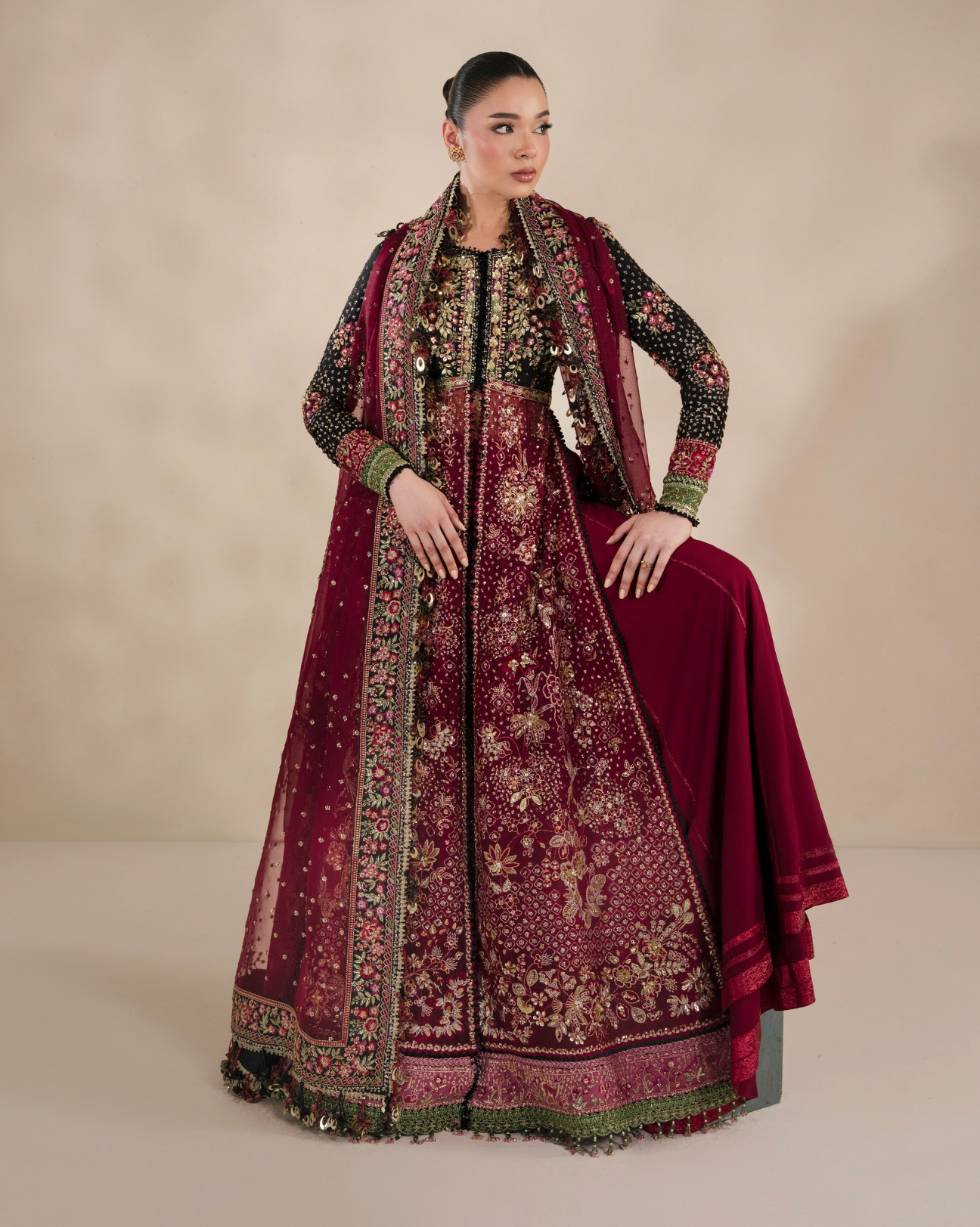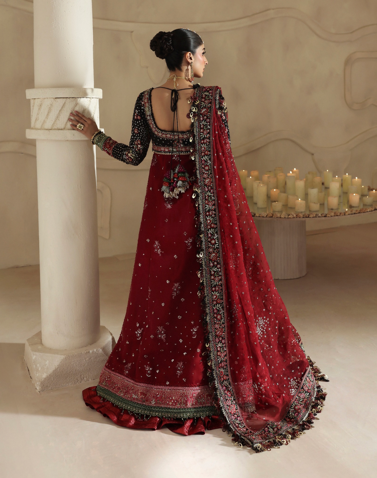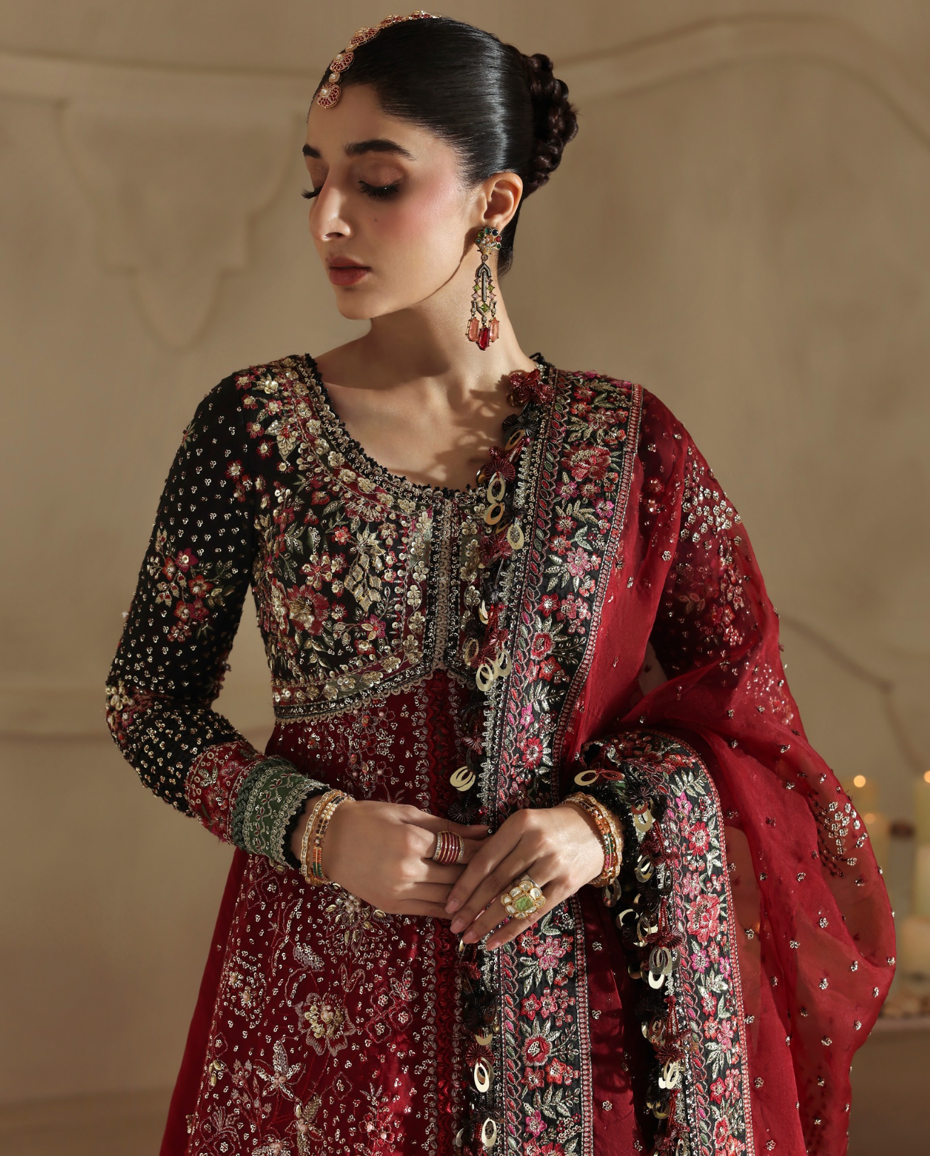 A symphony of bold elegance and timeless craft this organza paneled masterpiece enchants with its striking contrasts. The structured black bodice blooms with vibrant, hand embroidered florals melting seamlessly into rich red organza panels adorned with silver motifs and sequins that glimmer like stardust. Lush green and hot pink borders frame the design with playful sophistication, while the organza dupatta softly shimmering with scattered sequins adds a veil of mystery. Finished with a black embroidered border, it becomes a portrait of refinement, artistry and allure. A true celebration of modern glamour rooted in heritage.