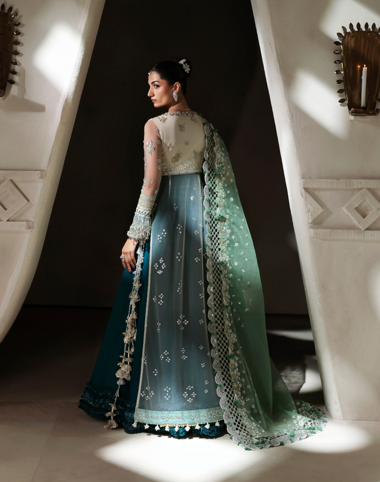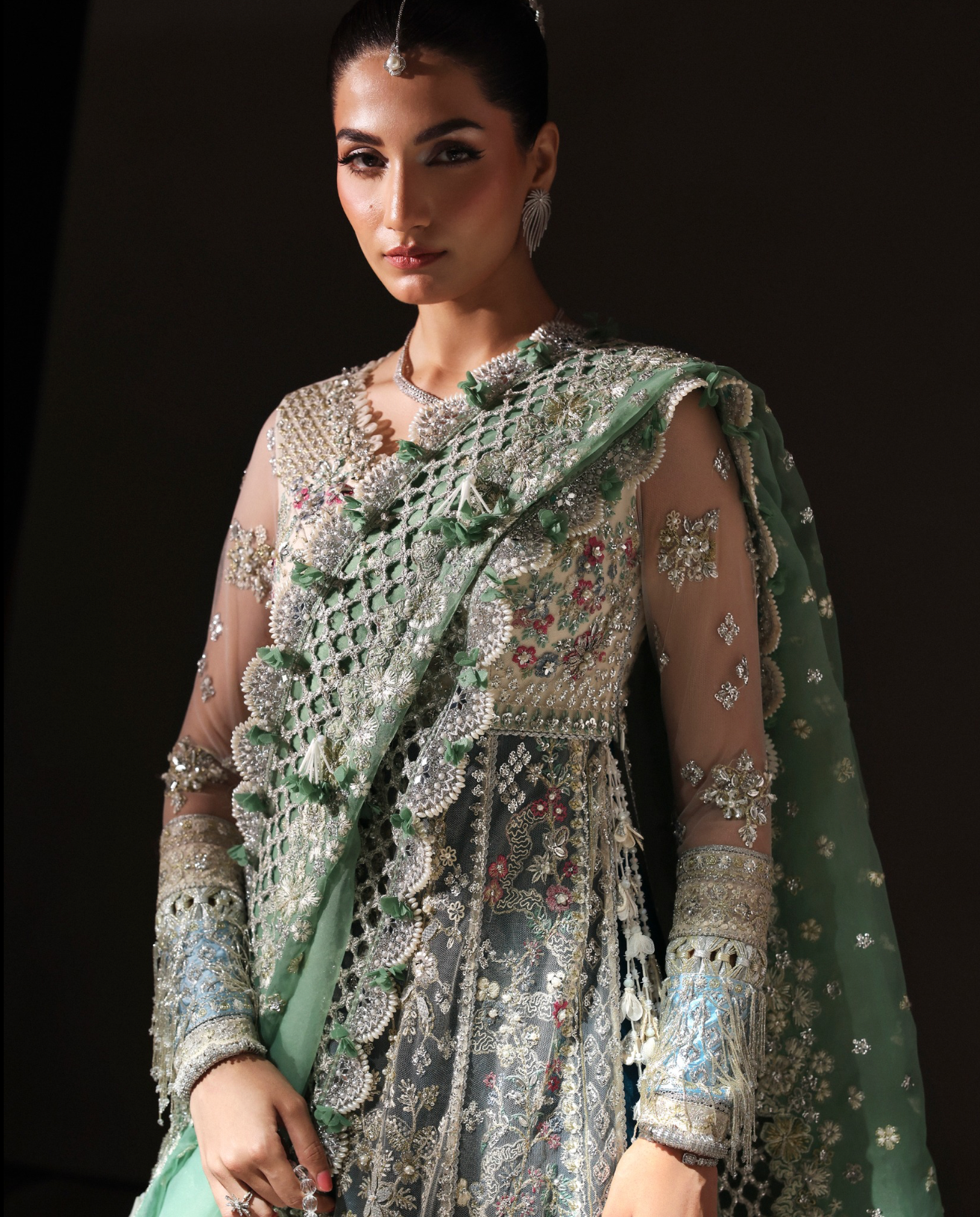 Ethereal in white, this paneled net shirt blooms with soft blush florals, muted greens, and ivory embroidery across its delicately adorned bodice. A silver sequin border traces the hem with a subtle sparkle, infusing grace with just the right touch of glamour. Paired with a striking green lehenga, the contrast feels bold yet refined, while the sage organza dupatta finished with a floral border and intricate geometric accents wraps the look in timeless charm. A perfect harmony of modern elegance and feminine allure, designed for festive soirées and unforgettable celebrations.
