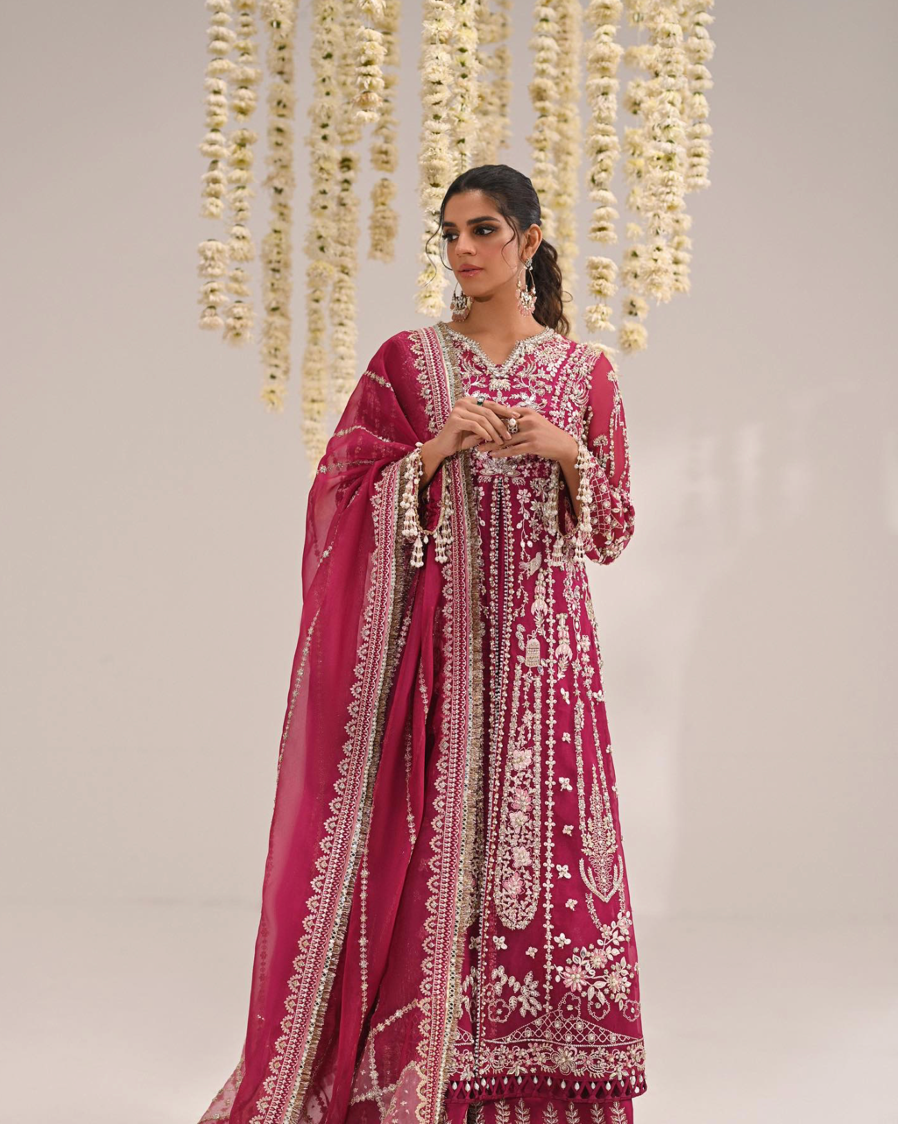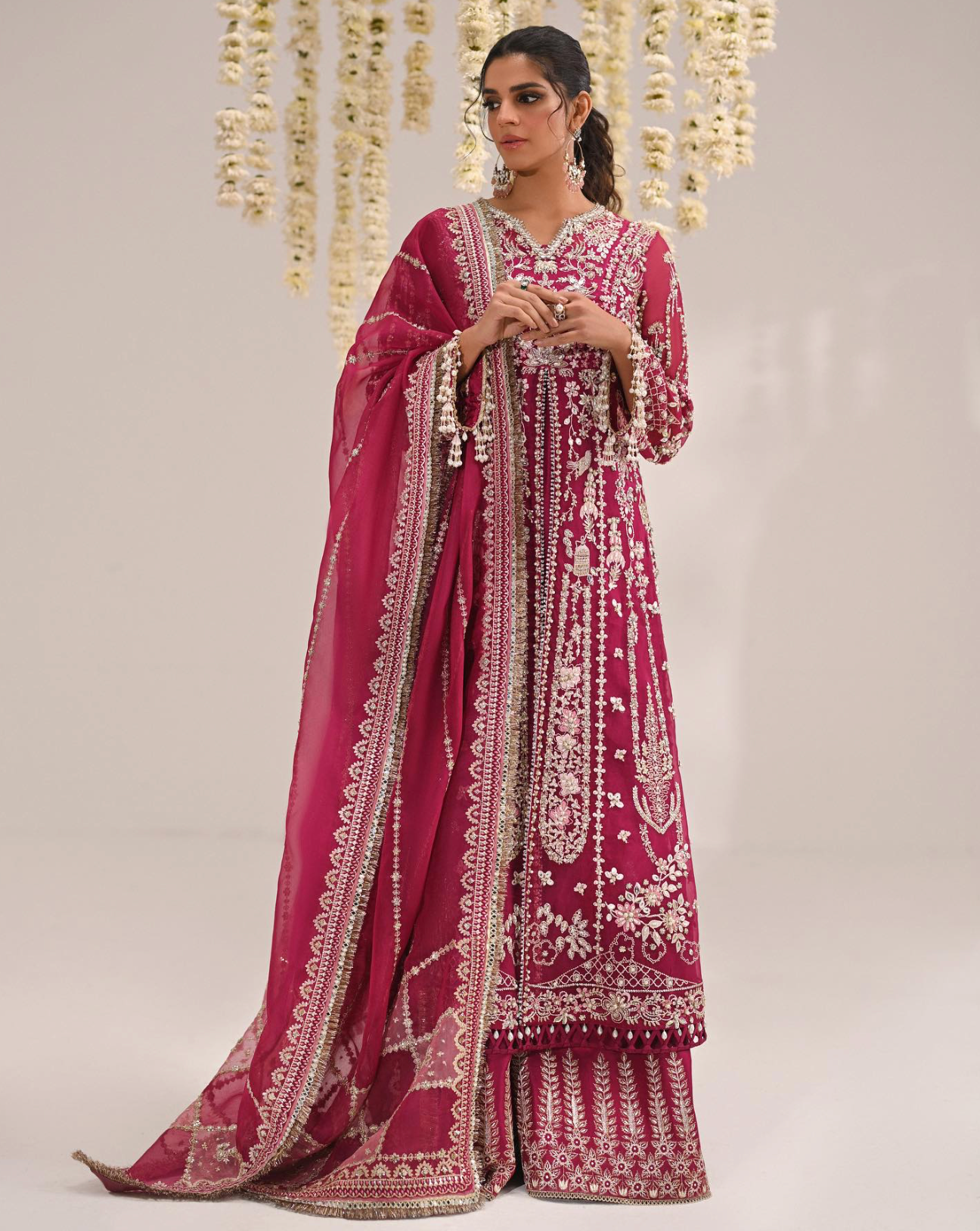 An exquisite rust organza kurta adorned with intricate resham and tilla embroidery, enhanced by delicate hand embellishments. Paired with classic azaar pants and a contrasting turquoise embroidered dupatta, this ensemble is a perfect blend of timeless tradition and modern elegance.