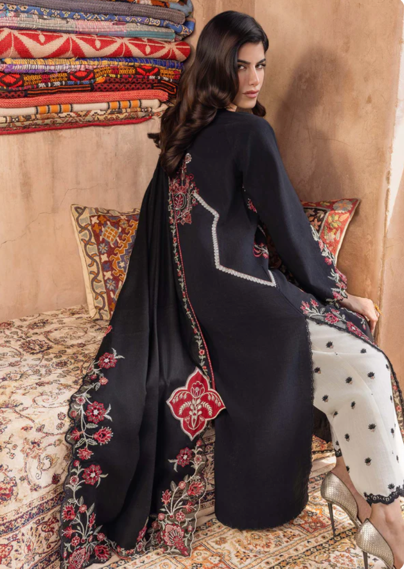 A masterpiece that exudes an aura of refined elegance and quiet luxury. Draped in an ivory khaddar canvas, this design is adorned with meticulously crafted soft pink single taar embroidered borders reminiscent of old Kashmiri work, brought to life with delicate floral motif vines in hues of warm pinks and whispers of scarlet. Every detail, showcases unparalleled craftsmanship, creating a timeless allure. Paired with an ivory khaddar trouser with a delicate scatter of bootis.