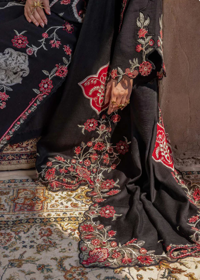 The shawl is Art! Bold in Scarlett Red and beautifully adorned with ethereal floral accents, paired with Moroccan mosaic motifs in an asymmetrical composition. A sartorial ode to regal sophistication.