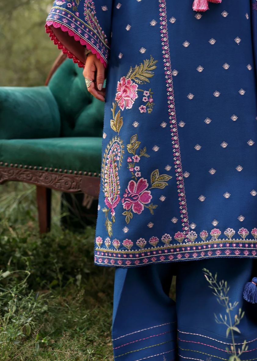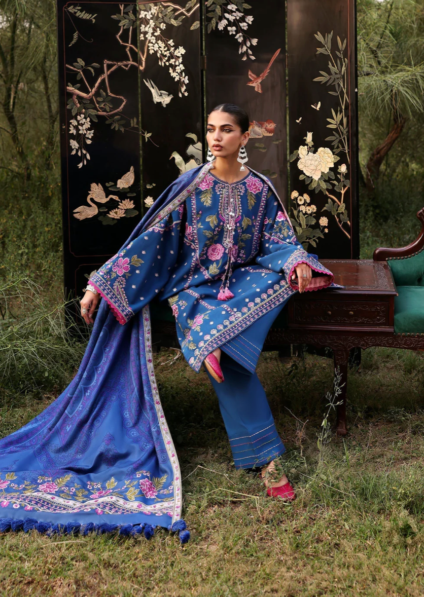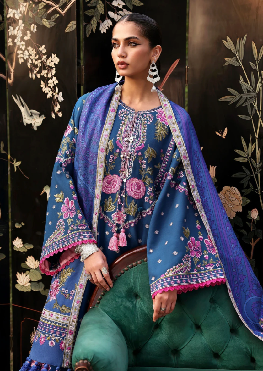 A gorgeous composition of roses and paisleys being this teal winter look to life. Composed to give a defined yoke and continuing sleeve pattern , this heavily embroidered design on marina is bound to turn heads . Assymetric composition of the printed shawl accented with beautiful embroidered borders framing it from all sides , this one is a mood and style lift you need this winter.