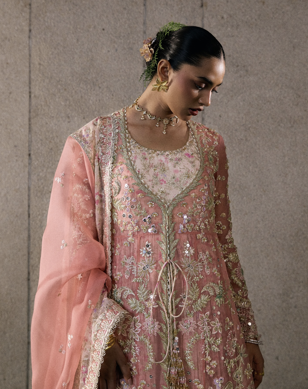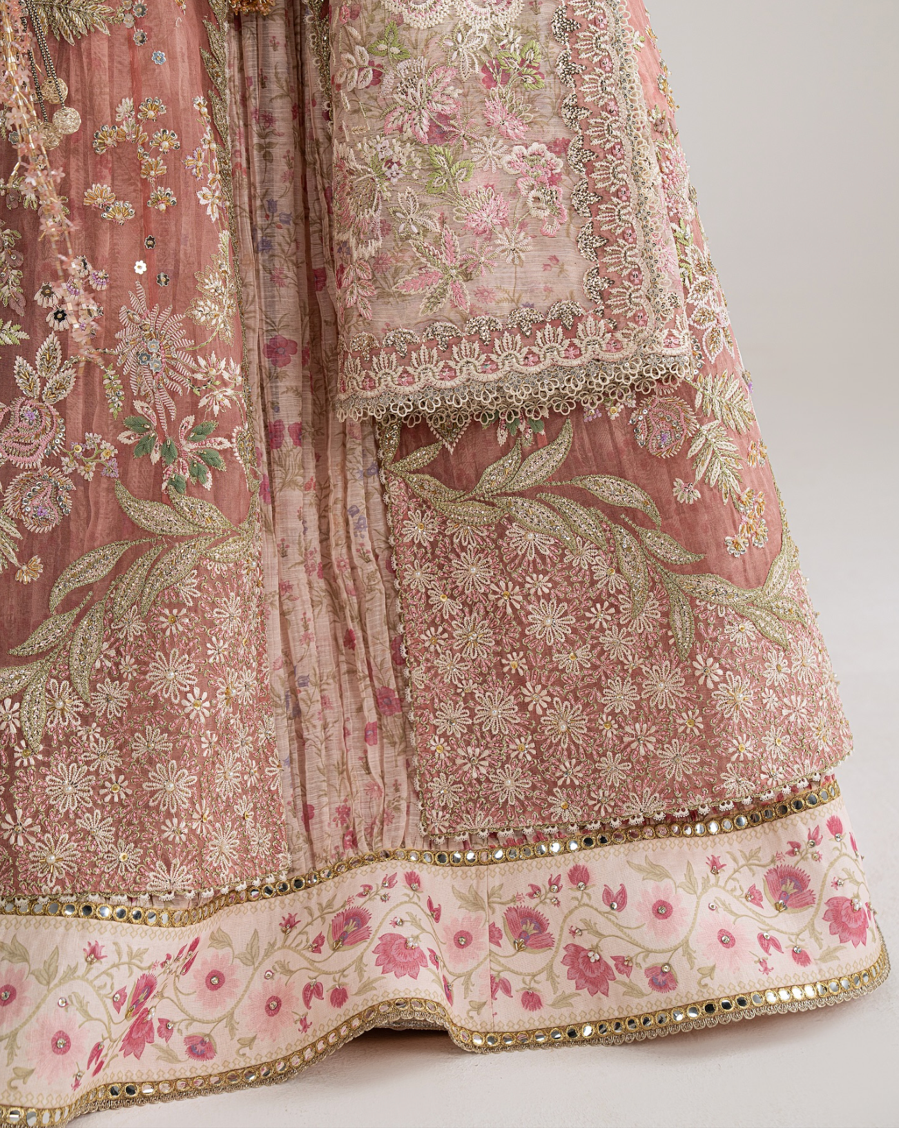 In a romantic blush rose hue, this four-piece design pairs a printed crushed pishwas with a heavily embroidered front-open organza jacket. Embellished with handwork in gold and silver, the overlay features tassel detailing at the front and a scooped V neckline framing the curved round neckline of the pishwas beneath. Full fitted sleeves with embroidery and tassels add refined elegance. Styled with matching printed sharara pants adorned with floral accents and detailed hems. The organza dupatta completes the look with printed borders that flow inward with delicate embroidery.