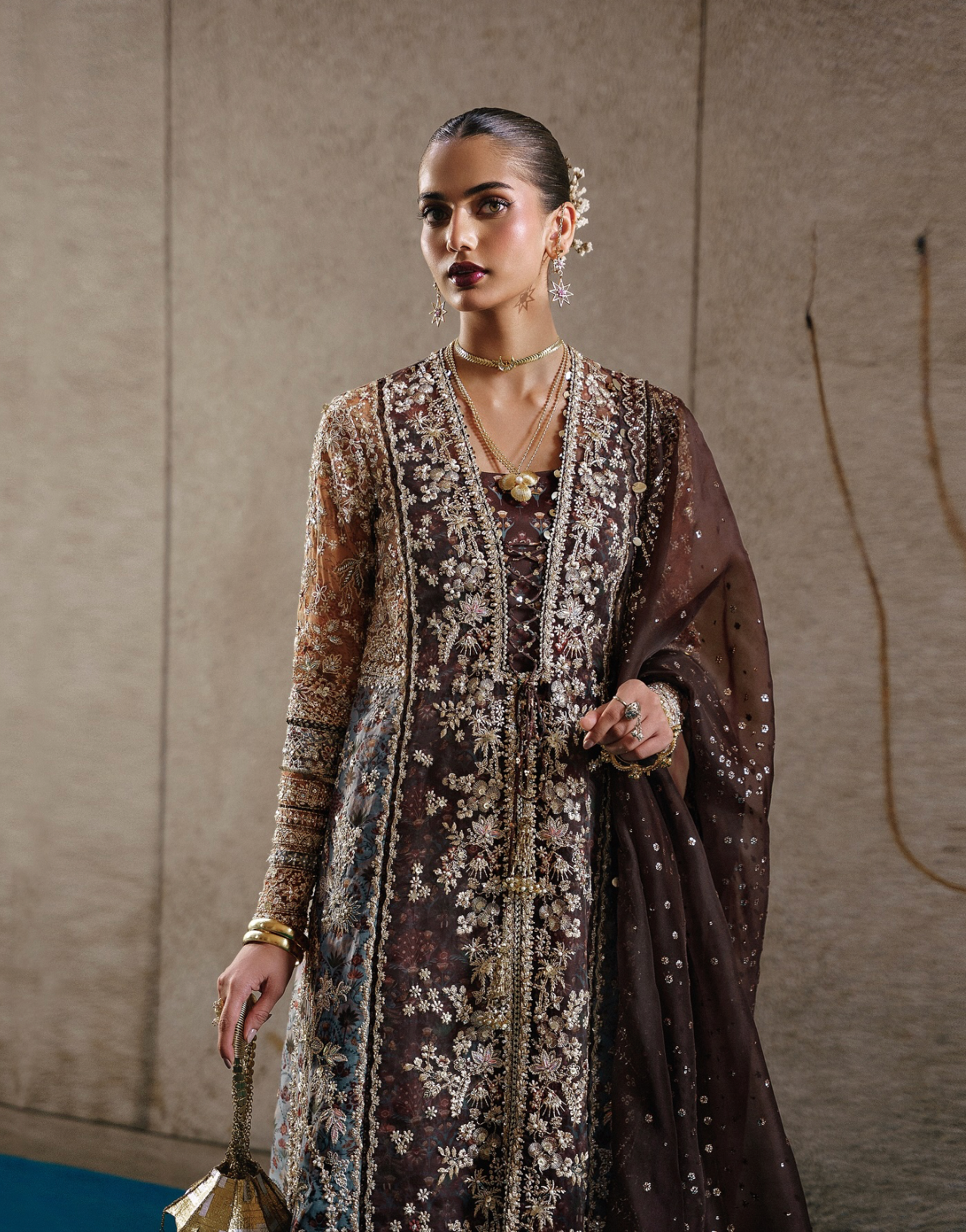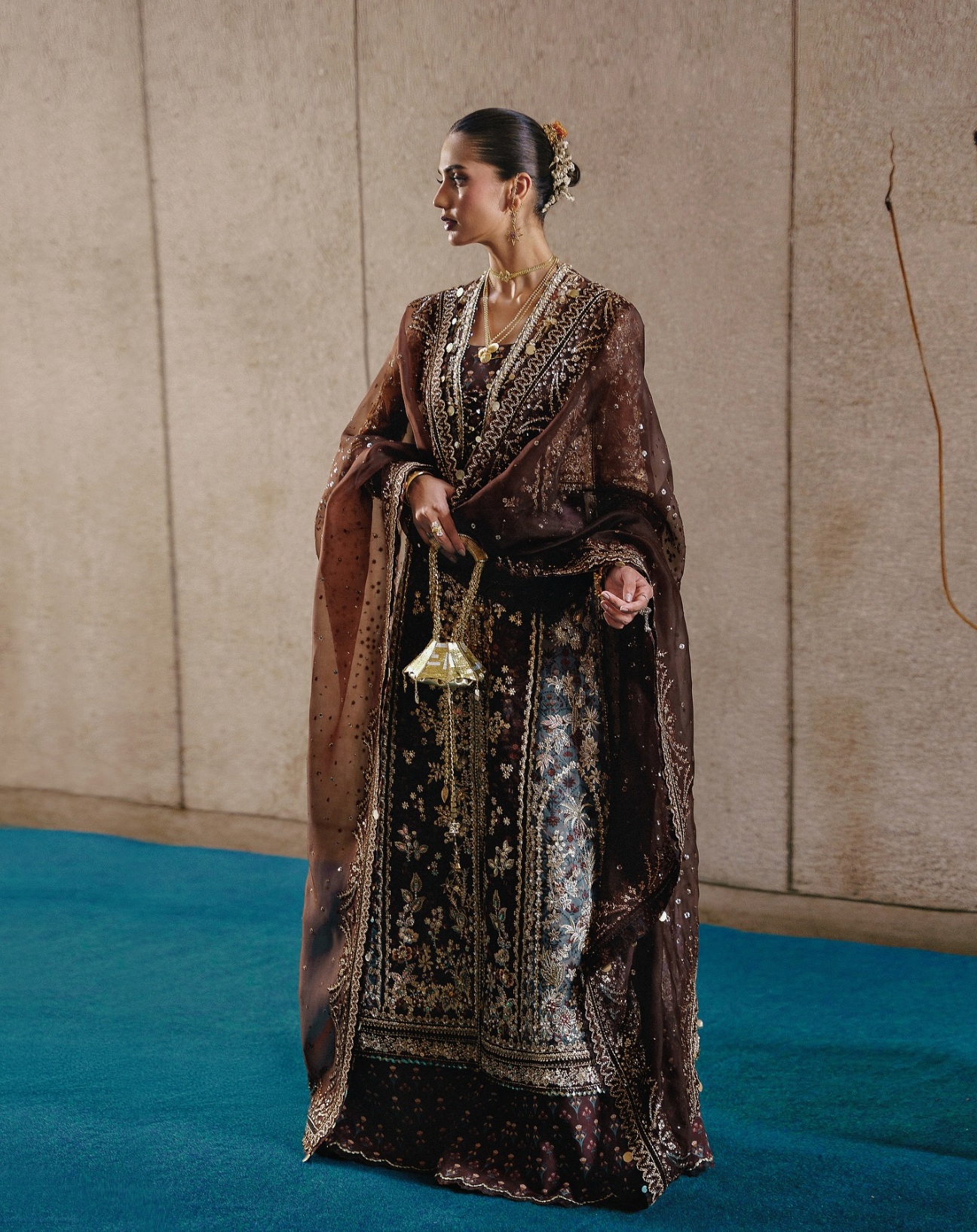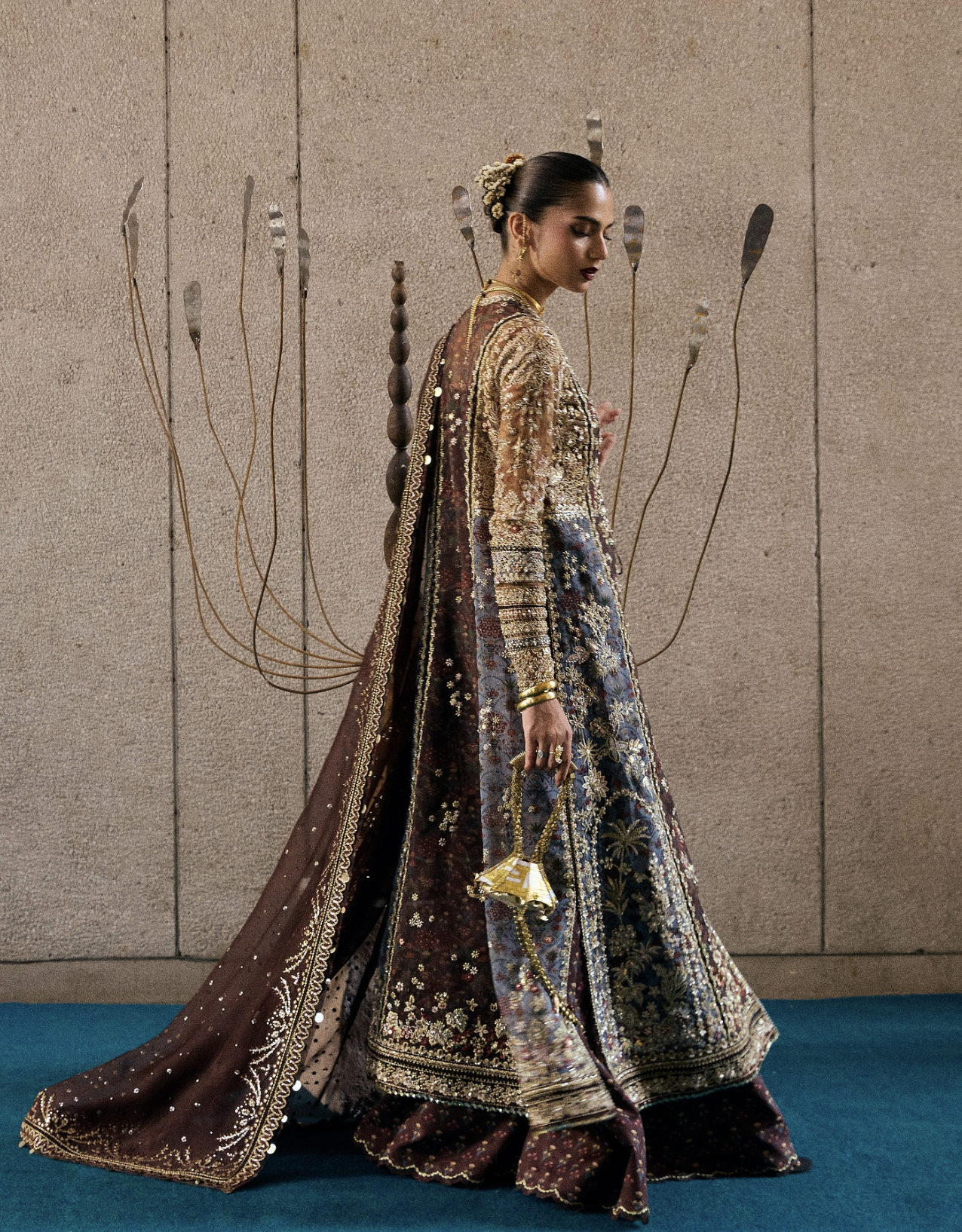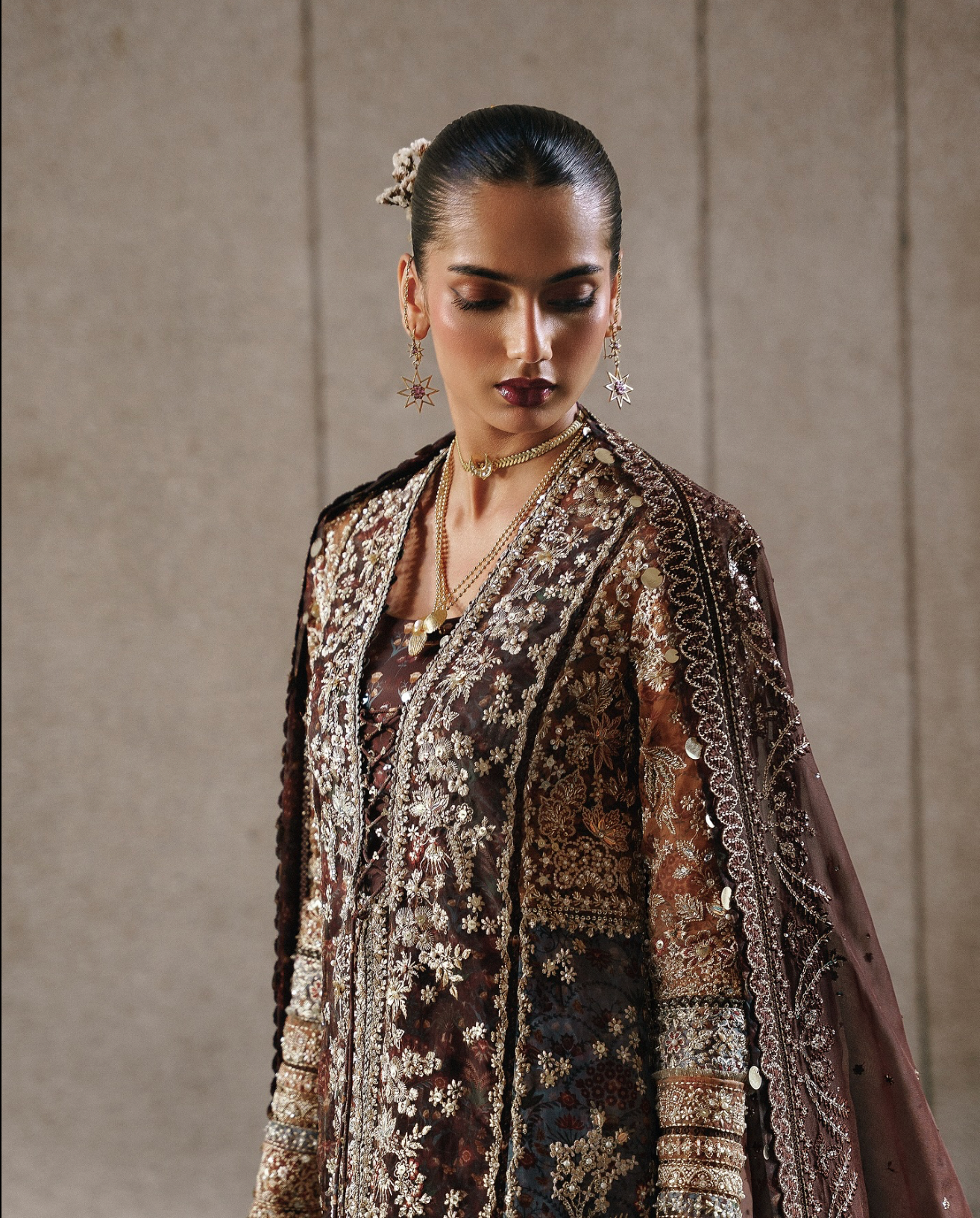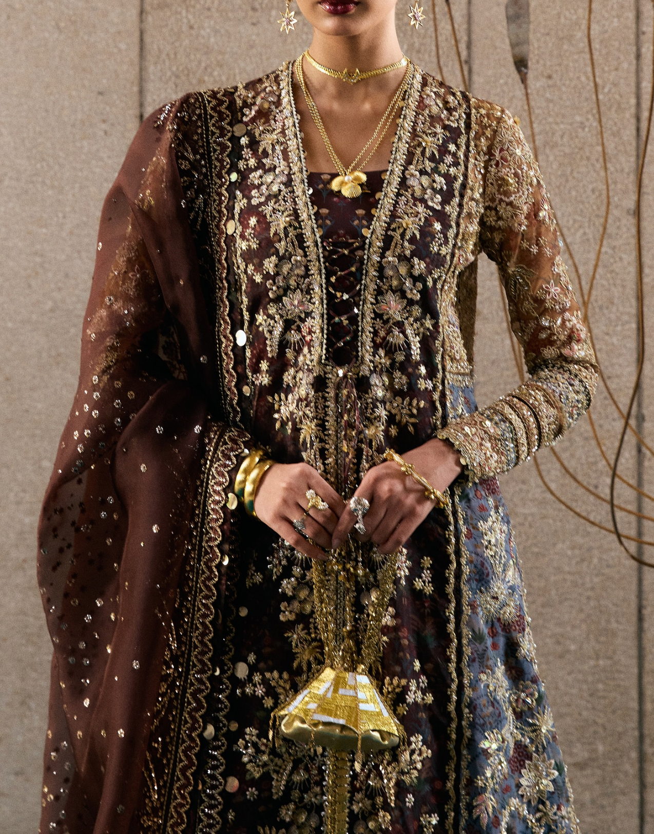 Drenched in deep brown tones, this four-piece set features a printed organza front-open multi-panelled, in grays and yellows that gradiate the brown, shirt with a square neckline. Embellished with golden sequins and hints of green, red, and white, the paneled design is finished with intricate laces, contrasting grey accents, and tassels. Styled with a printed grip silk slip and matching sharara pants with scalloped edges. The organza dupatta is adorned with self and gold embroidery, sequins, and a printed four-sided border with sequin tassels.