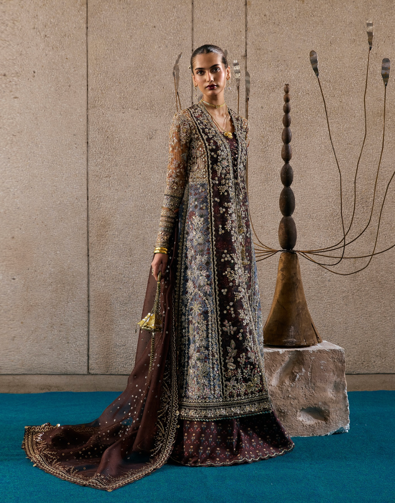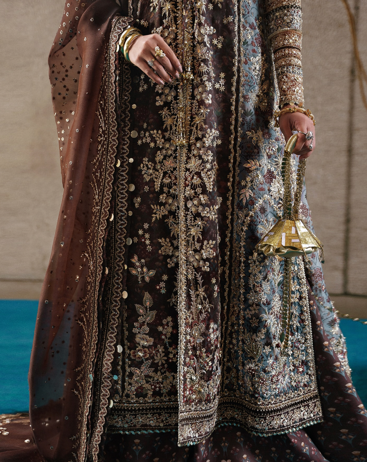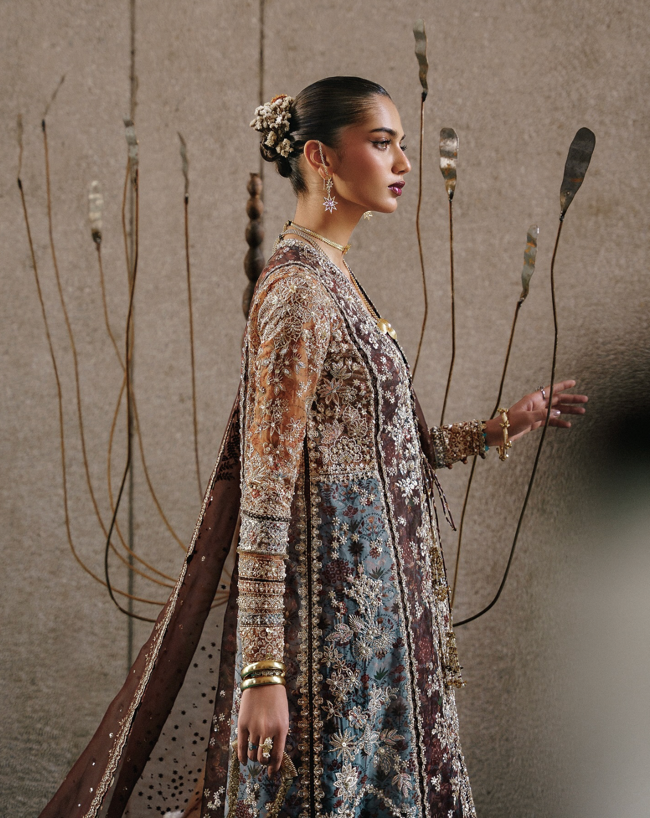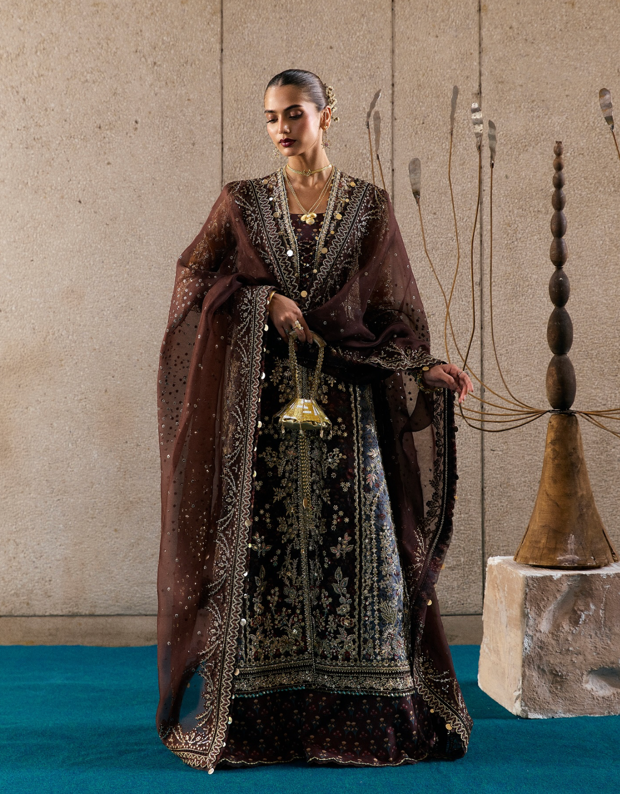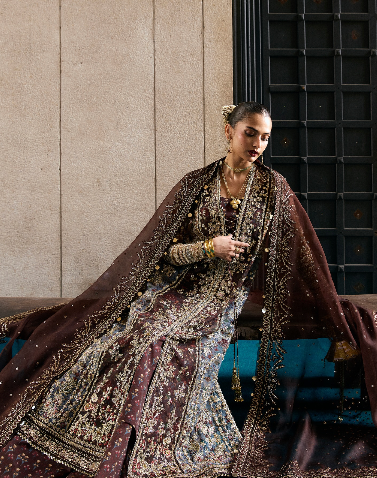 Drenched in deep brown tones, this four-piece set features a printed organza front-open multi-panelled, in grays and yellows that gradiate the brown, shirt with a square neckline. Embellished with golden sequins and hints of green, red, and white, the paneled design is finished with intricate laces, contrasting grey accents, and tassels. Styled with a printed grip silk slip and matching sharara pants with scalloped edges. The organza dupatta is adorned with self and gold embroidery, sequins, and a printed four-sided border with sequin tassels.