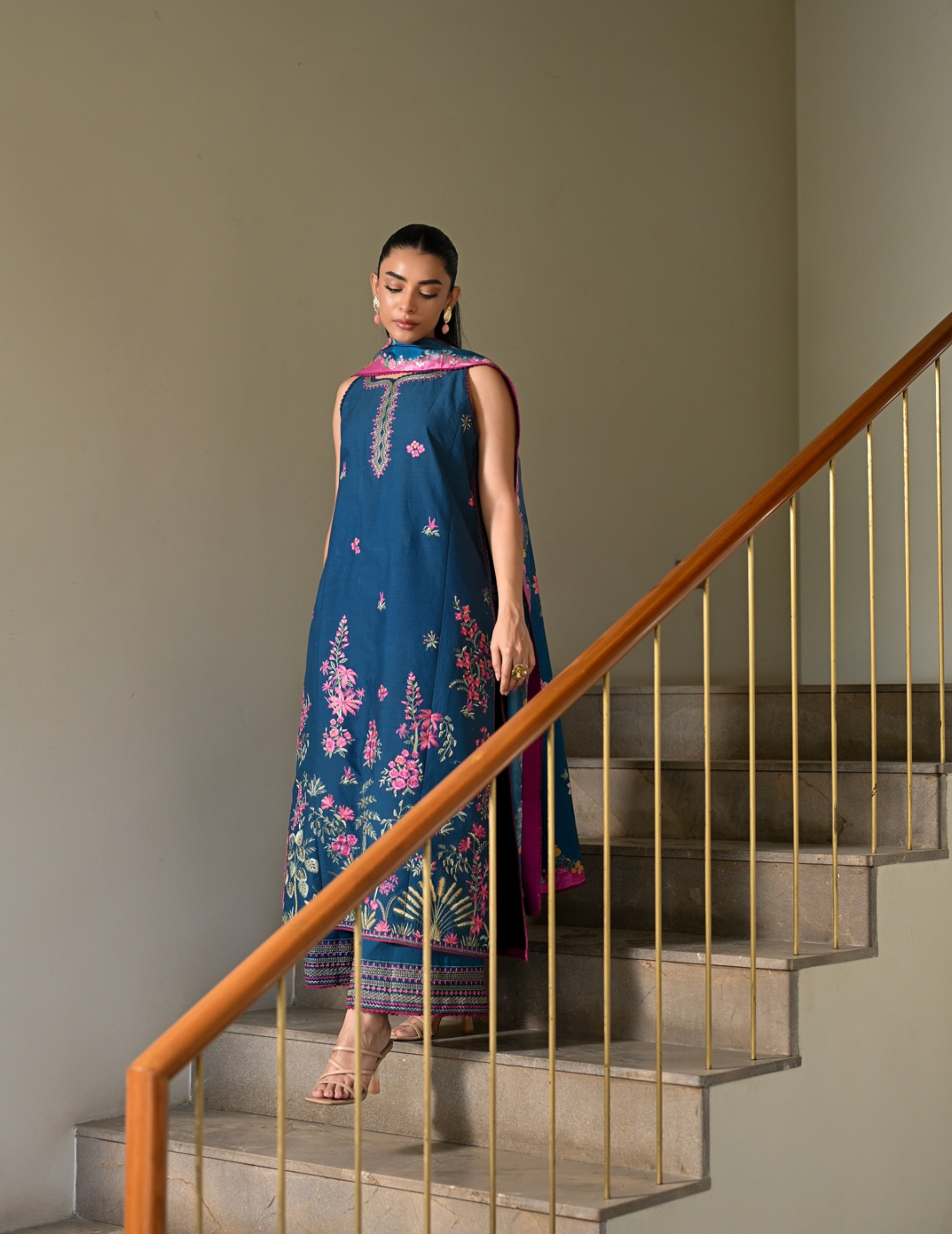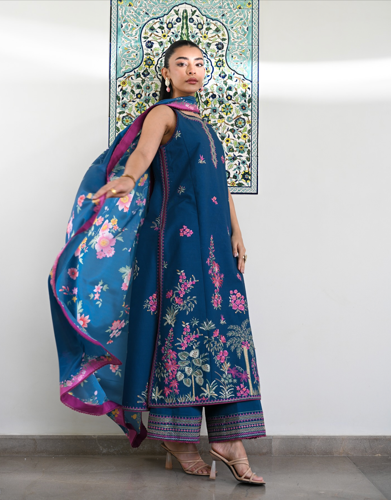 This captivating teal blue article features a beautifully embroidered full-length shirt, designed with a light and airy summer aesthetic in refreshing green and pink tones. Complementing this elegant shirt is a luxurious floral printed silk dupatta, delicately finished with a lace trim, and stylishly embroidered izaar trousers, creating a harmonious and sophisticated ensemble perfect for the warmer months.