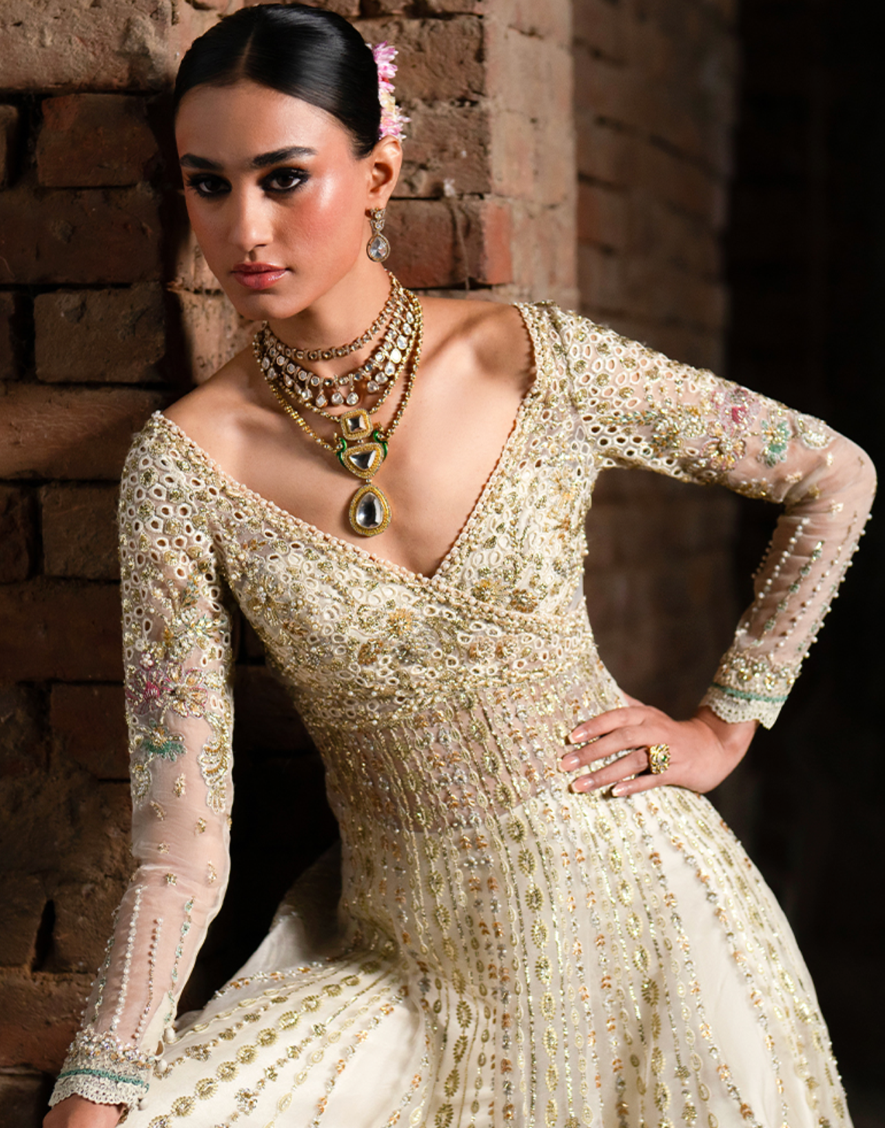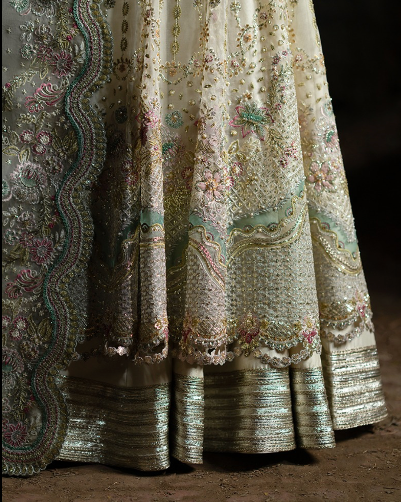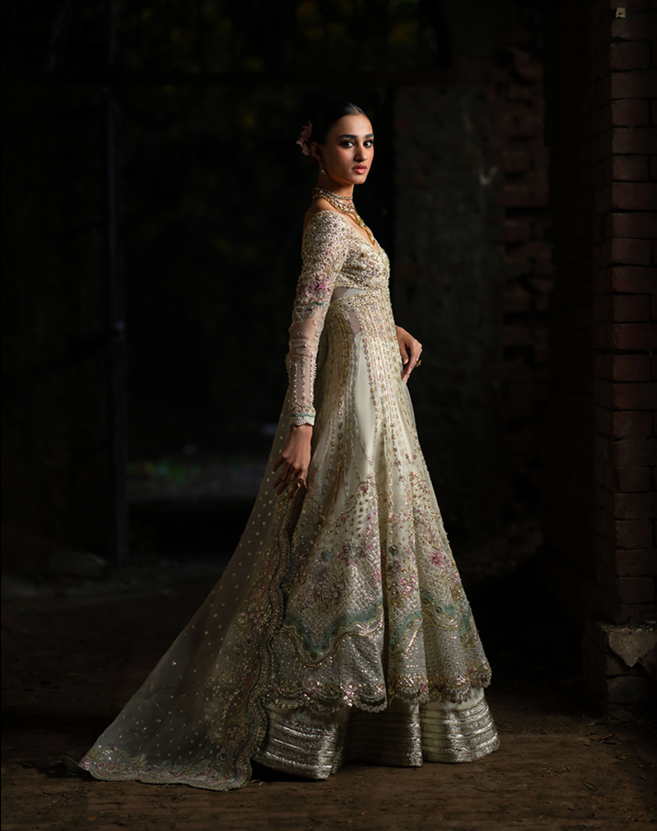 The ensemble is paired with a raw silk slip for structure and comfort, and a raw silk sharara trouser, enriched with embroidered patches on the trouser and lehenga, crafted using thread work, tilla, sequins, pearls, net flowers, sitara, and 3D floral accents. Every detail reflects refined craftsmanship, making Erya a perfect choice for weddings, festive gatherings, and celebrations that call for sophisticated elegance.