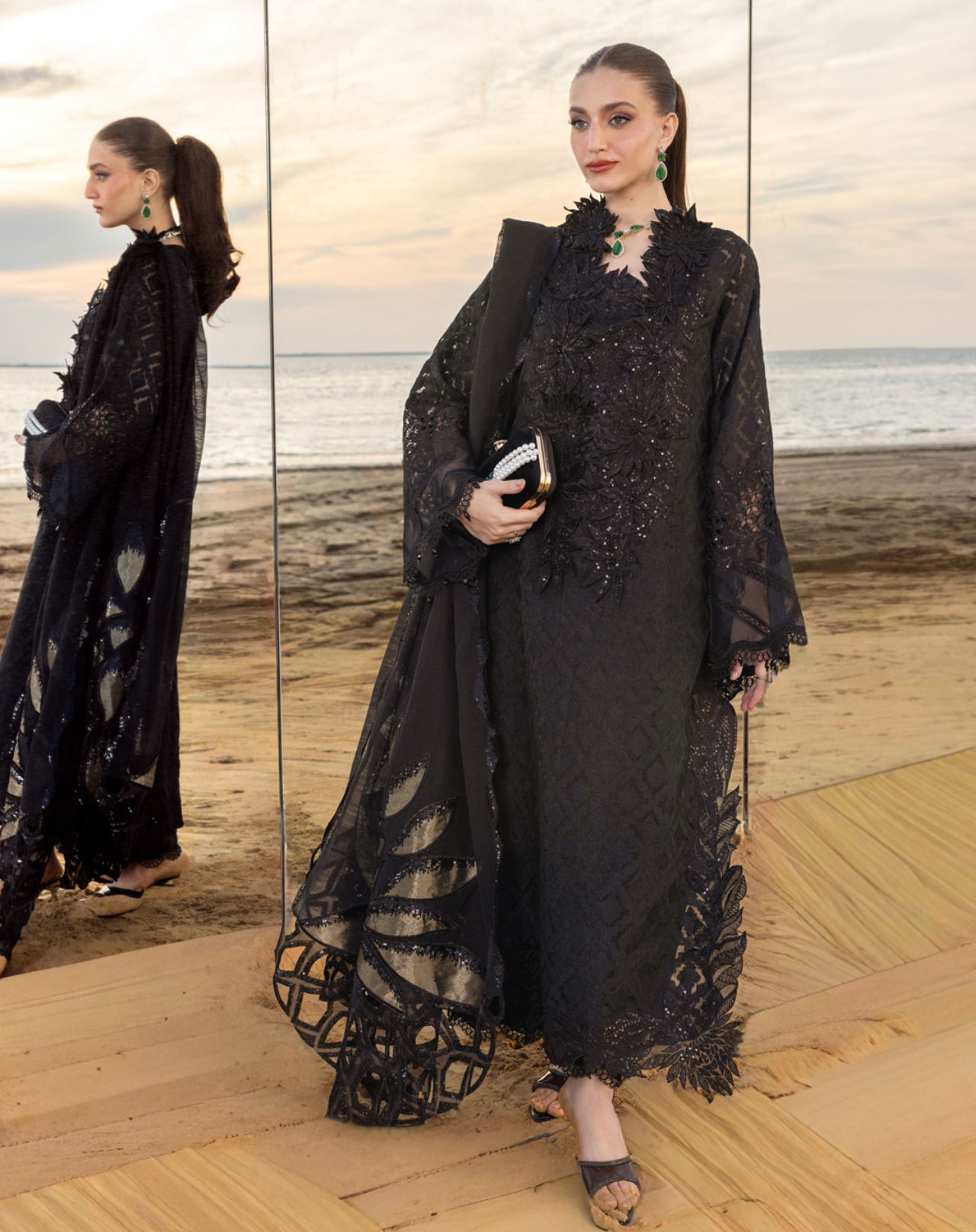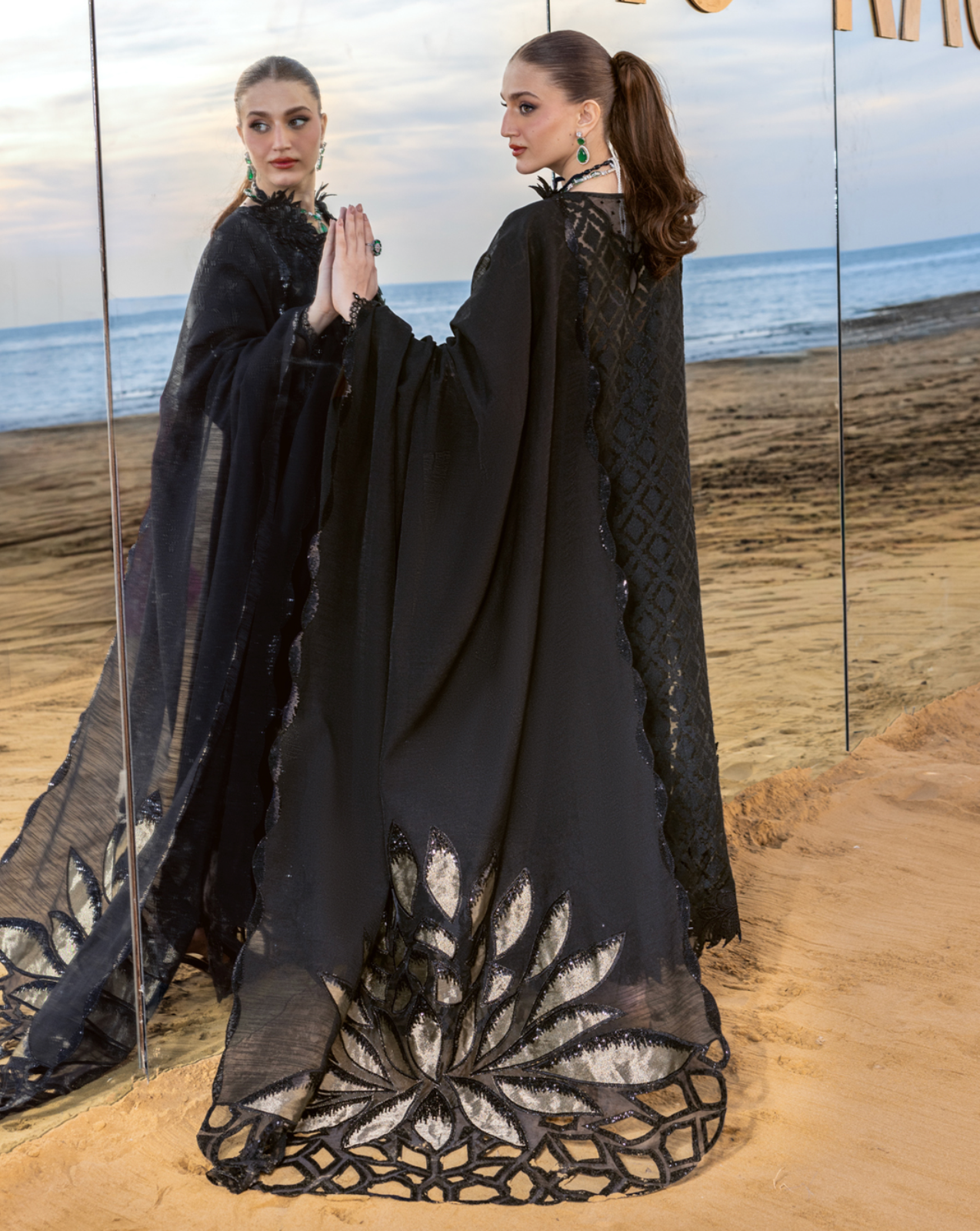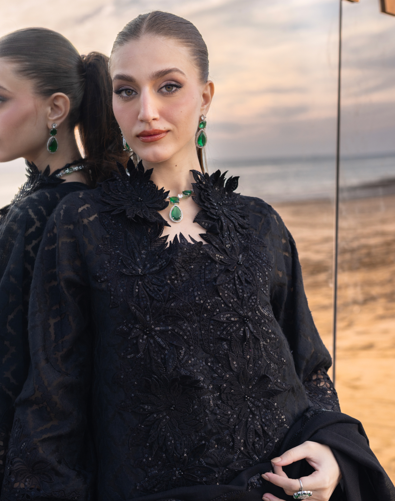 A striking black ensemble featuring a brosha-embellished shirt with a heavily worked neckline, adorned with sequins and delicate 3D florals. The dupatta is finished with laser-cut zari organza patches and shimmering sequin details, adding depth and elegance to the look.