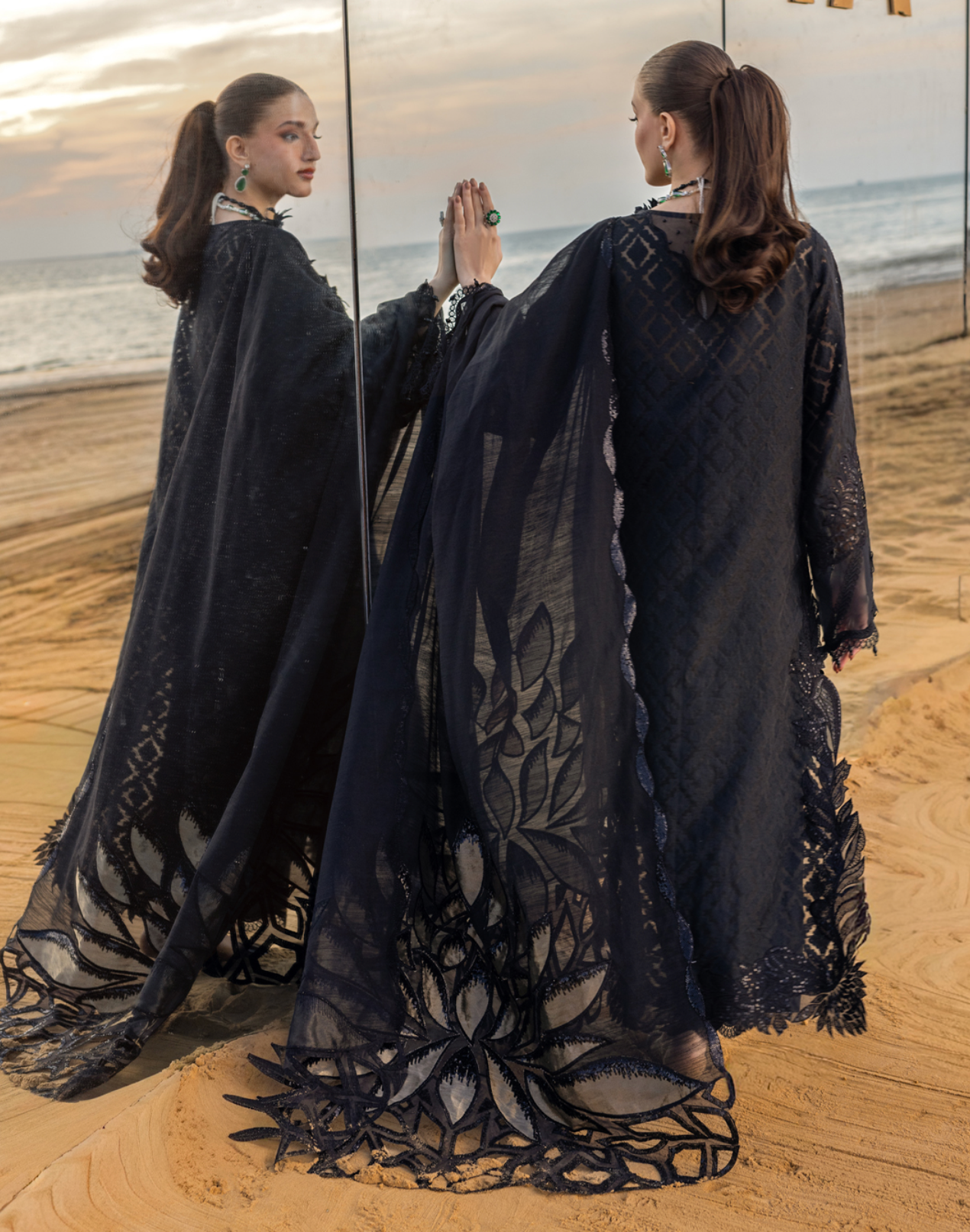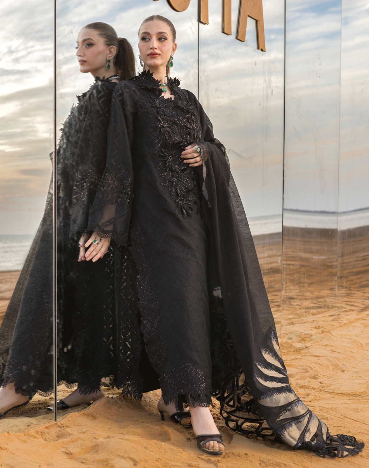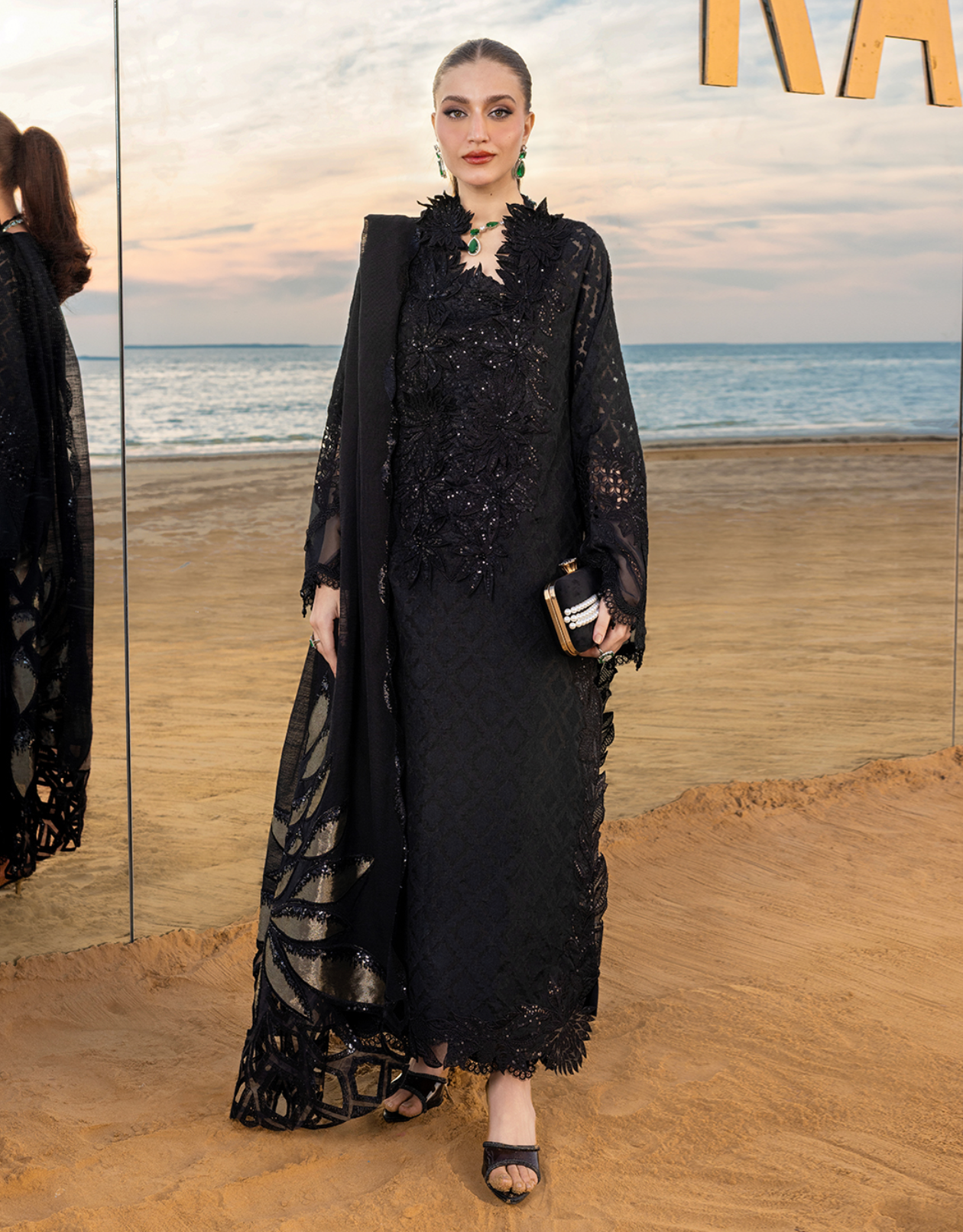 A striking black ensemble featuring a brosha-embellished shirt with a heavily worked neckline, adorned with sequins and delicate 3D florals. The dupatta is finished with laser-cut zari organza patches and shimmering sequin details, adding depth and elegance to the look.