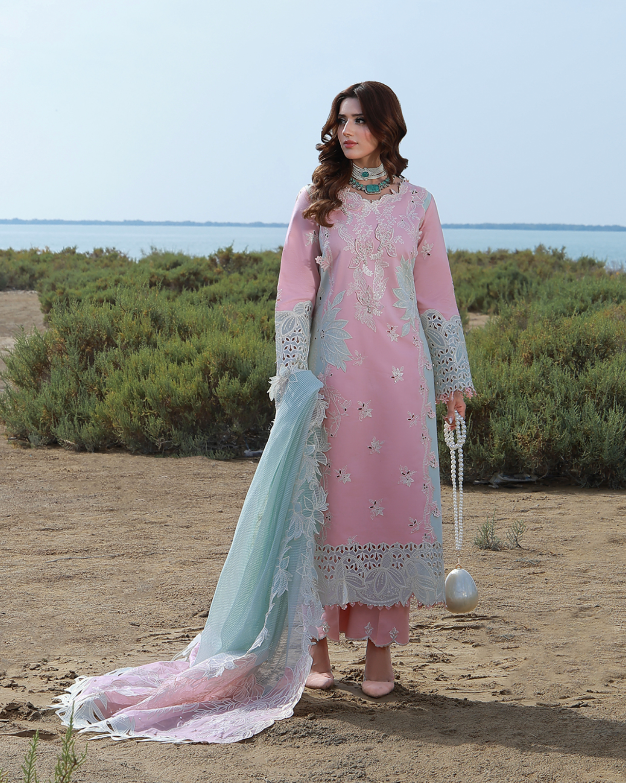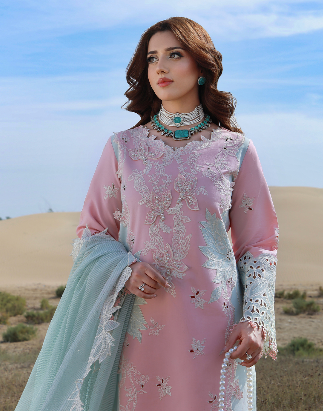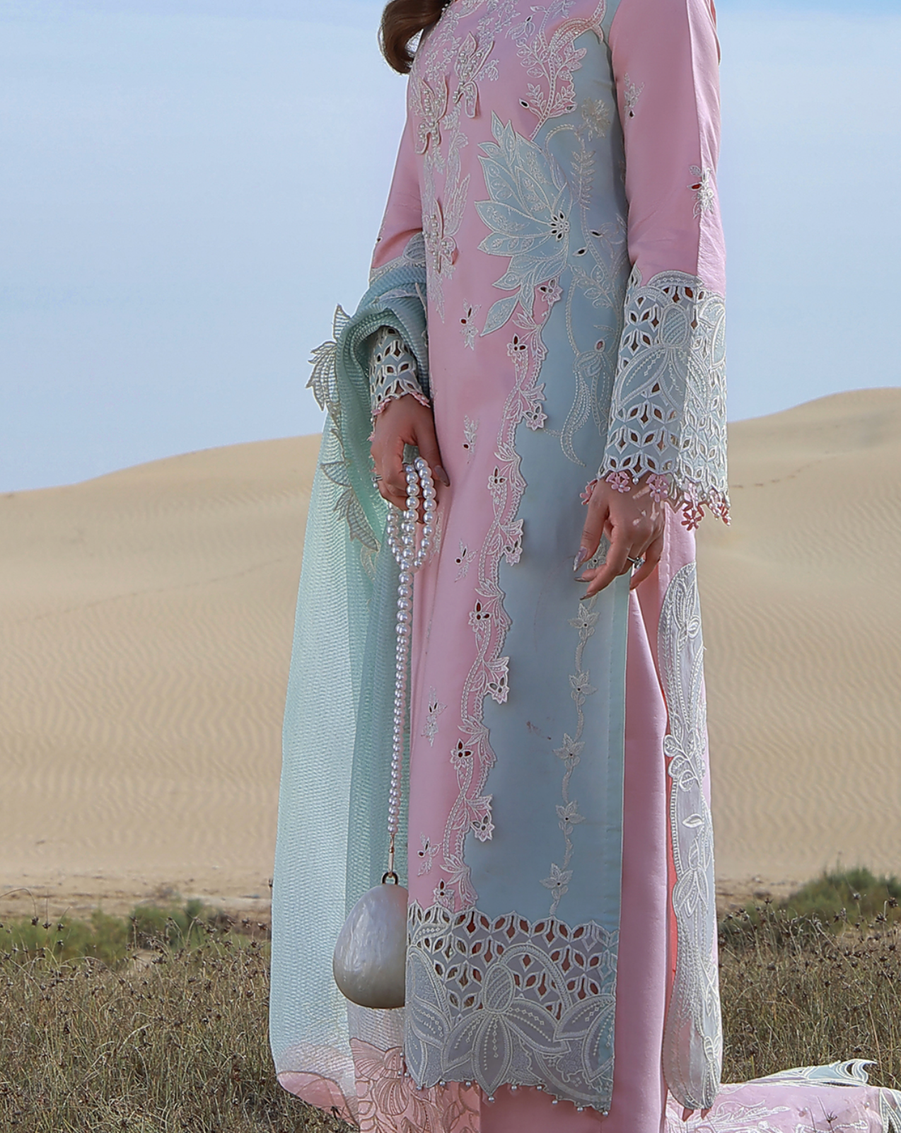 A pastel color-blocked ensemble featuring aesthetical panels, with 3D embroidered and delicately embellished motifs at the neckline. Finished with embroidered sleeves and a detailed shirt front border. The highlight of this outfit is the jacquard dupatta with dual coloured pallu patches for a modern. graceful statement.