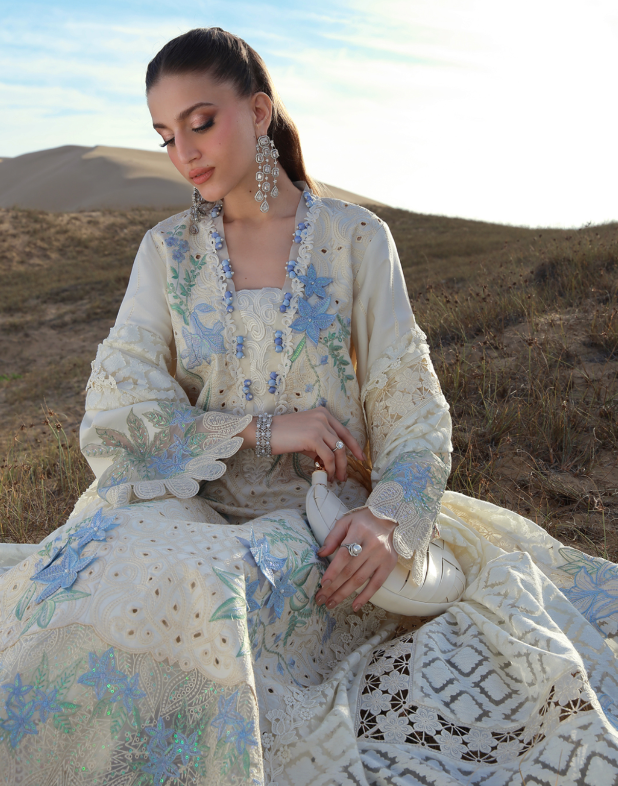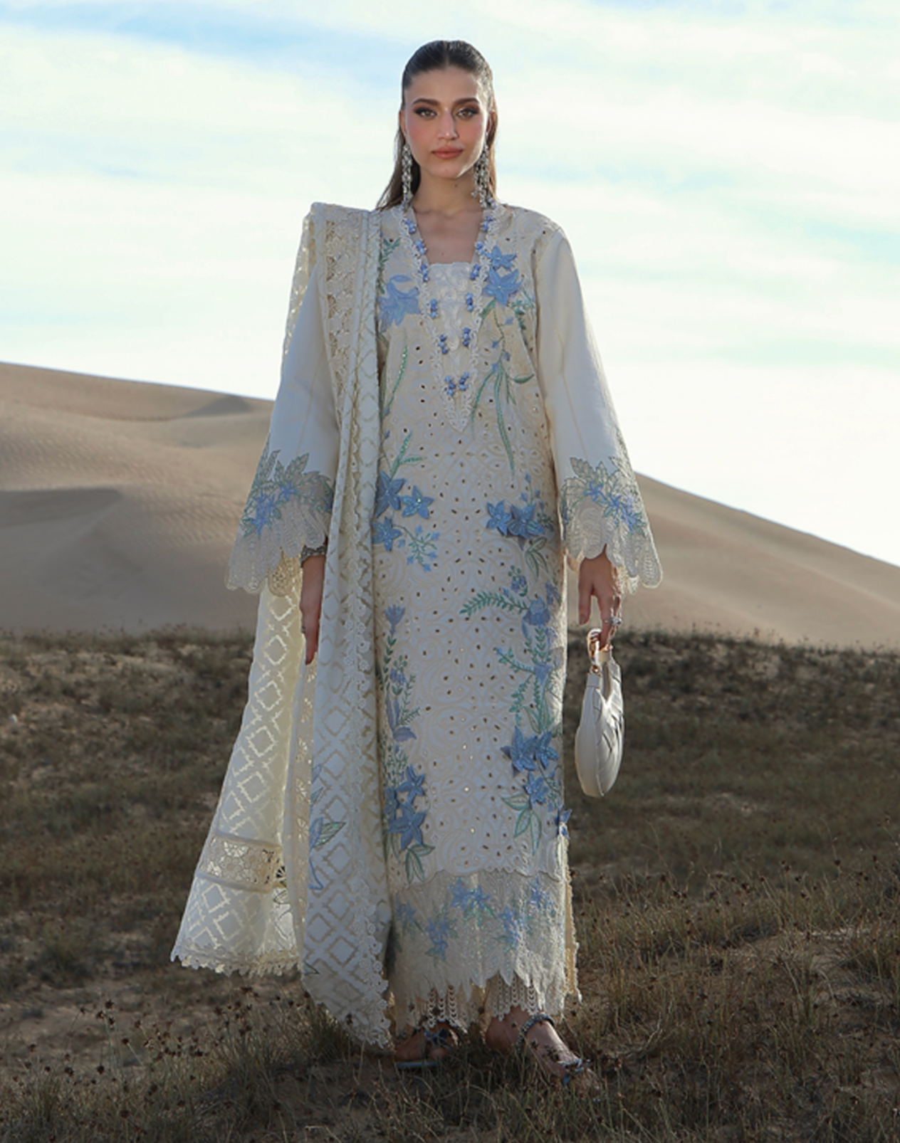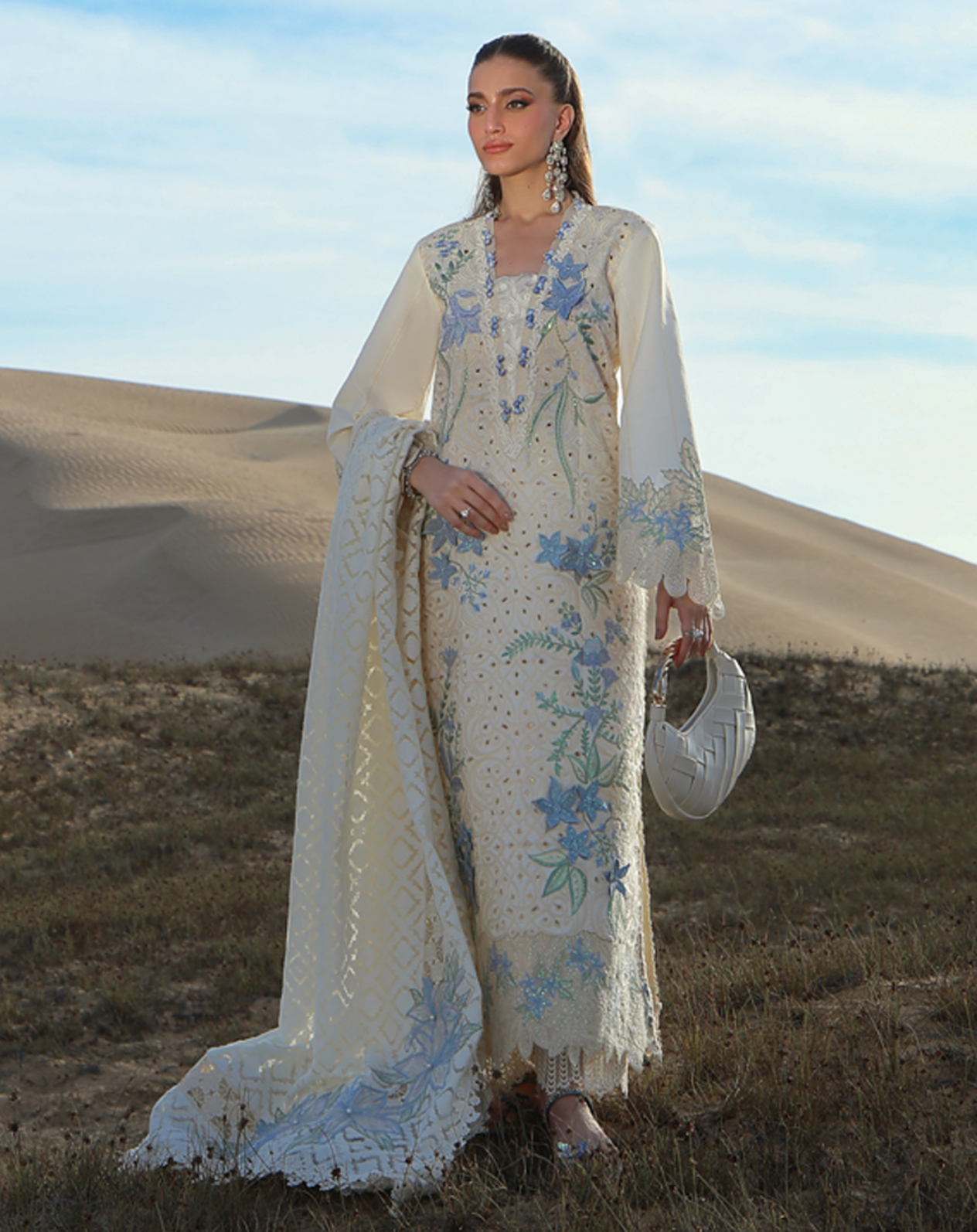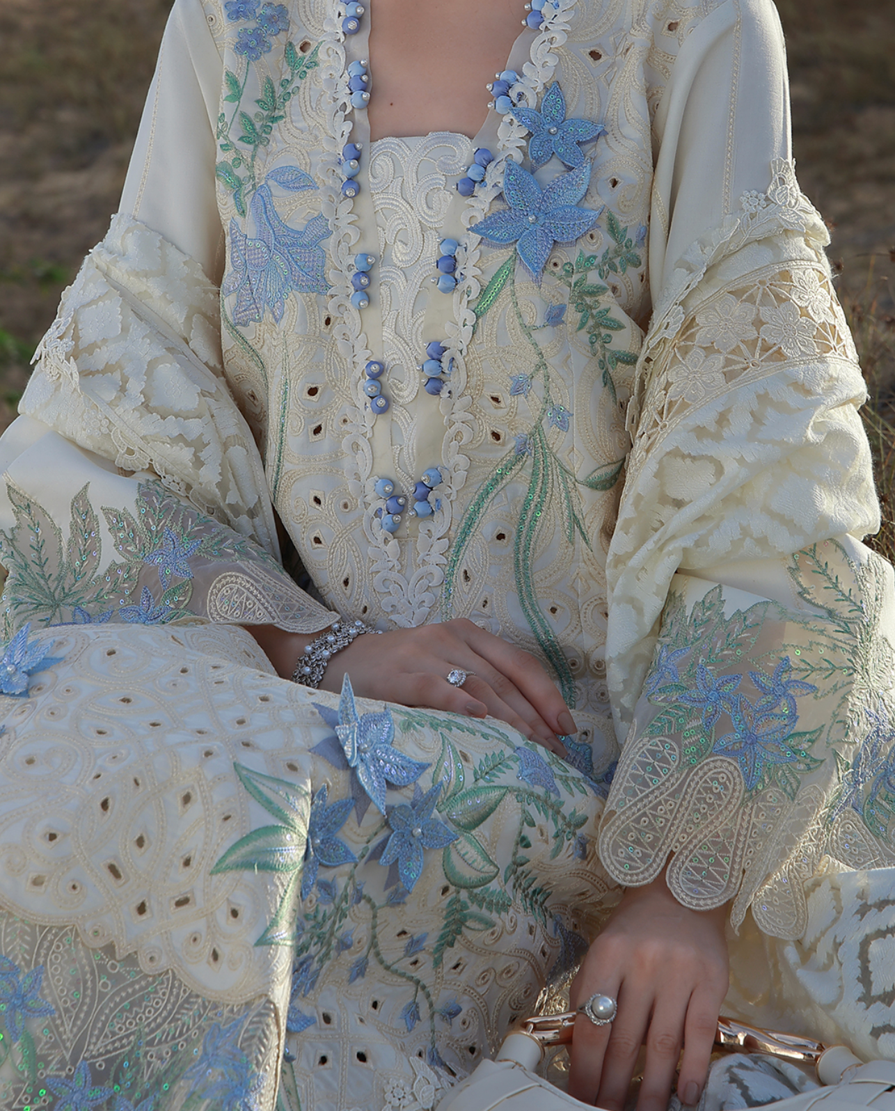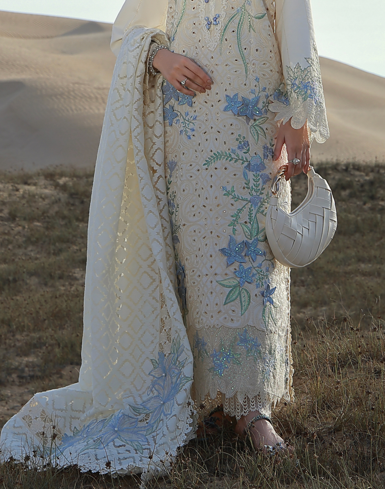 A serene blend of off-white and pastels , this outfit is crafted on a lawn schiffli base and adorned with graceful brocade dupatta with 3D florals. Luxury embroidery flows like art across the fabric, creating a look that feels fresh, refined, and effortlessly elegant.