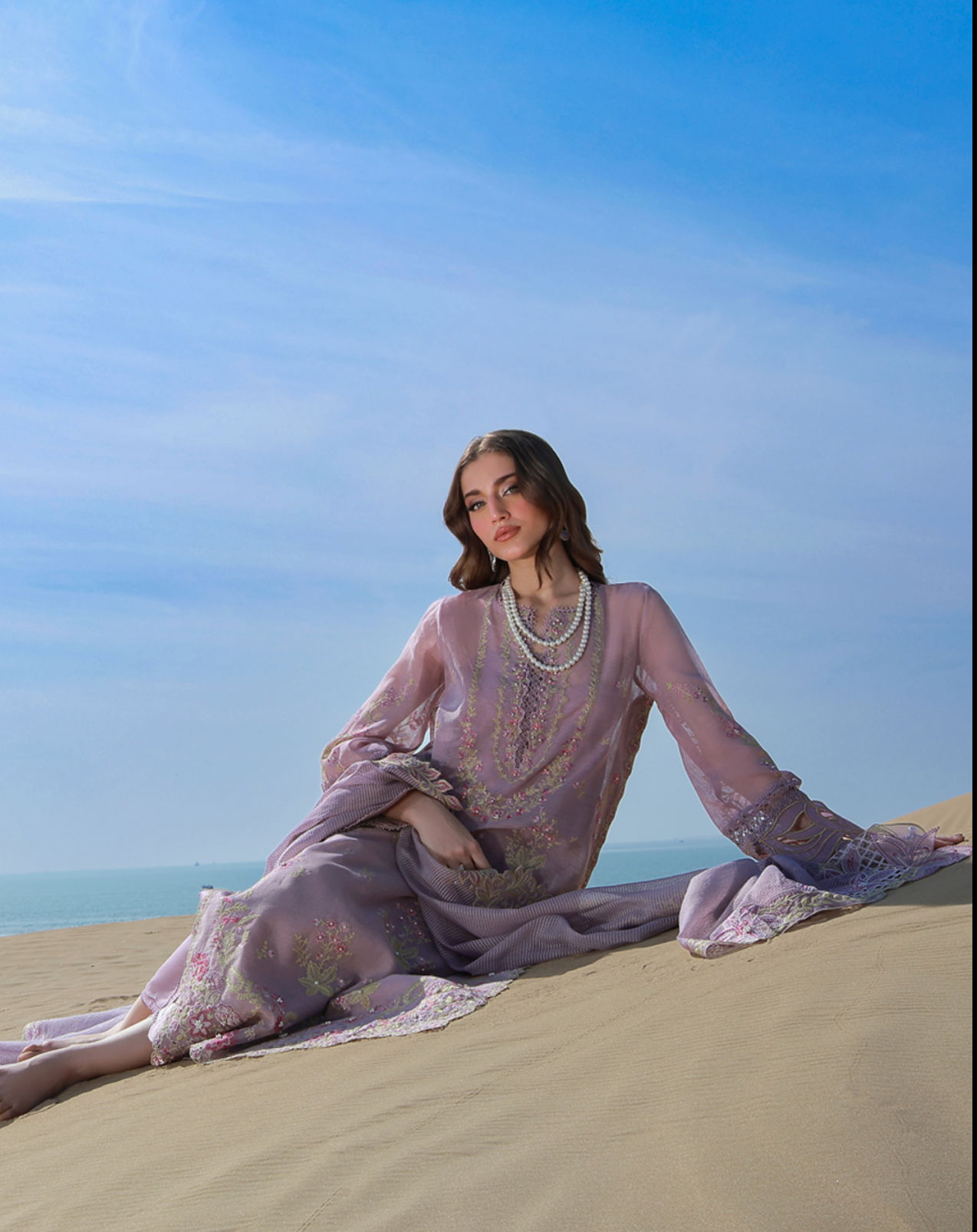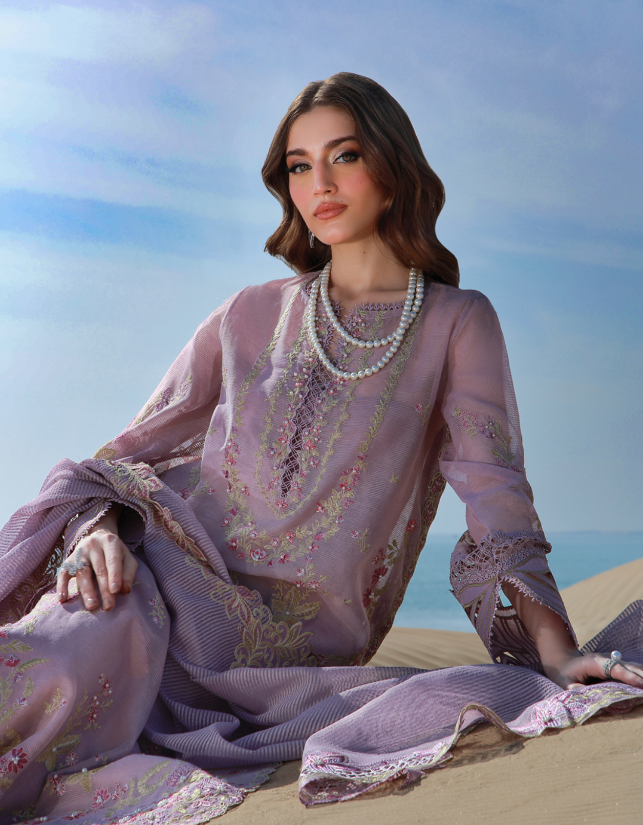 Lilac jacquard khaadi net ensemble with pearl-embellished embroidery on the front and sleeves, finished with refined organza borders. Paired with an embroidered dupatta featuring detailed patches and an embroidered pallu for a graceful finish.