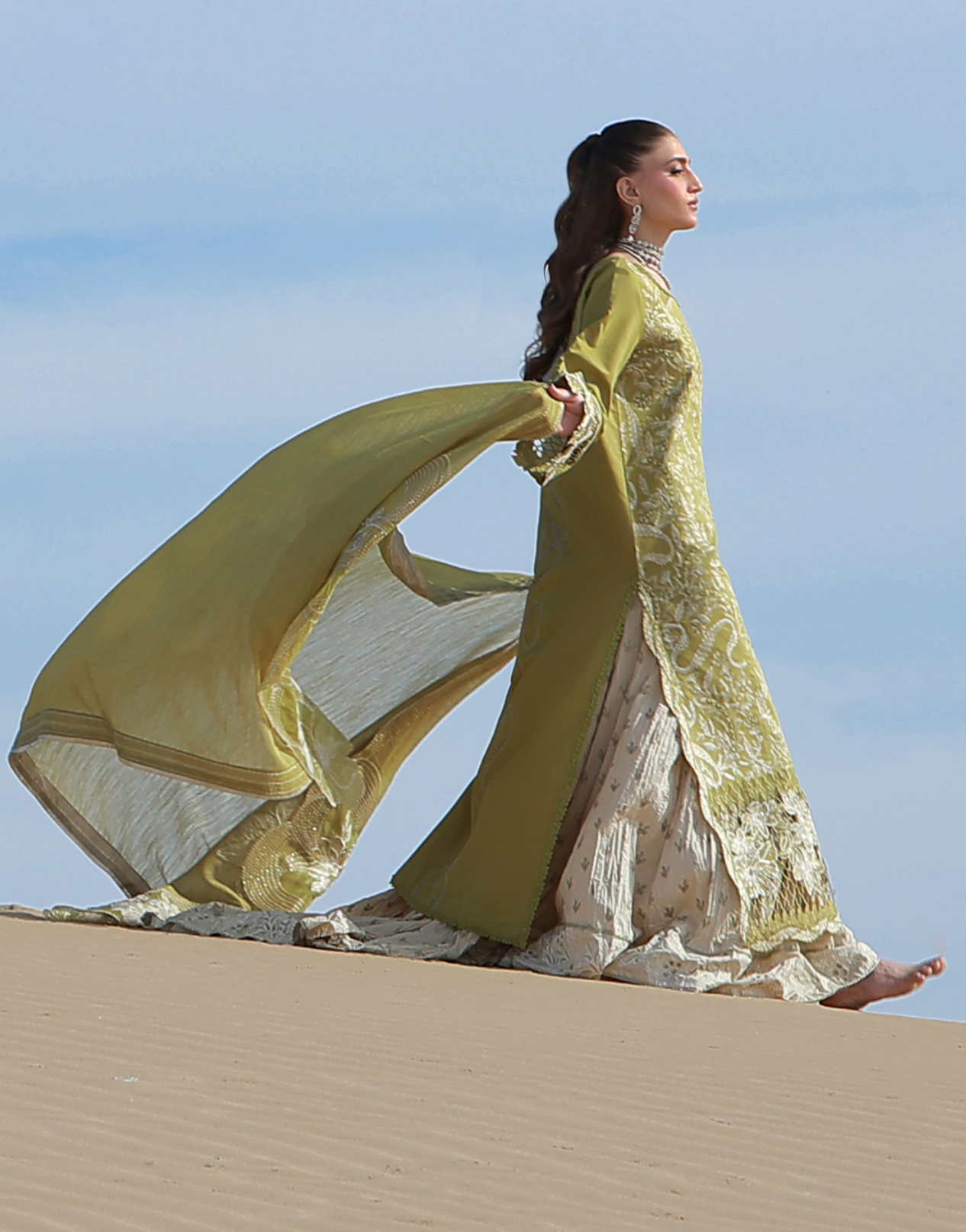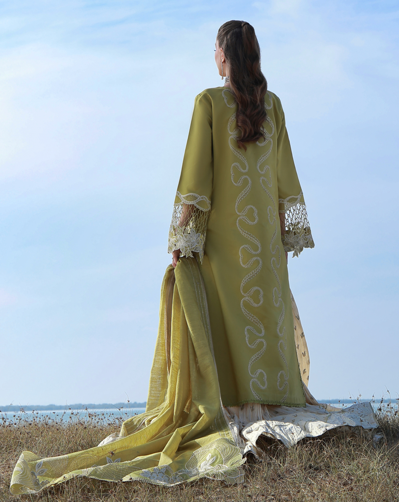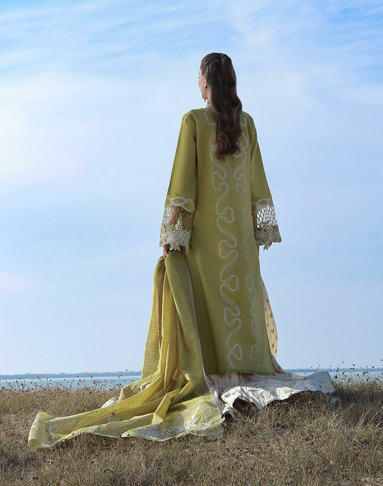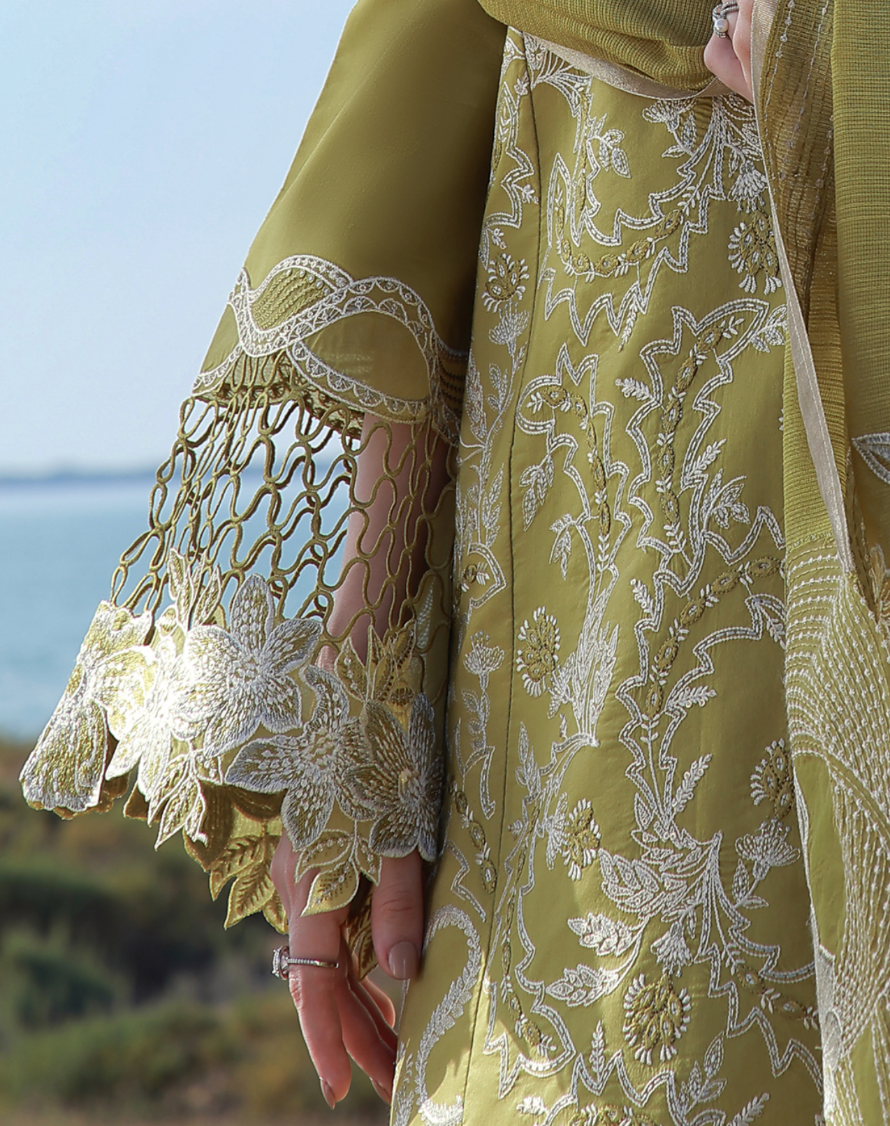 An Olive Green ensemble featuring embroidered shirt front adorned with panni and sequin details, highlighted with a statement neckline and contemporary sleeve patches. Finished with a front cutwork patch and delicate 3D lace accents. The look is completed gracefully with an embroidered dupatta pallu with sequins details for a refined and elegant look.