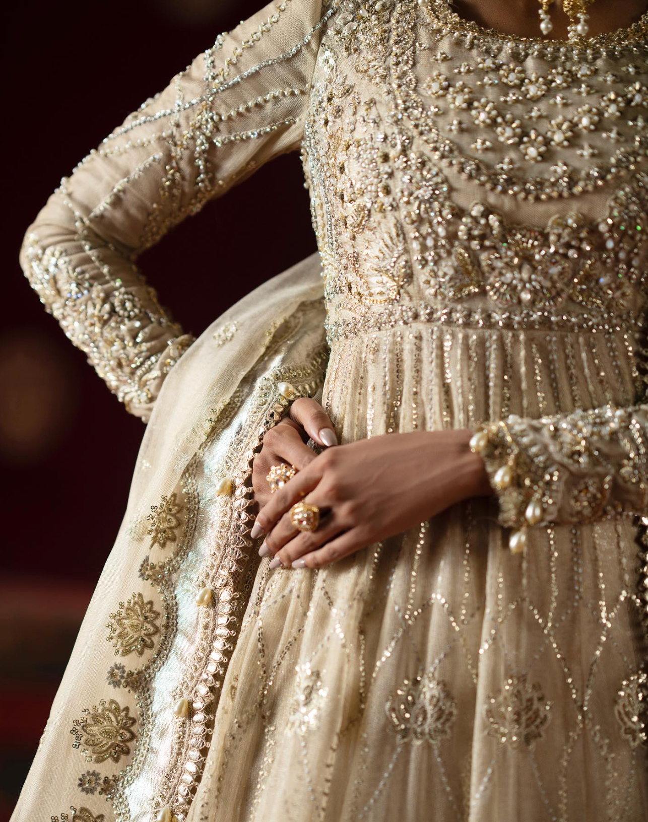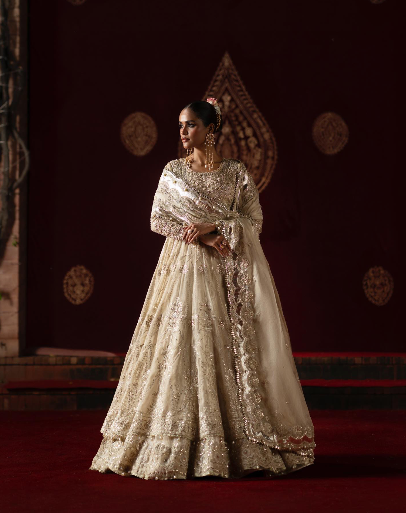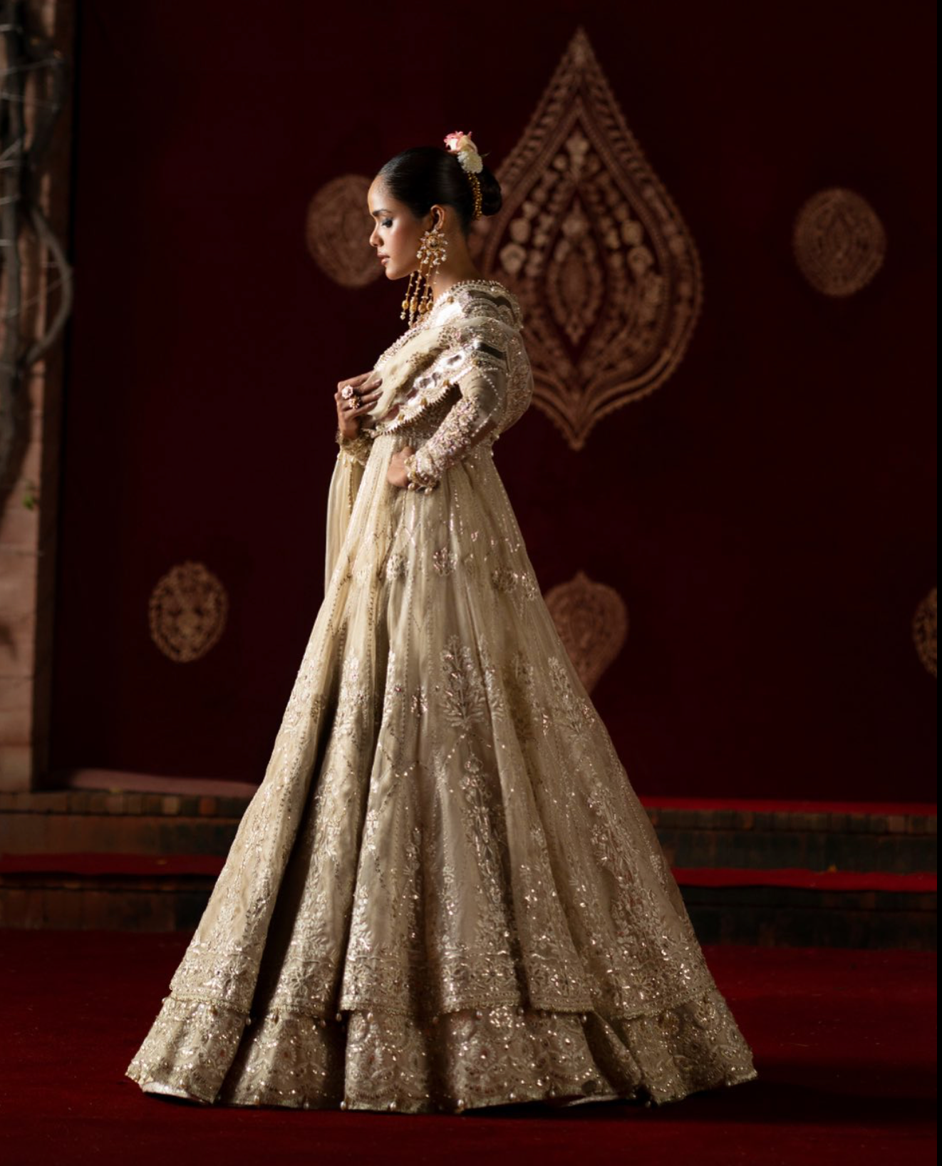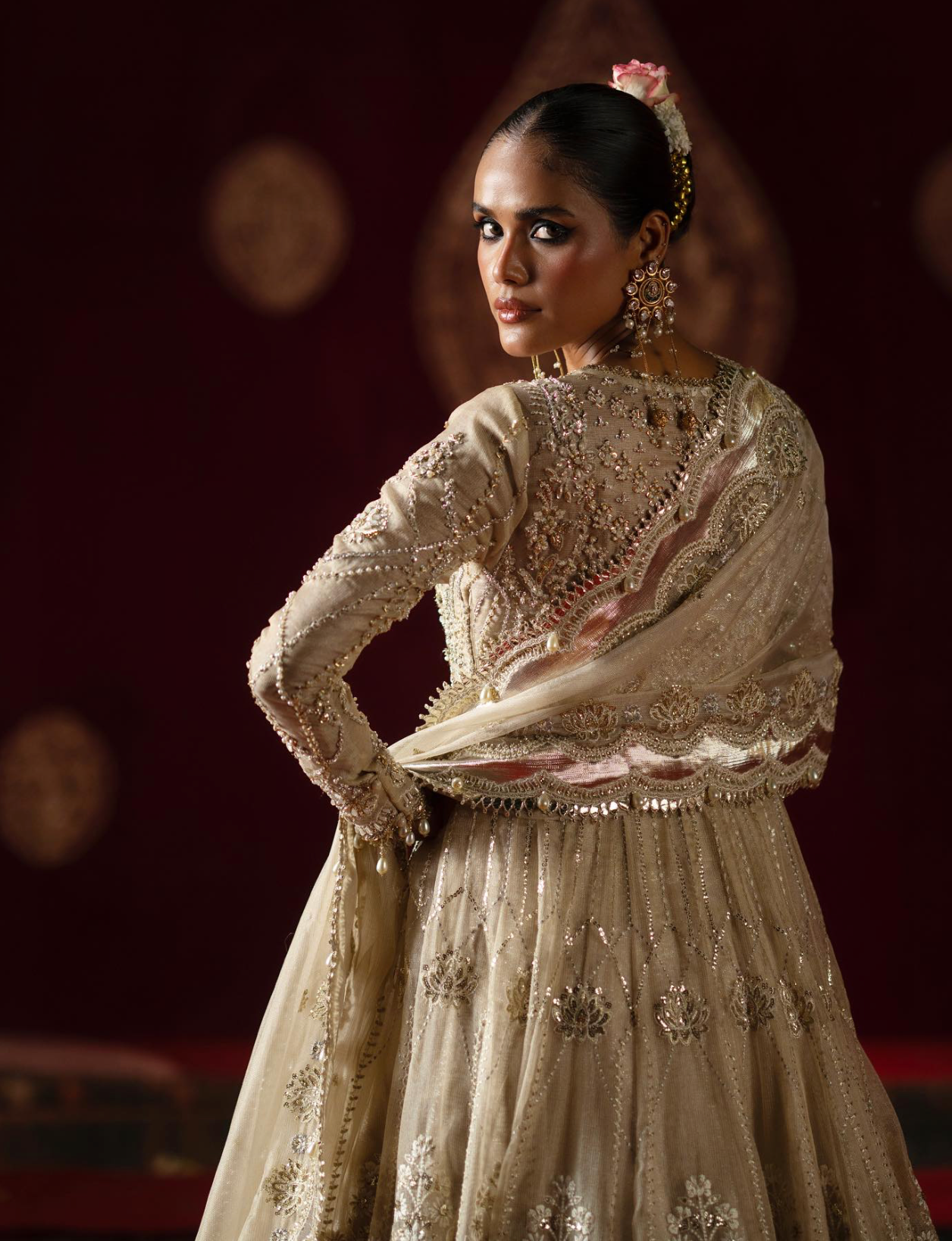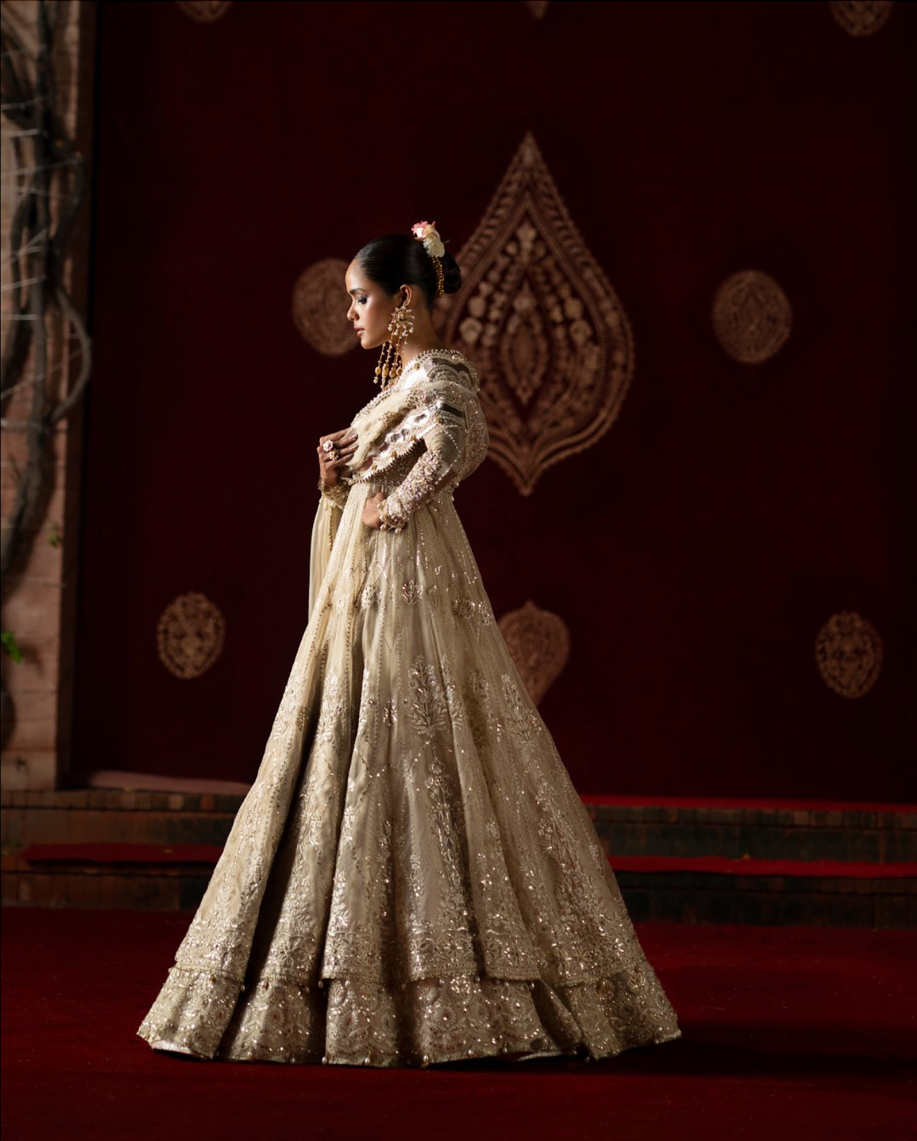 An opulent gold chanderi net tissue double-layered pishwas, adorned with intricate embroidery and delicate handwork details that exude timeless elegance. Paired with a regal jamawar lehnga and a graceful chanderi net dupatta, this ensemble is a perfect blend of tradition and luxury.