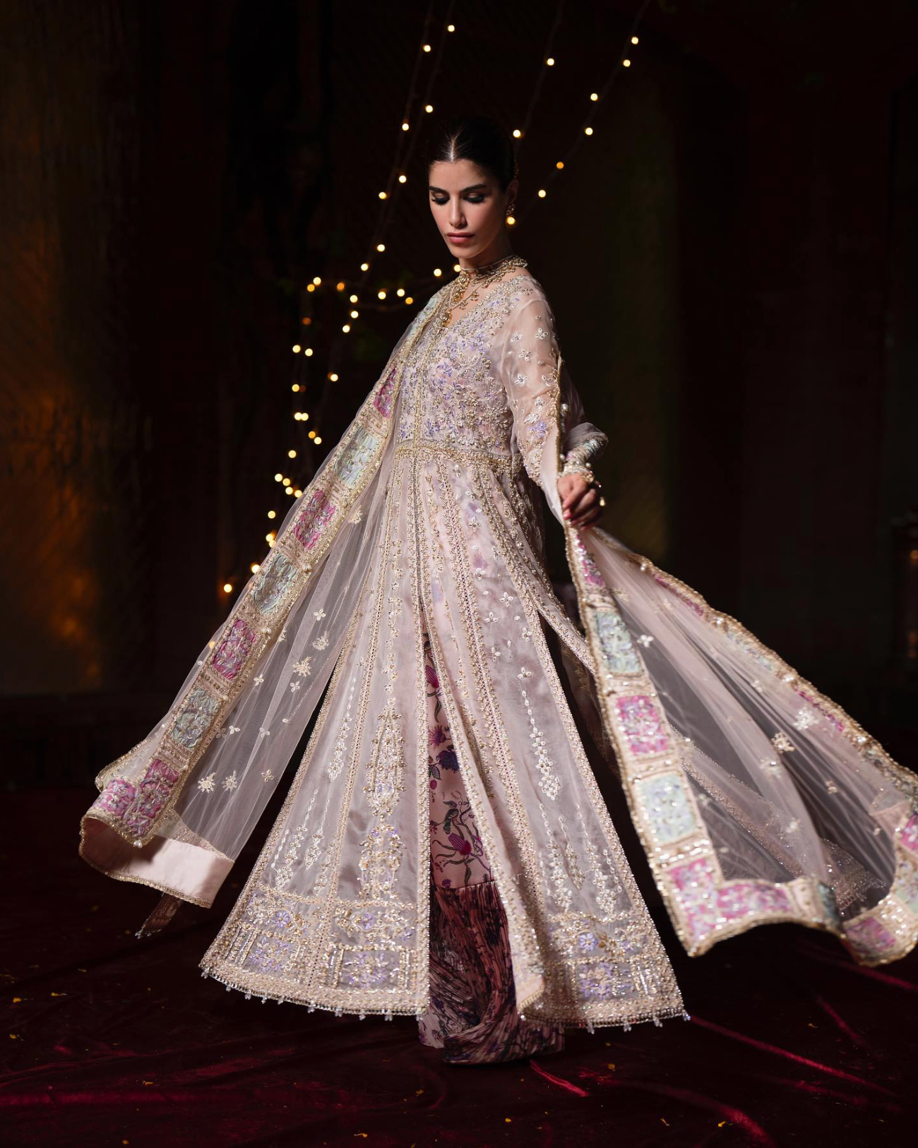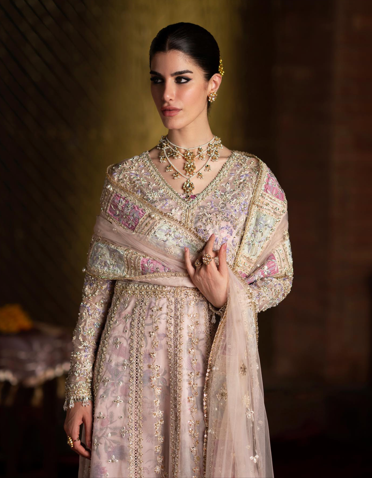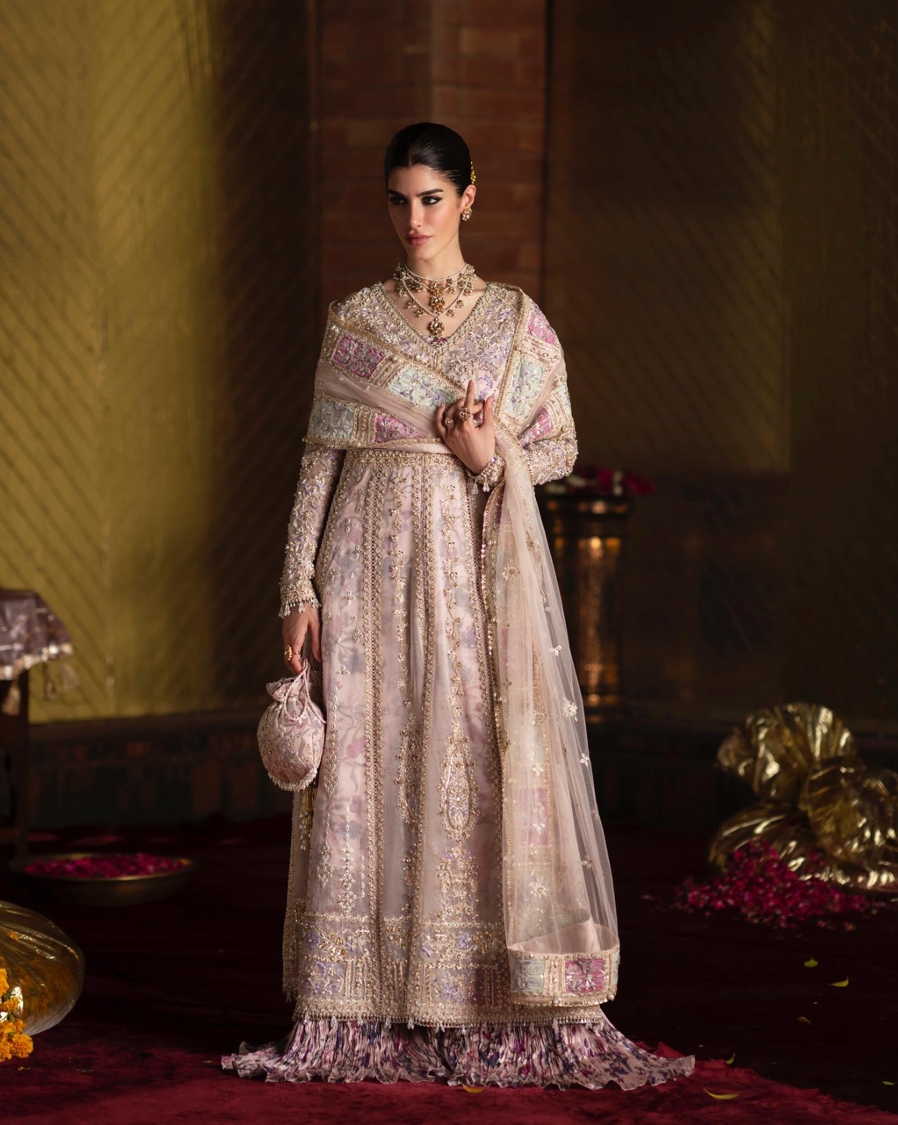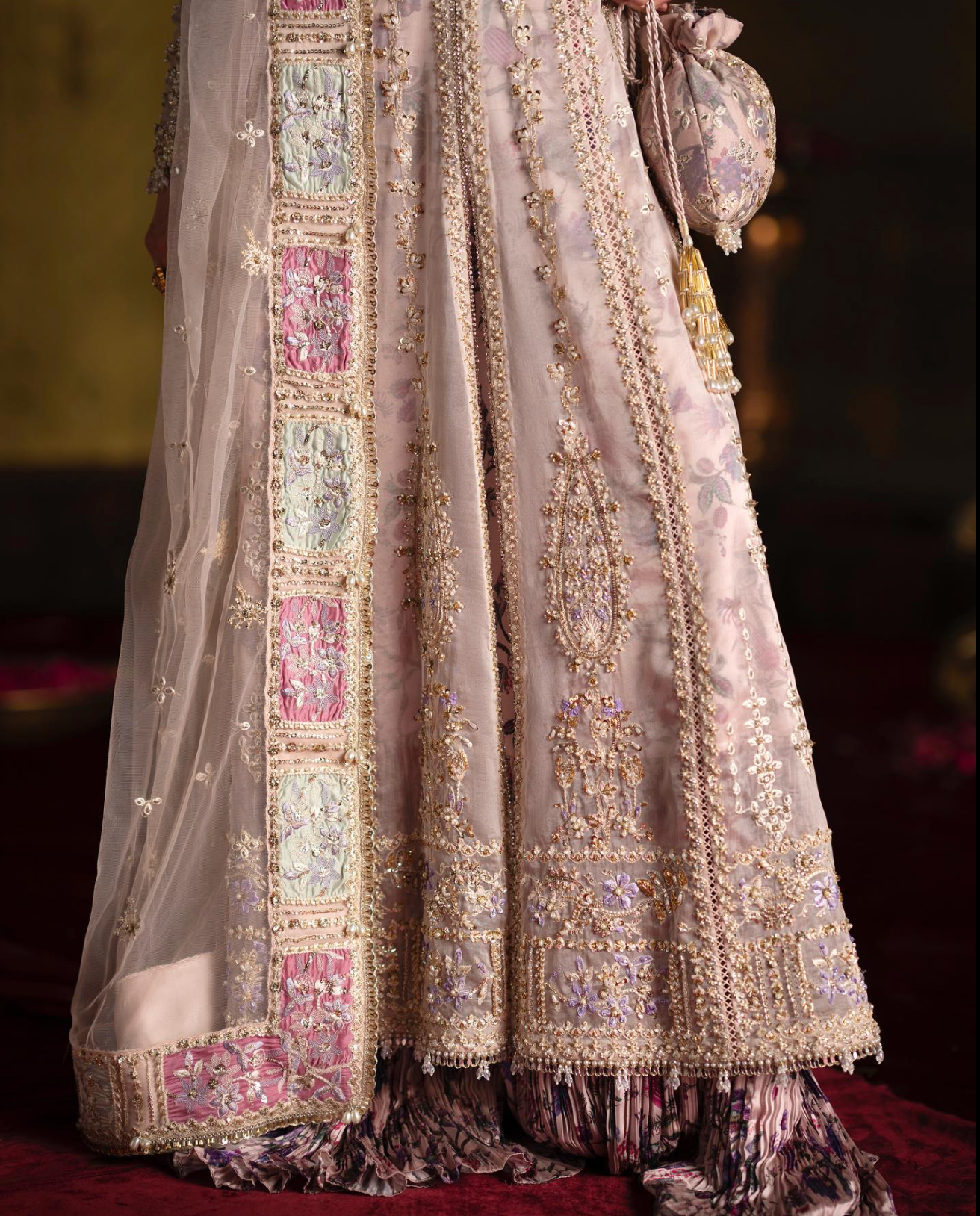This Illic Pink Dress is a statement of elegance and uniqueness. Designed with a distinctive cut line, it features exquisite embroidery and delicate handwork. The look is elevated with a beautifully printed under-dress, paired with graceful sharara pants, and completed with a stunning dupatta that ties the whole ensemble together. A perfect blend of tradition and modern artistry