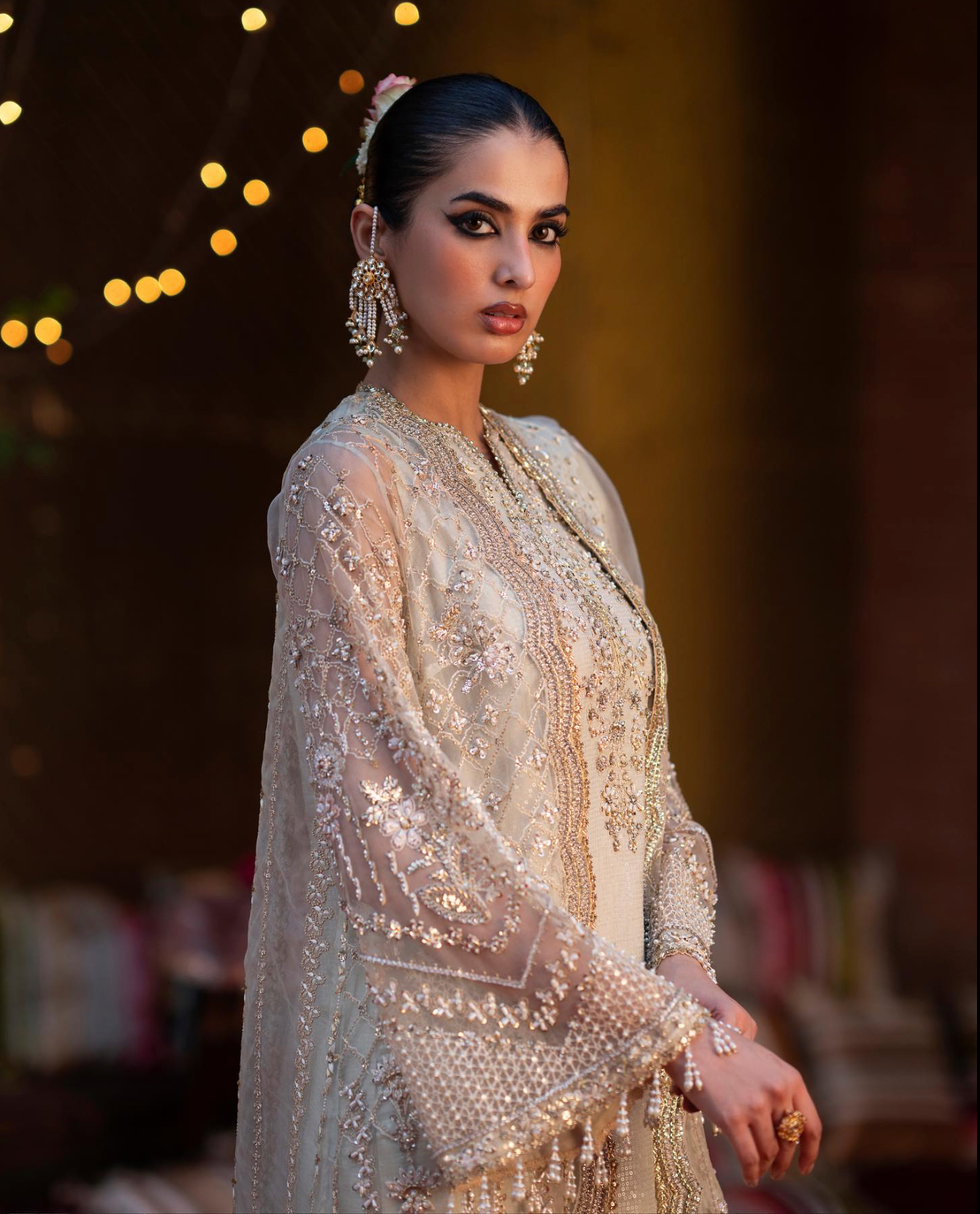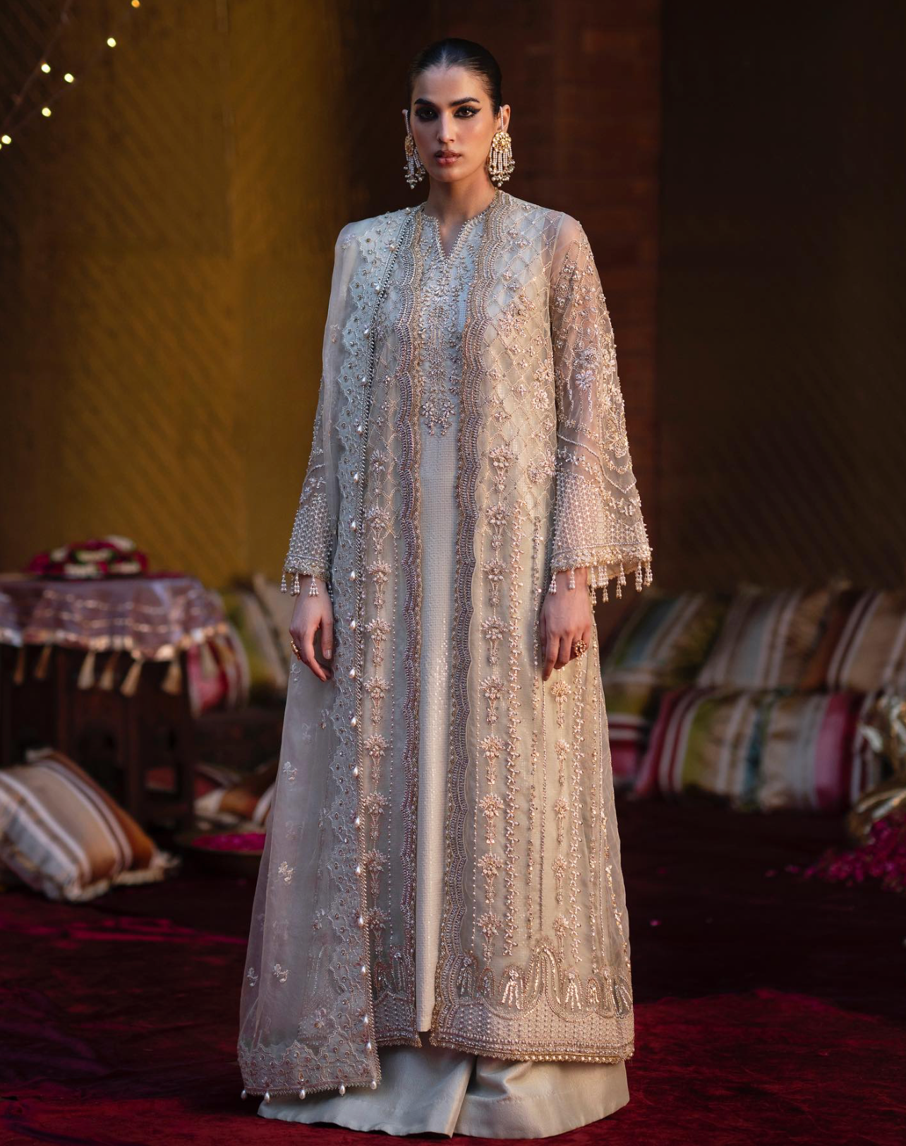This Illic Pink Dress is a statement of elegance and uniqueness. Designed with a distinctive cut line, it features exquisite embroidery and delicate handwork. The look is elevated with a beautifully printed under-dress, paired with graceful sharara pants, and completed with a stunning dupatta that ties the whole ensemble together. A perfect blend of tradition and modern artistry