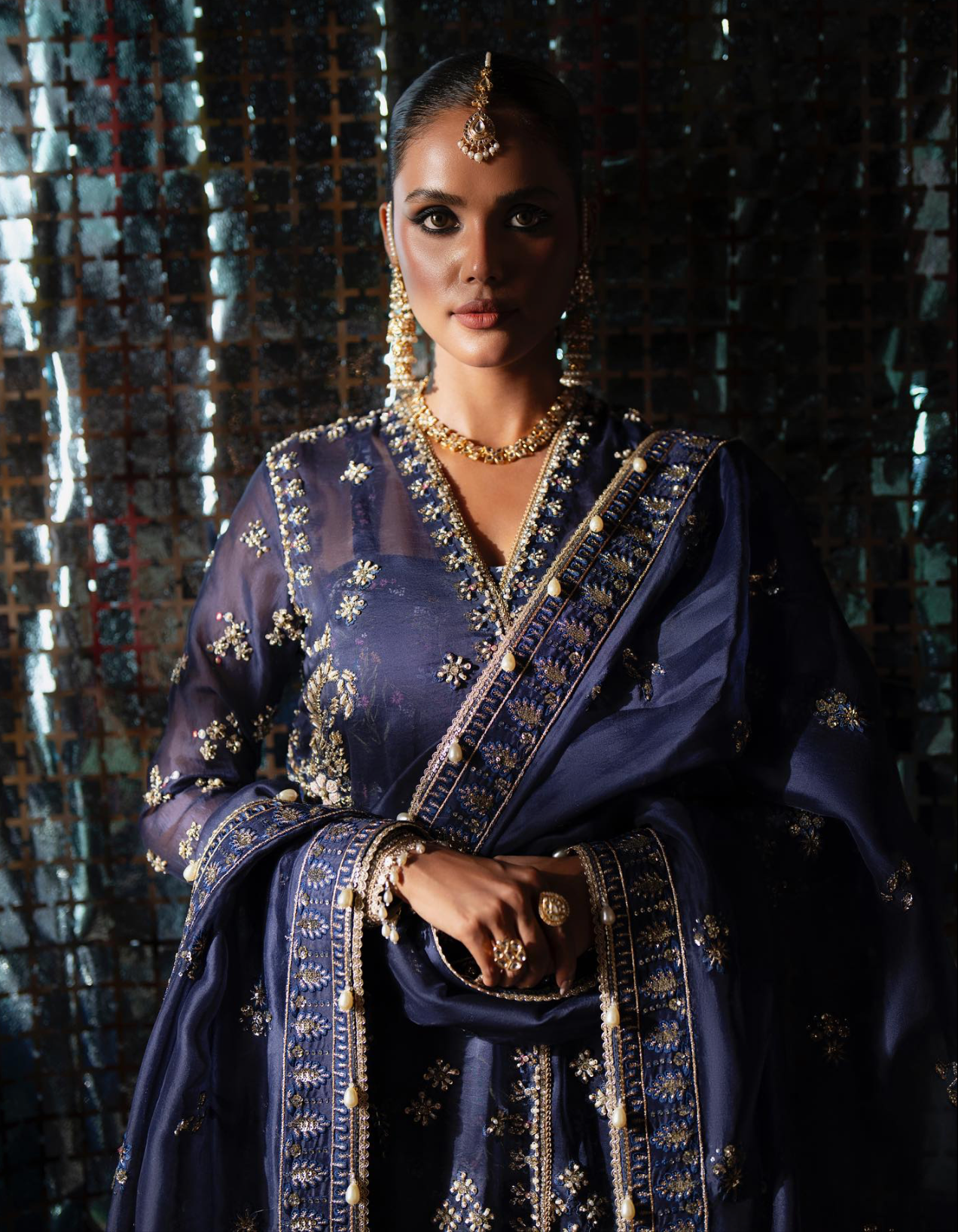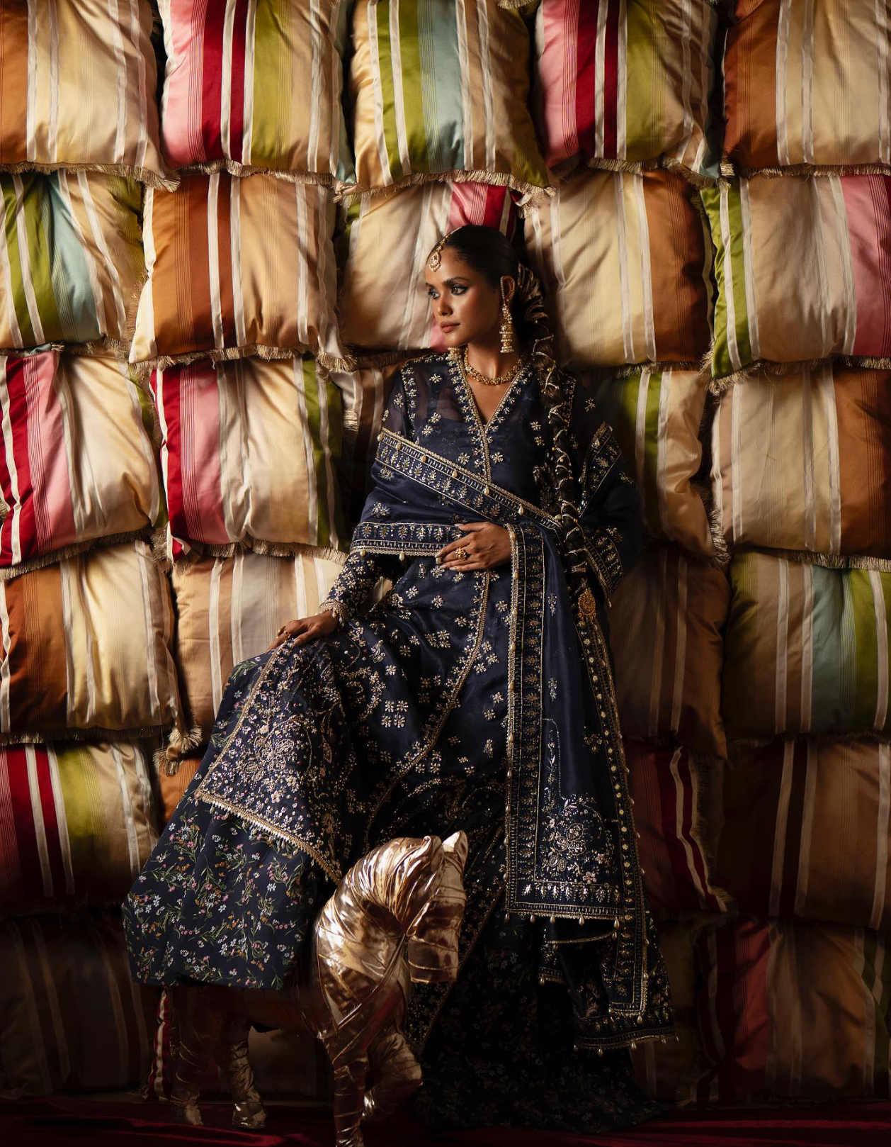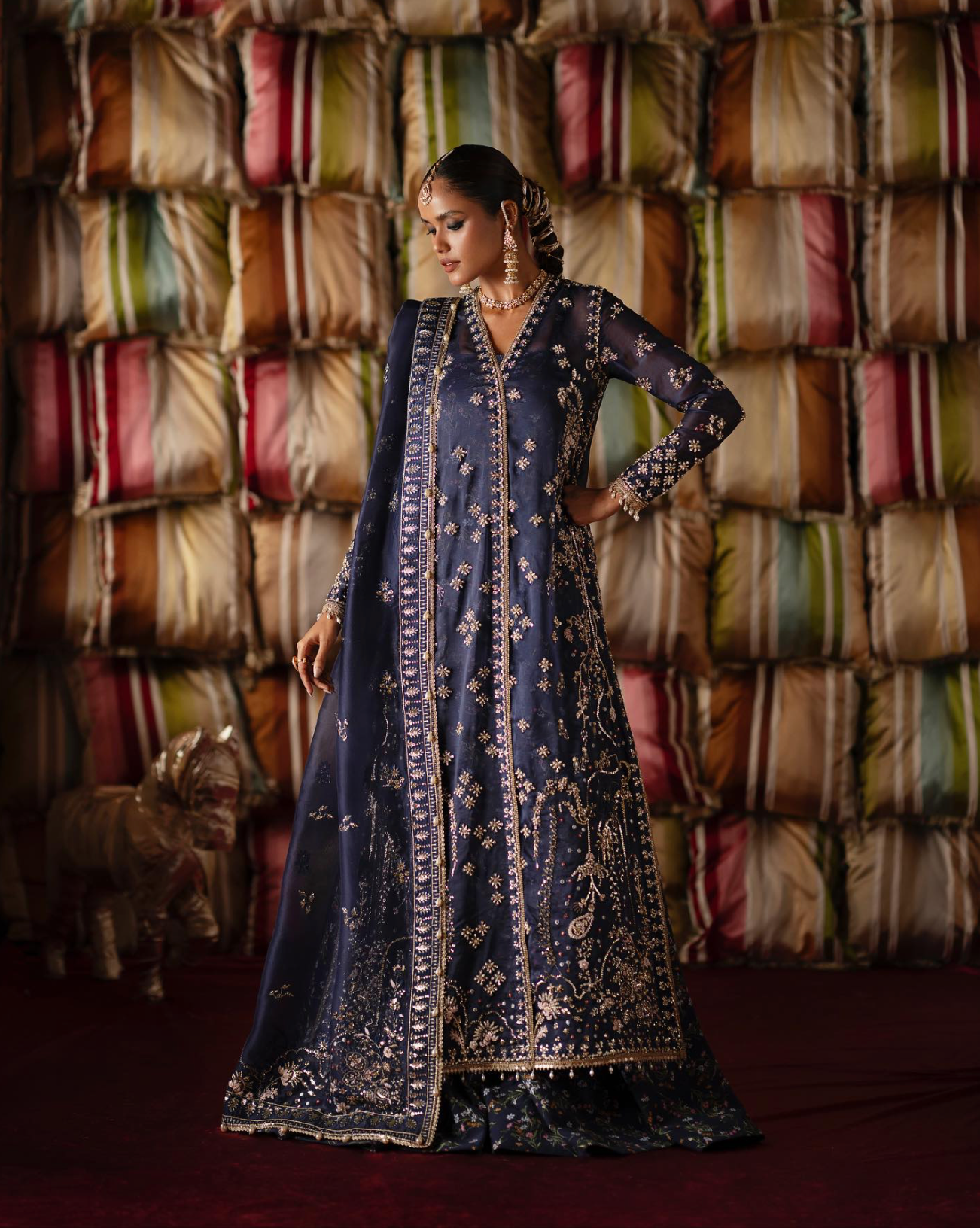A statement navy blue cross-style long shirt adorned with exquisite embroidery and delicate handwork. Paired with printed sharara pants and an undershirt for a graceful silhouette, this ensemble is elevated with a beautifully embroidered dupatta—perfect for timeless elegance.