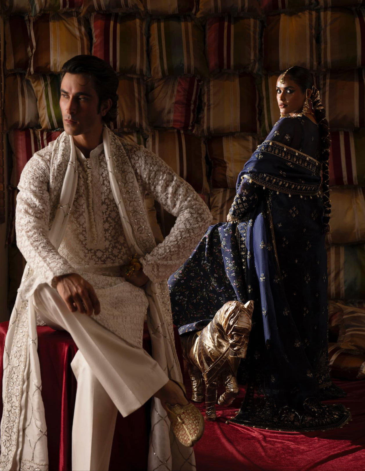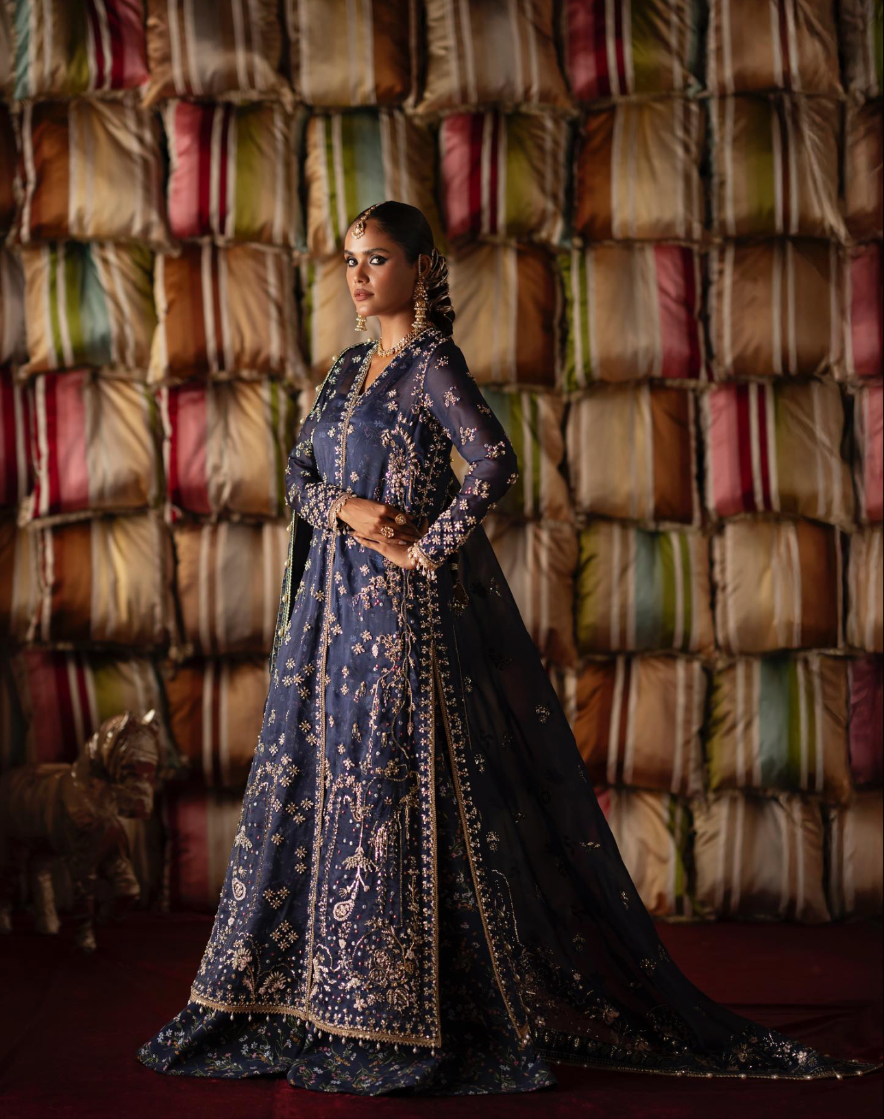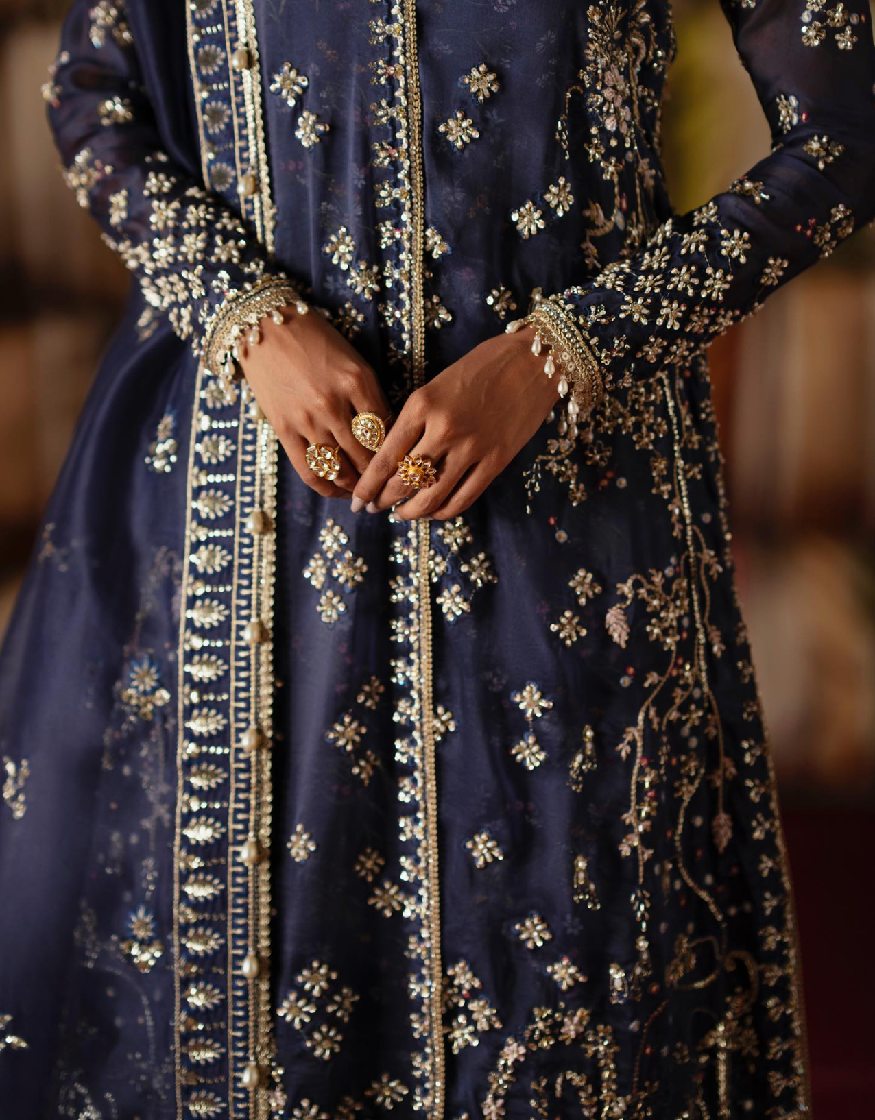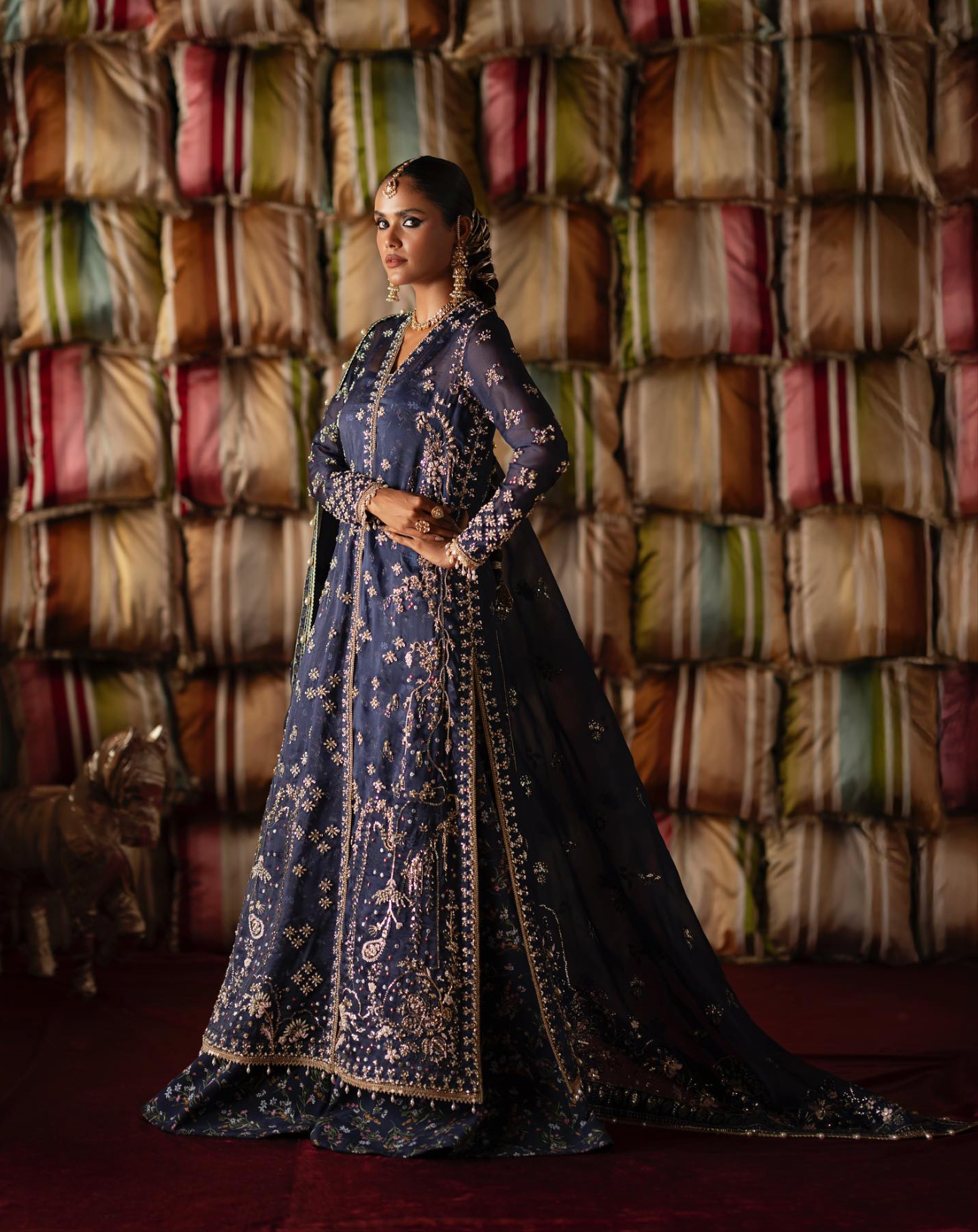 A statement navy blue cross-style long shirt adorned with exquisite embroidery and delicate handwork. Paired with printed sharara pants and an undershirt for a graceful silhouette, this ensemble is elevated with a beautifully embroidered dupatta—perfect for timeless elegance.