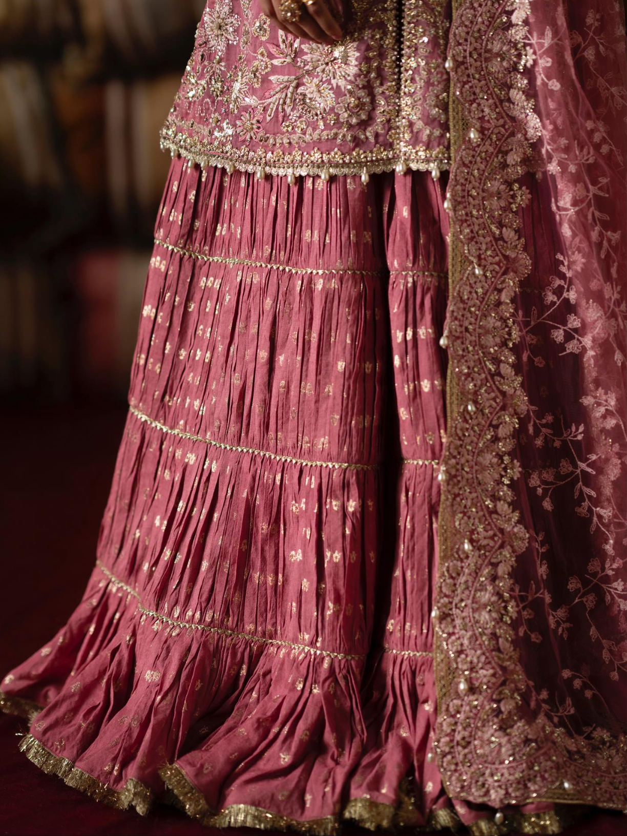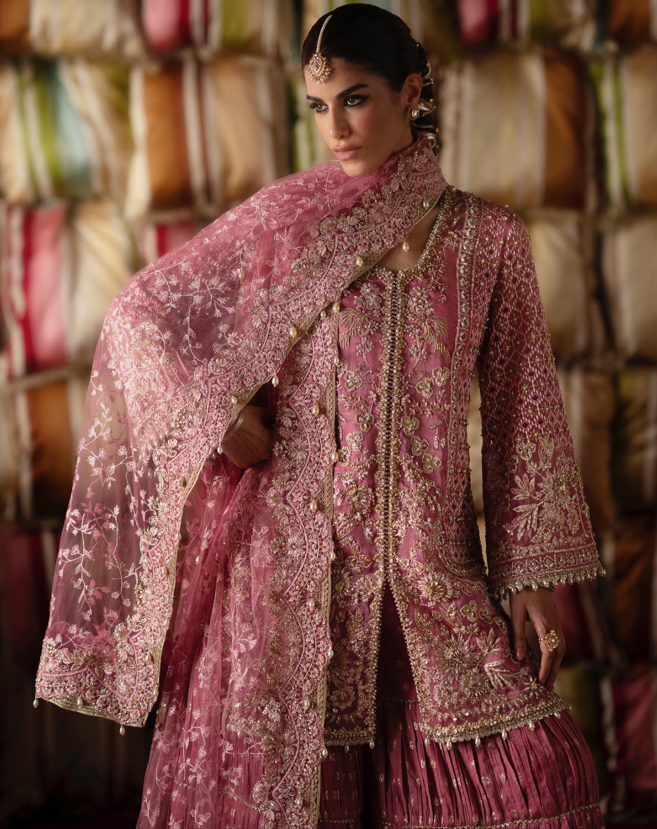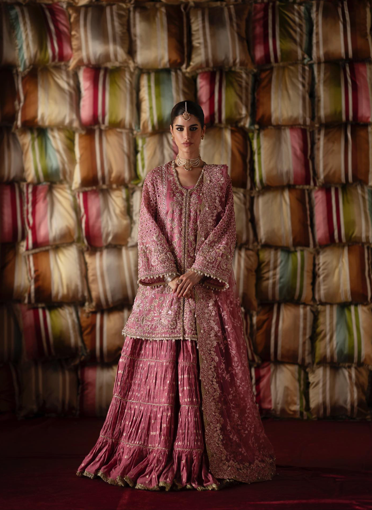 A dreamy candy pink short shirt adorned with intricate embroidery and delicate handwork, paired with elegant pleated gharara pants. The look is completed with a statement full heavy dupatta, creating the perfect blend of charm and sophistication.