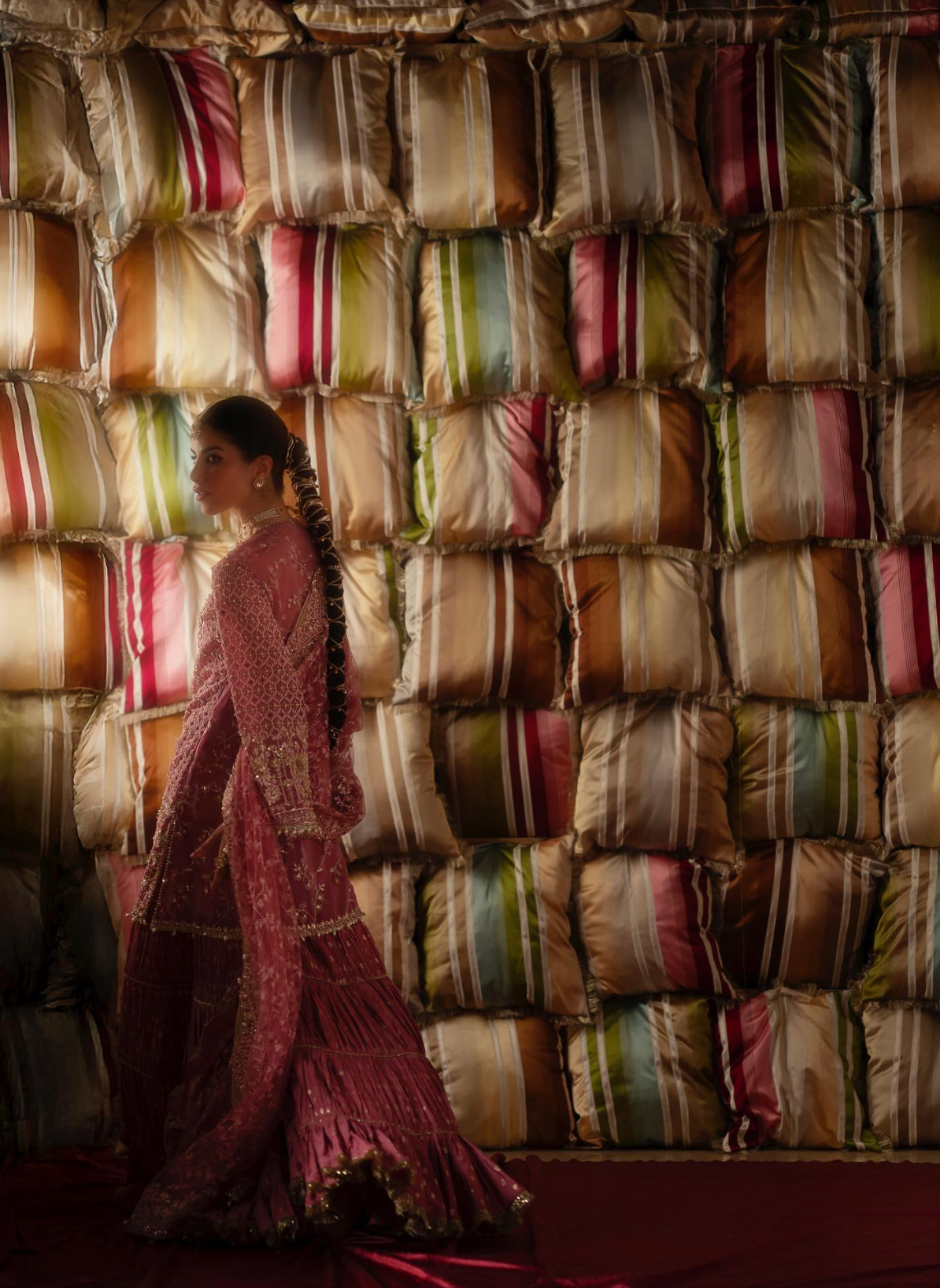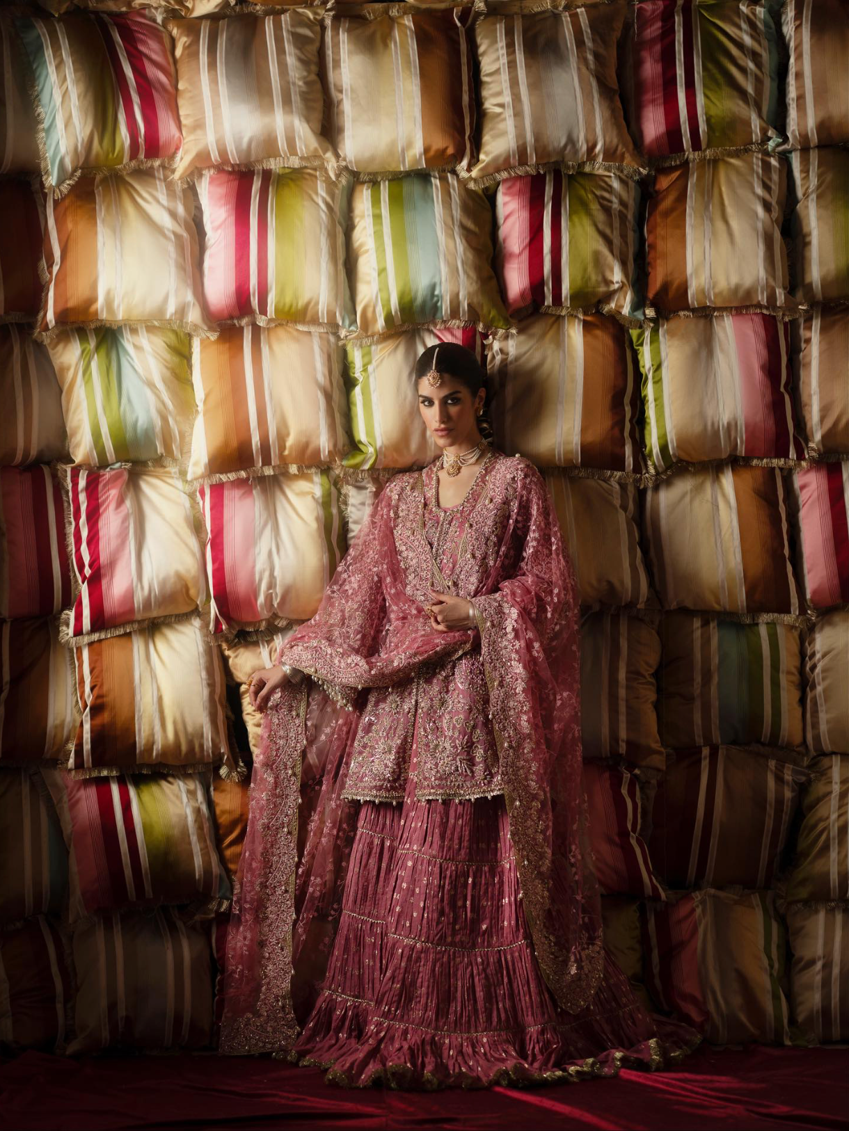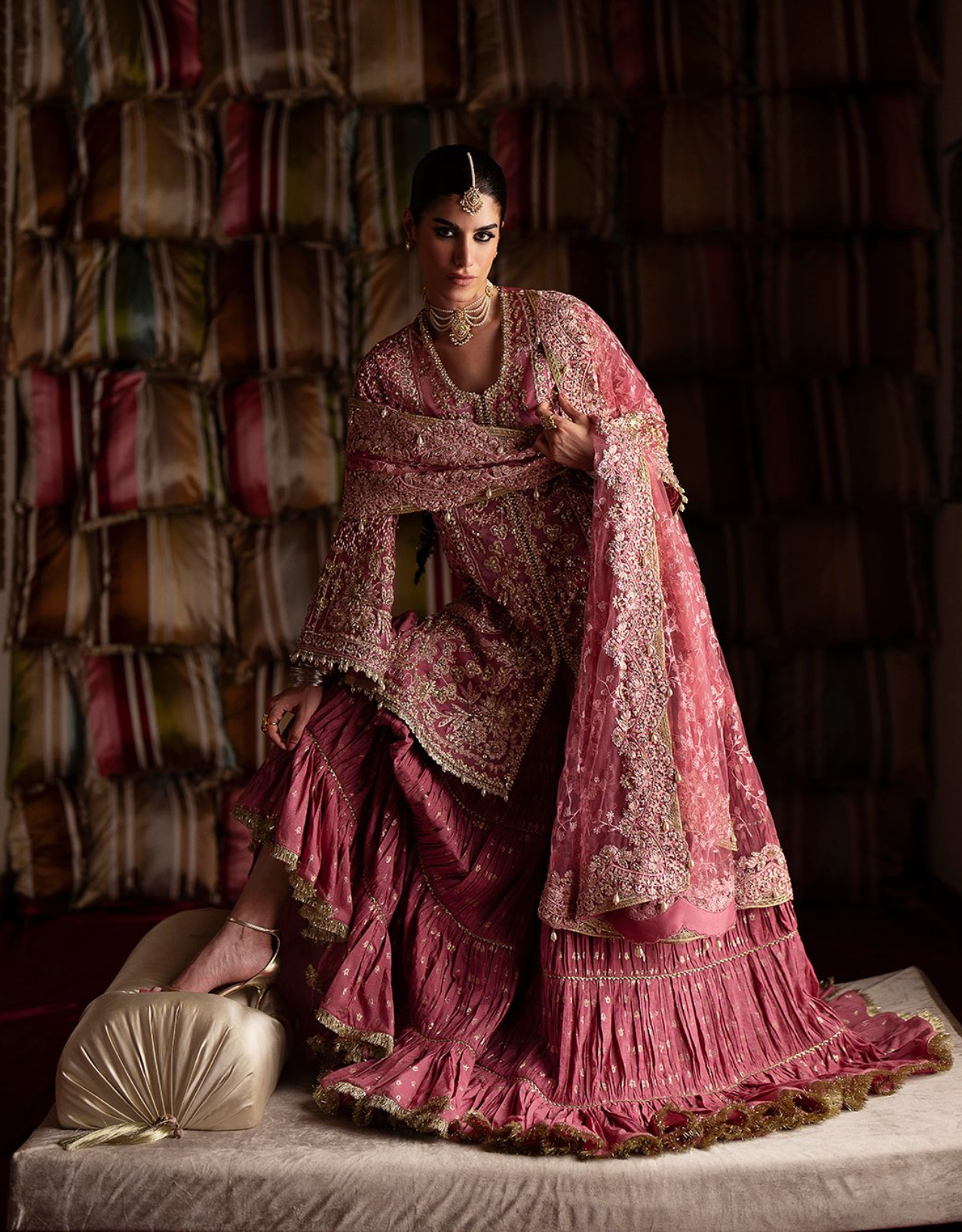 A dreamy candy pink short shirt adorned with intricate embroidery and delicate handwork, paired with elegant pleated gharara pants. The look is completed with a statement full heavy dupatta, creating the perfect blend of charm and sophistication.