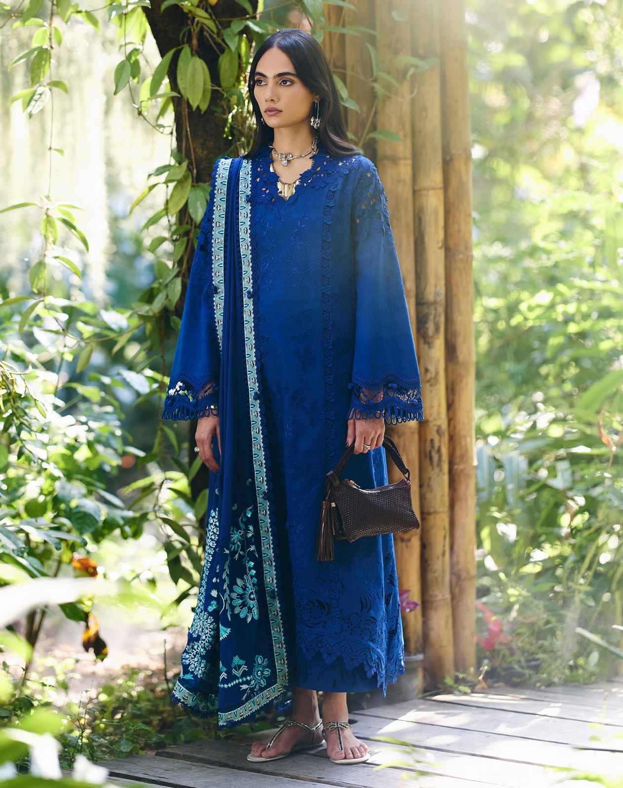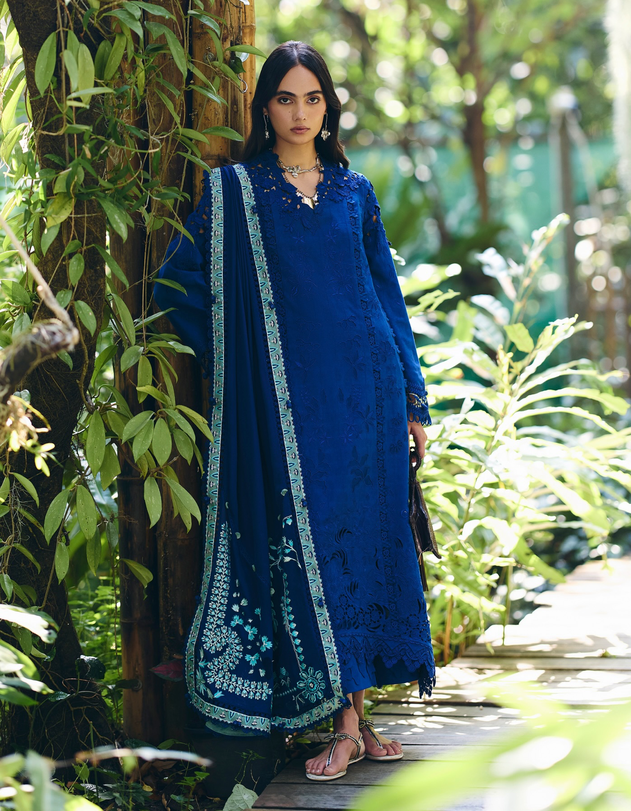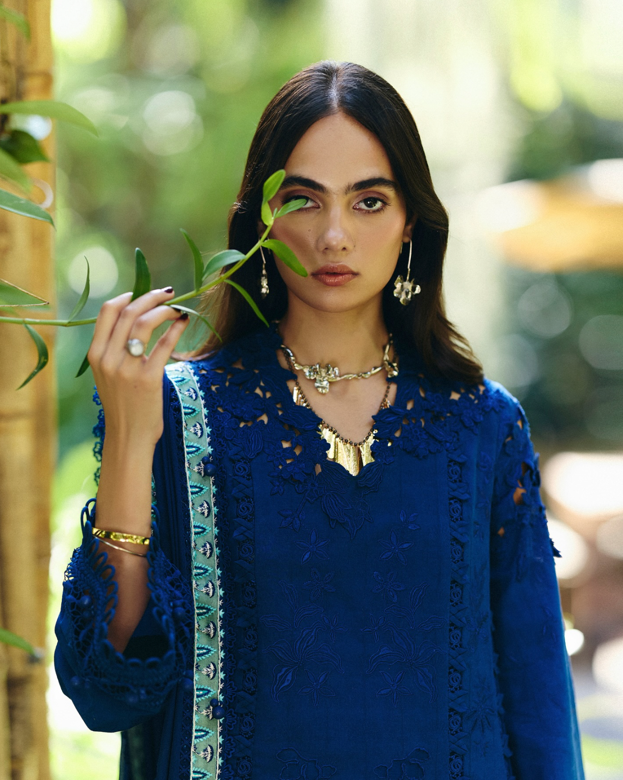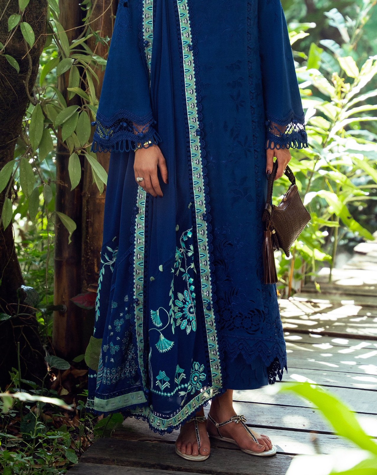 Capture the essence of spring renewal and Eid with this 3-piece Cobalt Blue look. The drop-corner lawn shirt is a statement of variance, featuring bell sleeves, delicate cutwork, and 3-D embroidery, perfectly paired with cotton cullottes and a chiffon dupatta blooming with spring florals and aqua accents.