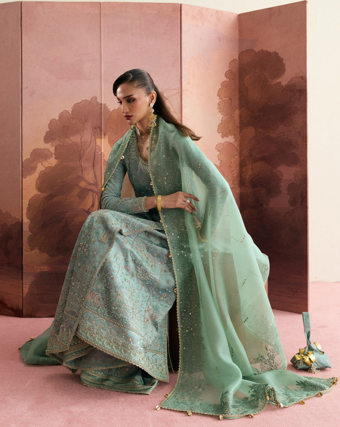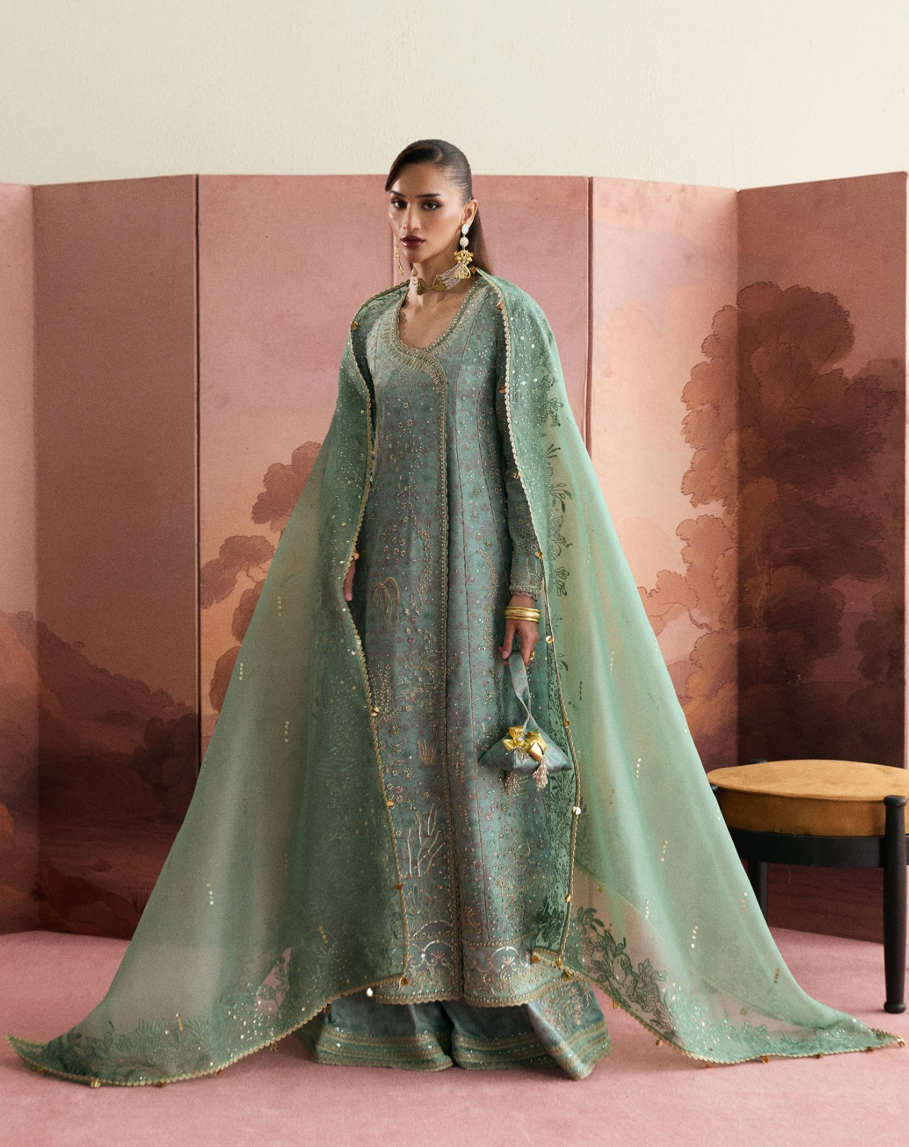 - Sage green organza with four-sided minimal leaf embroidery, sequin details, and a lace border.