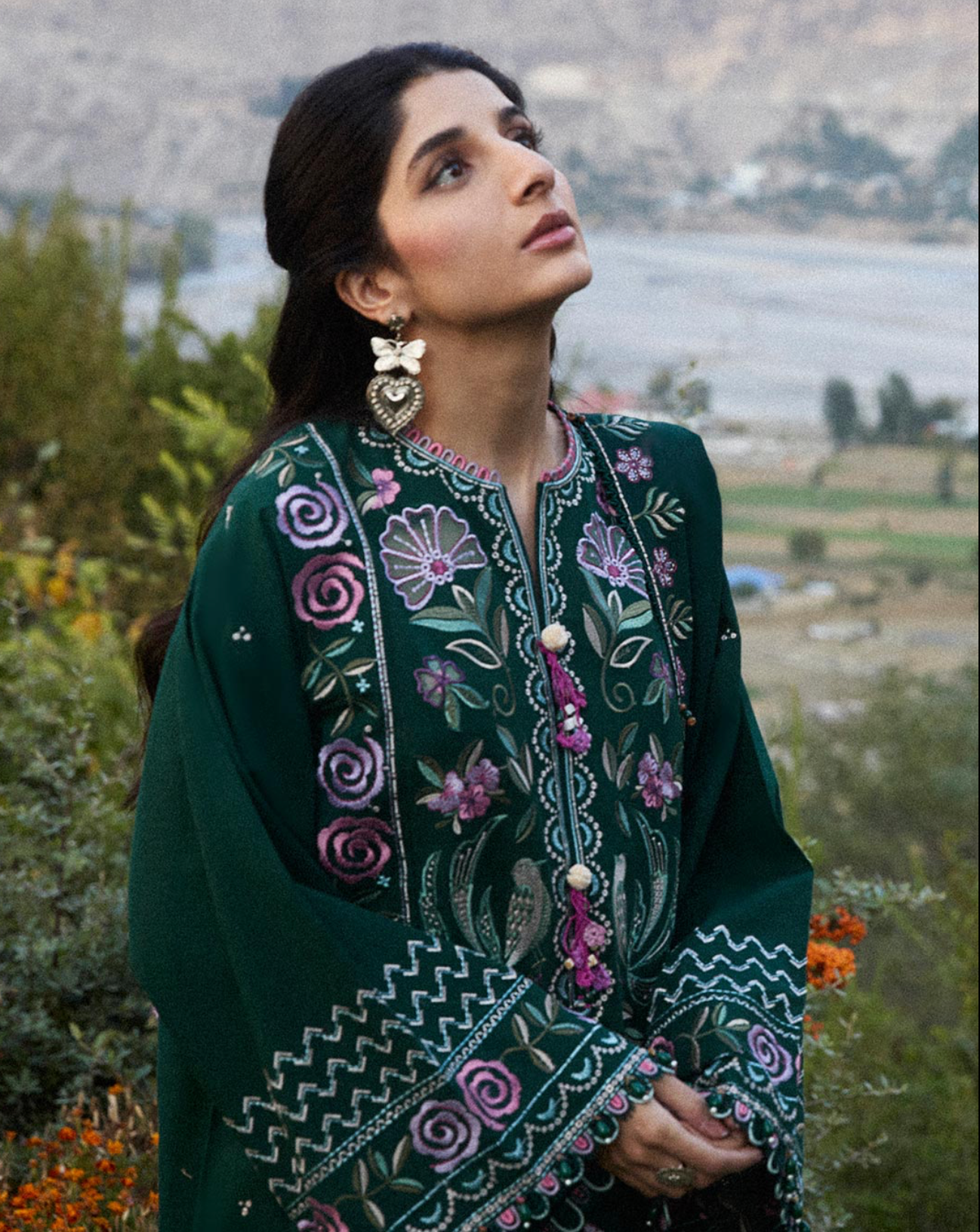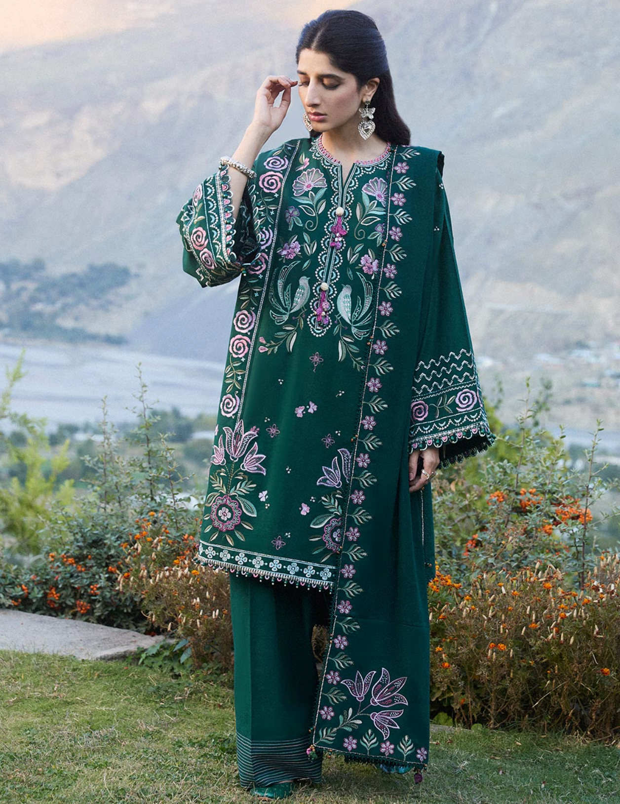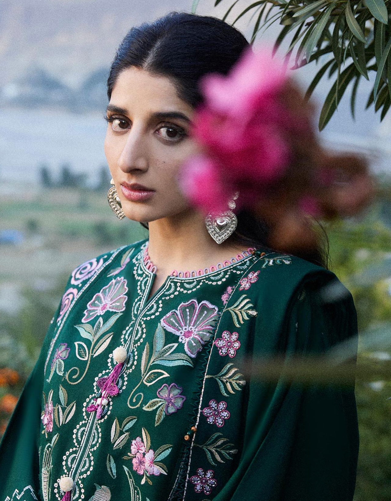 Introducing Zumar,an enchanting fusion of deep, opulent teal and the timeless artistry of tribal heritage, meticulously crafted for the winter season. This exquisite ensemble is fashioned from sumptuous khaddar, adorned with intricate ivory, berry, and moss embroidery that draws inspiration from the ancient motifs of tribal cultures. The bold geometric designs and delicately embroidered borders evoke a sense of rugged elegance, while the rich, wintery hues infuse the ensemble with warmth and depth. Paired with a luxurious karandi dupatta, Zumar effortlessly blends cultural richness with contemporary refinement, creating an ethereal, dreamlike allure. This masterpiece strikes the perfect balance between timeless tradition and the sophisticated elegance of the Zaha woman, enveloping the wearer in both comfort and unparalleled luxury for the colder months.