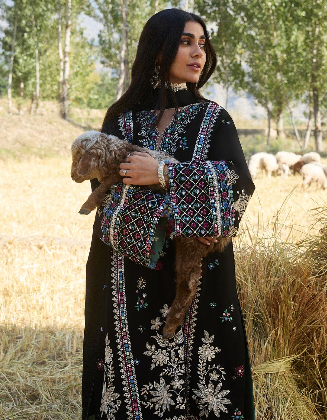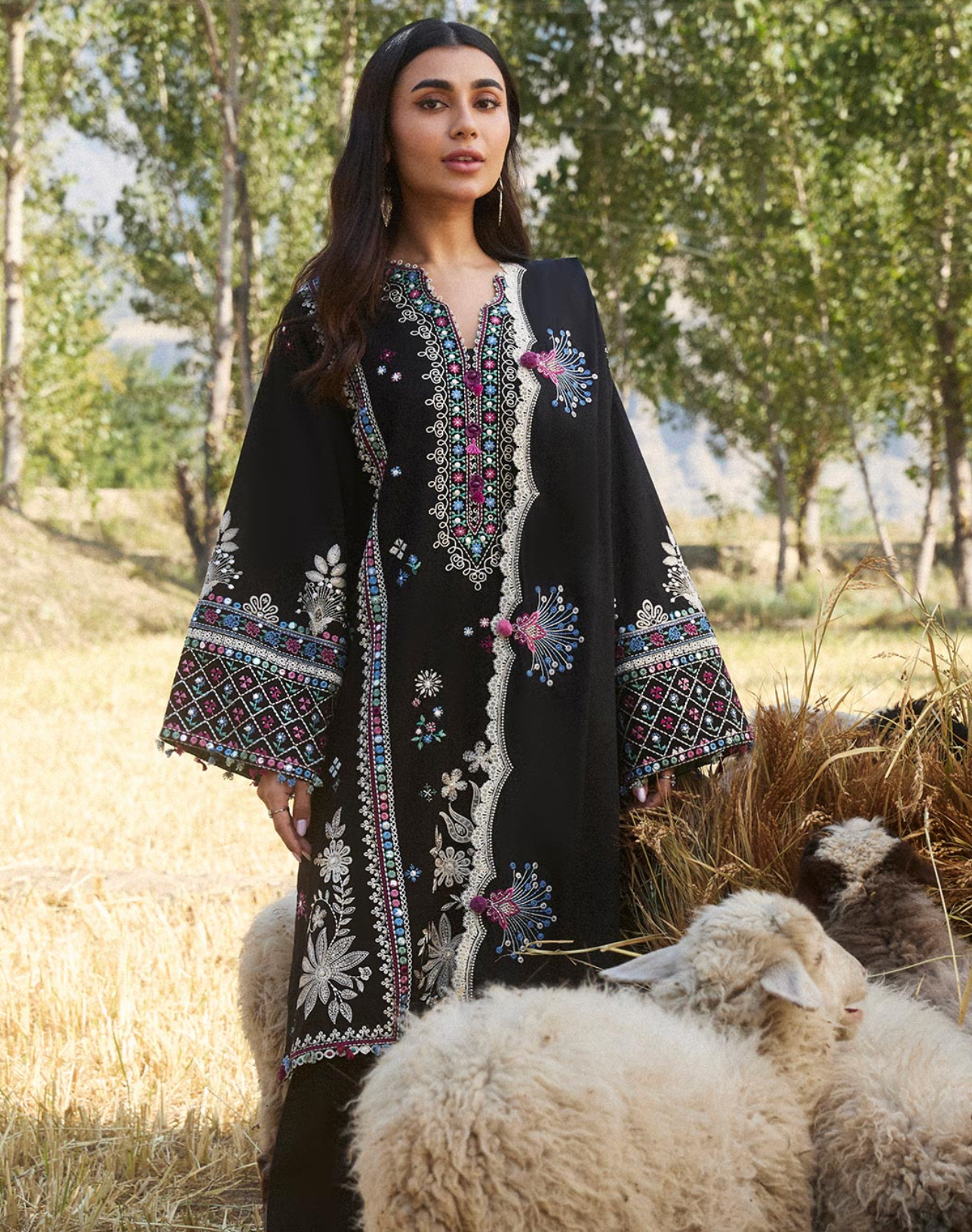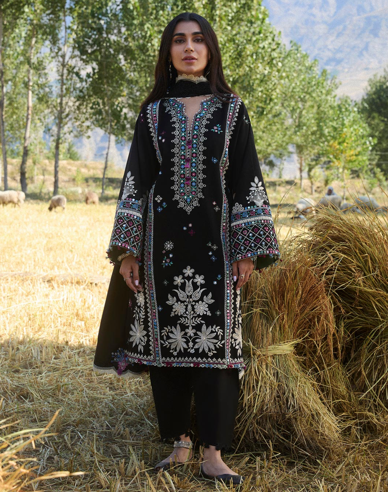Hazan’ is a winter’s day captured in an ethereal embrace, where the smoldering ebony hue meets the gentle caress of winter sunlight. The intricate florals, embroidered with ivory, rich plum, azure, moss, and sage, shimmer as the sun’s rays filter through, casting a soft, golden glow across the design. Each stitch of marori tribal embroidery and delicate pani work tells a story of heritage, unfolding like the first light of dawn on a crisp winter morning. The sunlight dances across the fabric, highlighting the detailed patterns with a soft, dreamy glow that feels like a winter fairy tale. The beautiful embroidered sleeves, delicately adorned with the intricate ethnic motifs, add a refined touch of artistry, as if the fabric itself tells a story. Complemented by a tonal karandi shawl, its borders embroidered to perfection, Hazan radiates an otherworldly charm—elegant, serene, and beautifully grounded in the magic of winter’s light.