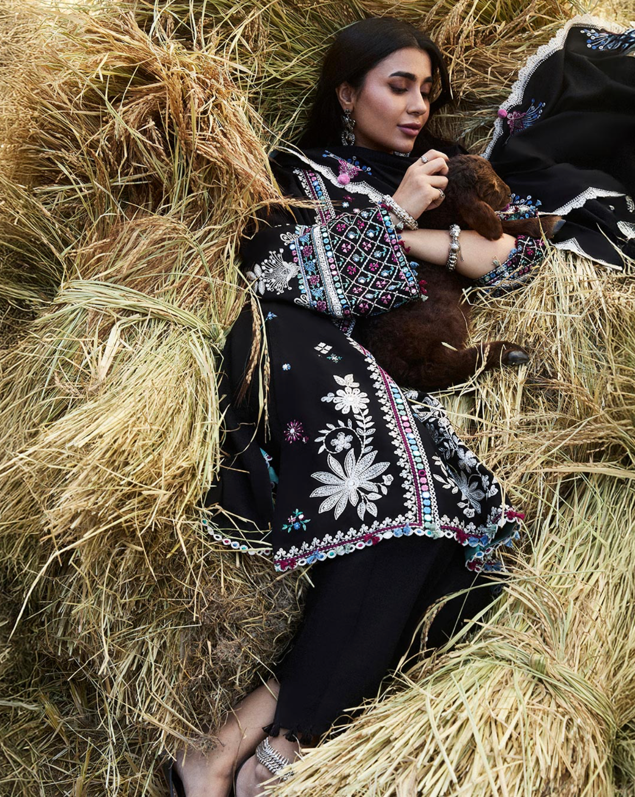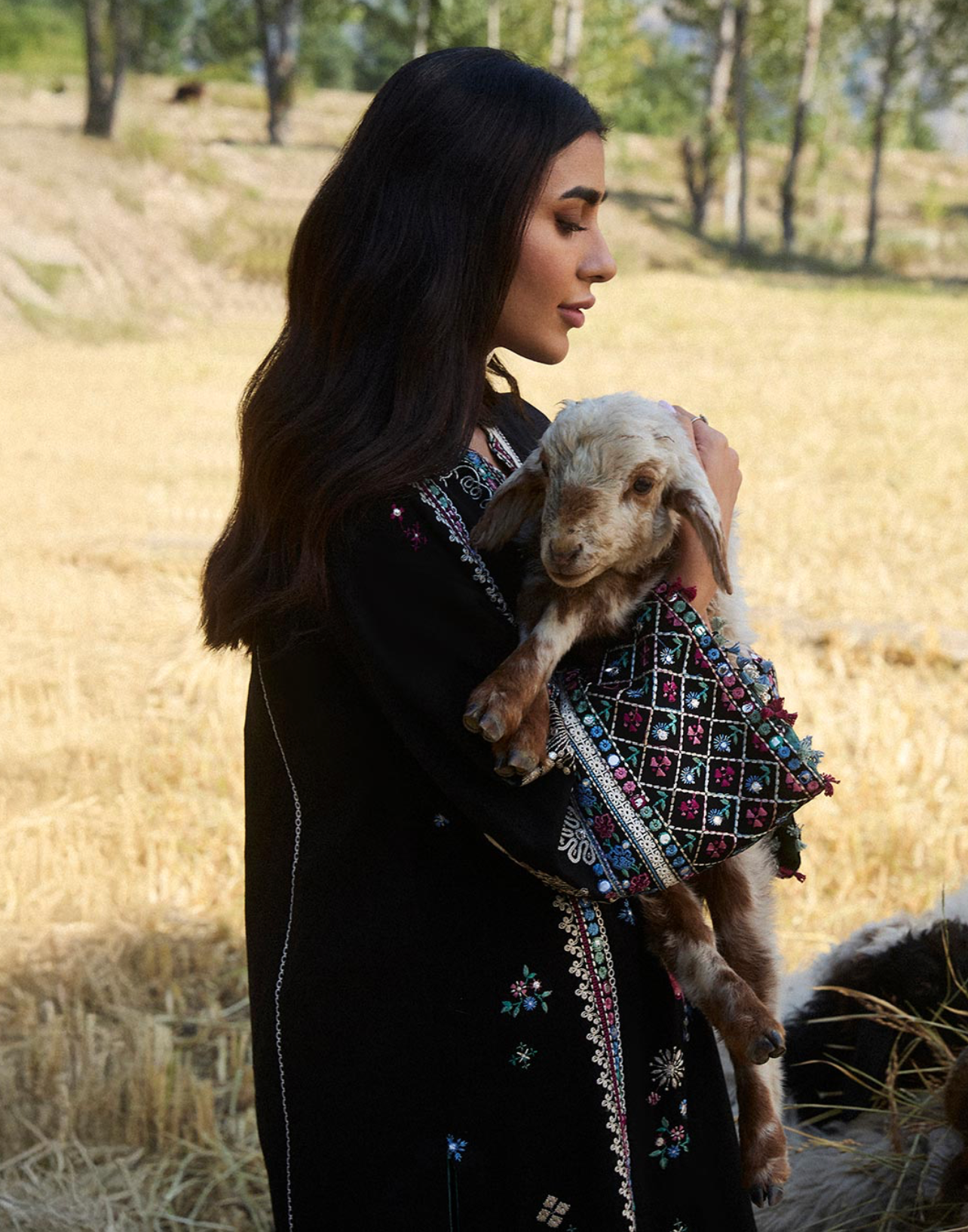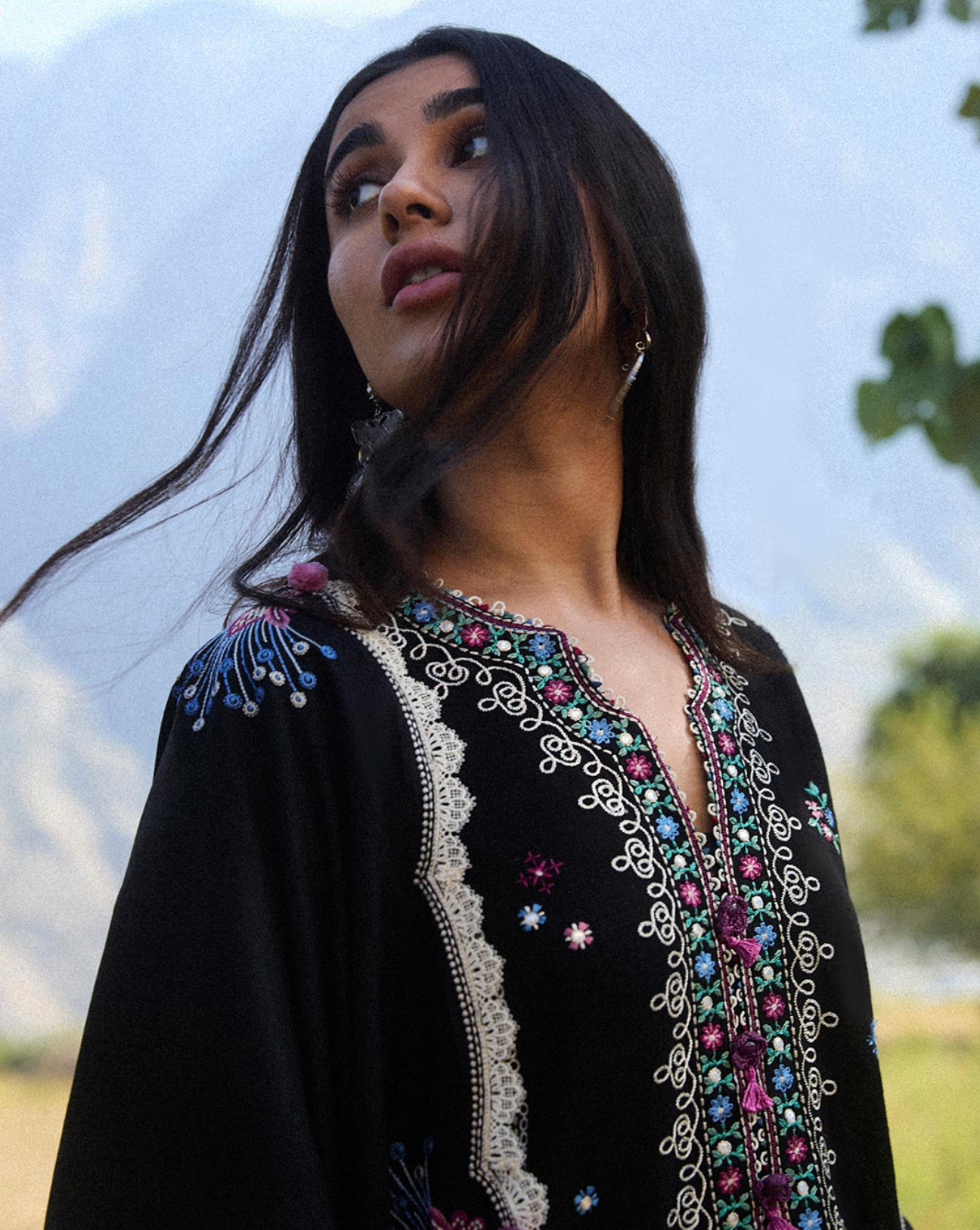 Hazan’ is a winter’s day captured in an ethereal embrace, where the smoldering ebony hue meets the gentle caress of winter sunlight. The intricate florals, embroidered with ivory, rich plum, azure, moss, and sage, shimmer as the sun’s rays filter through, casting a soft, golden glow across the design. Each stitch of marori tribal embroidery and delicate pani work tells a story of heritage, unfolding like the first light of dawn on a crisp winter morning. The sunlight dances across the fabric, highlighting the detailed patterns with a soft, dreamy glow that feels like a winter fairy tale. The beautiful embroidered sleeves, delicately adorned with the intricate ethnic motifs, add a refined touch of artistry, as if the fabric itself tells a story. Complemented by a tonal karandi shawl, its borders embroidered to perfection, Hazan radiates an otherworldly charm—elegant, serene, and beautifully grounded in the magic of winter’s light.