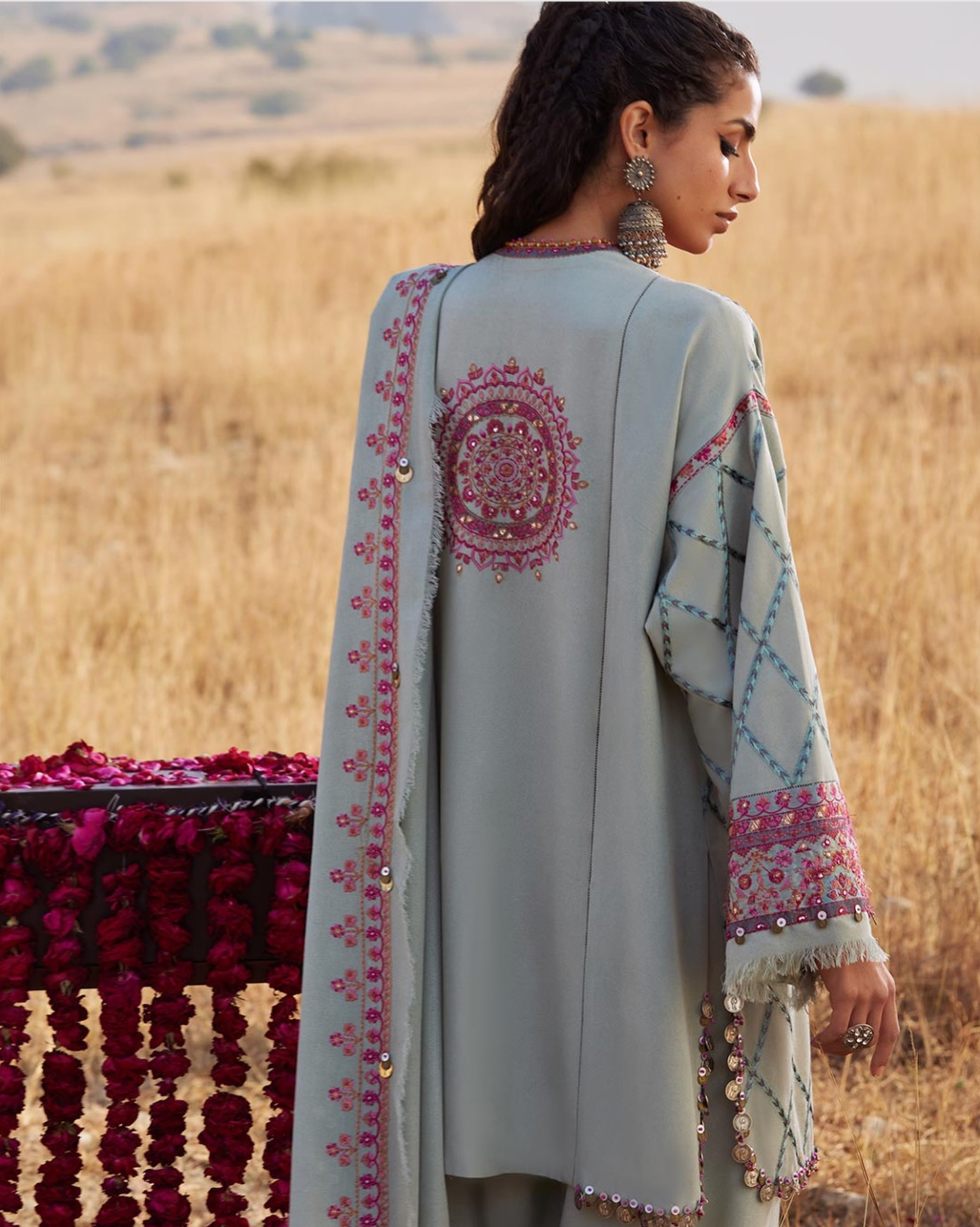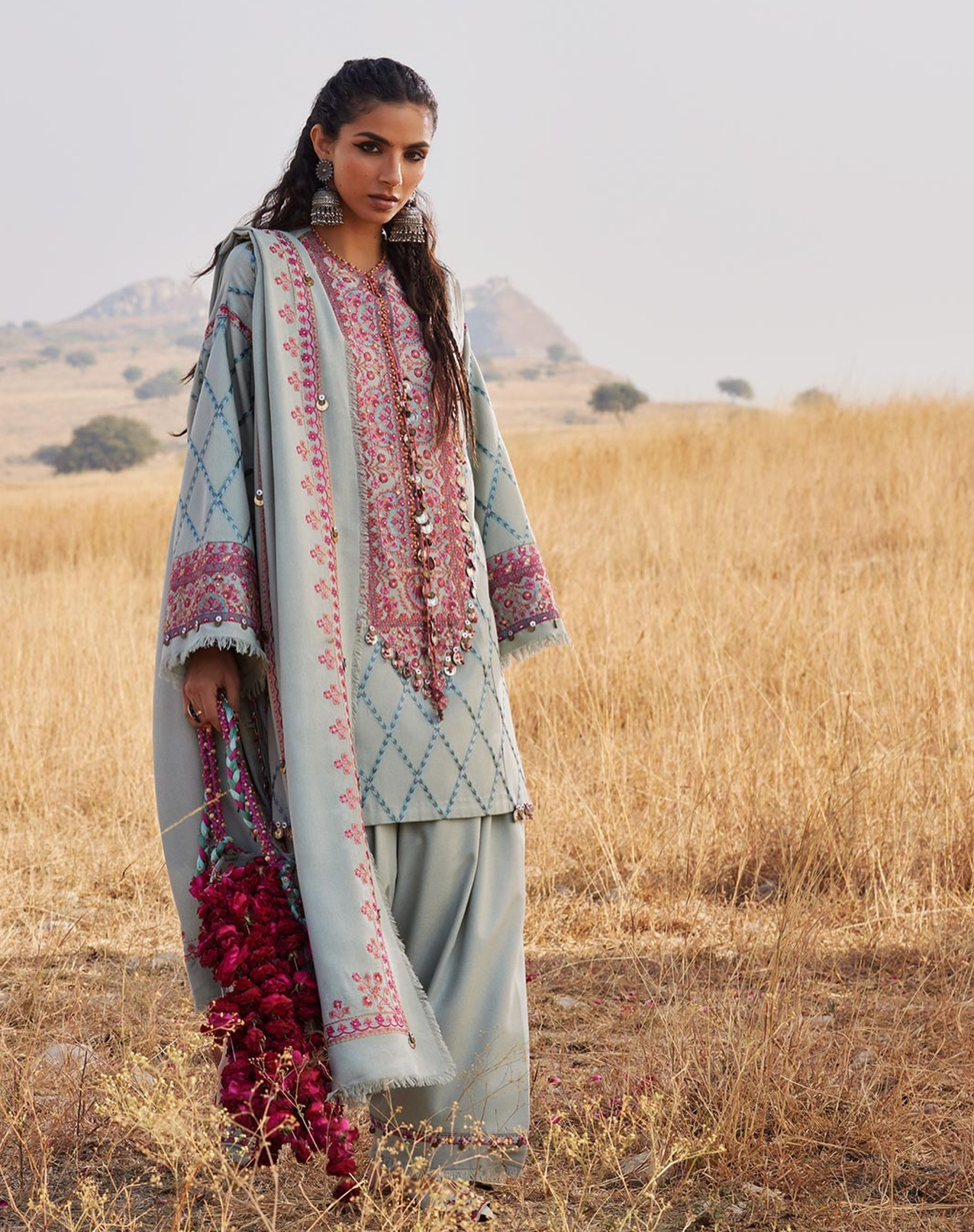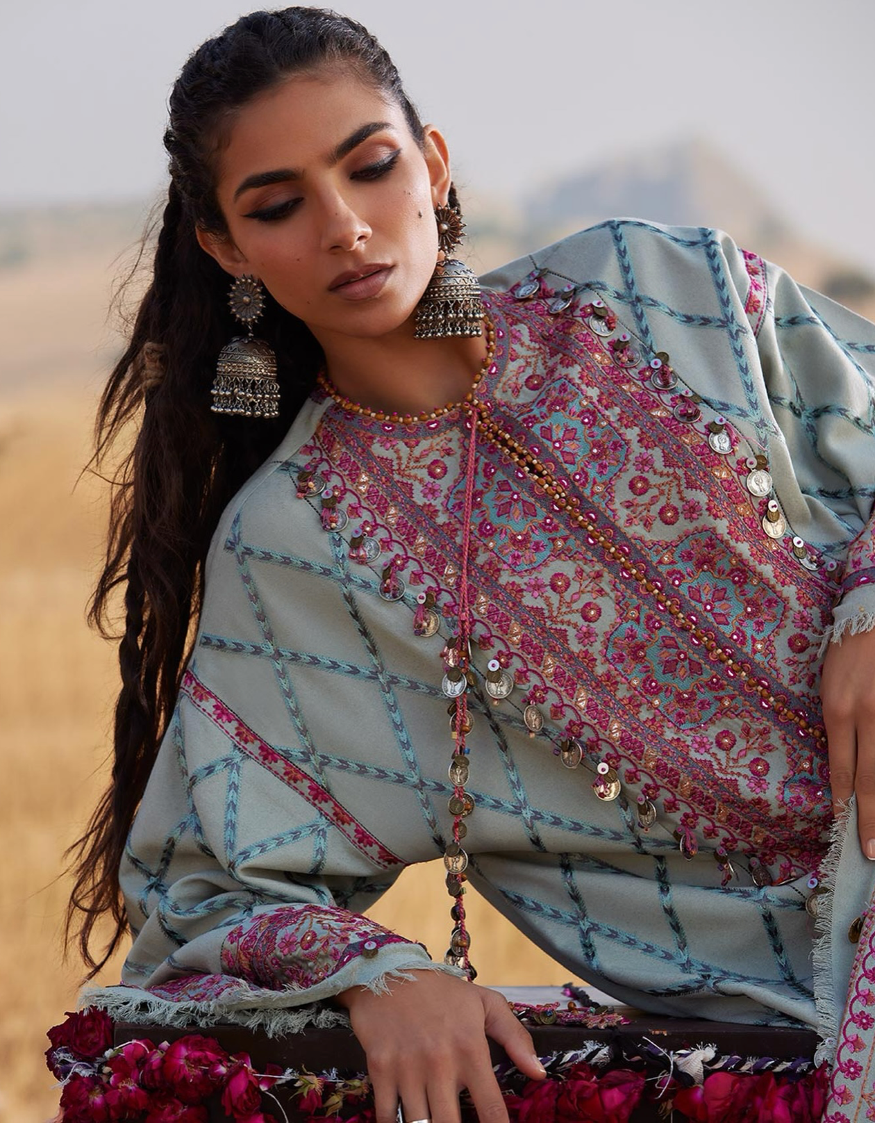 The matching dupatta complements the shirt with ethereal grace, featuring delicate textures and motifs that evoke winter’s quiet poetry. Together, they create a look that is effortlessly moody, tribal, and unapologetically free.